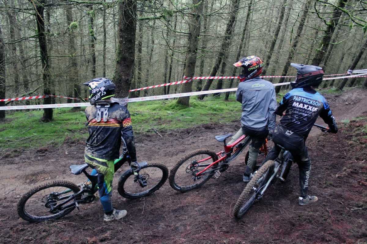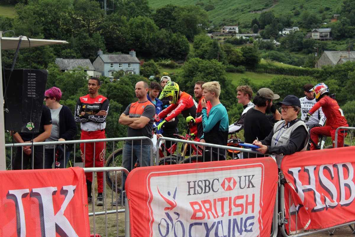 Riders and team managers check the times in seeding Luke Williamson rode the wheels off his Propain 1st Junior Men Kyle Hall takes the high line opening up the tight right, seeding 32nd he had sit out the race due to a back injury