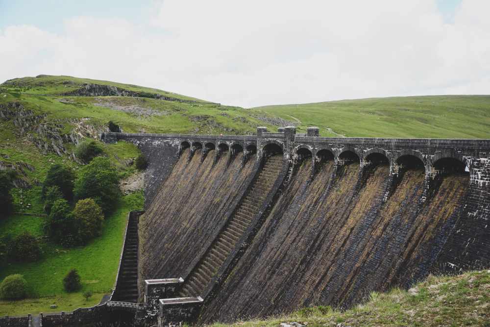 Following another steep climb up a paved road, I turned right onto a gravel bridleway and pushed on towards the top of the hill. My map told me the distance to the top was short, but the close gradient lines suggested I was in for a tough one! Summiting with a view of the Caban-coch reservoir to the south, I sat down next to some sheep and looked at my watch. It had just gone 9.00am. The flask of tea I’d brewed earlier in the car park should be just the right temperature, so I unwrapped a scotch egg and sipped my tea. I’d already been on my bike for longer than any of my normal trail centre rides, and I had around six hours left! I screwed the lid back onto my thermos flask and set off down another fast, grassy hillside, crossing fords and dodging sheep until the angle of the trail mellowed and the dry grassy surface gave way to a rocky 4×4 road. This road would prove a challenging ascent to the Claerwen Dam and reservoir – a long and low stony path winding its way adjacent to a wide stream, peppered by sections where the water had burst its bank and filled the sunken road. The climb involved multiple stream crossings, where water channels were often two or three feet deep and six feet across. I’d carefully topple my bike to the other side and then haul myself after it. There’s still something childishly satisfying about jumping streams, calculating taking-off points verses speed of approach, two feet just making contact with the slippery grass on the other side!