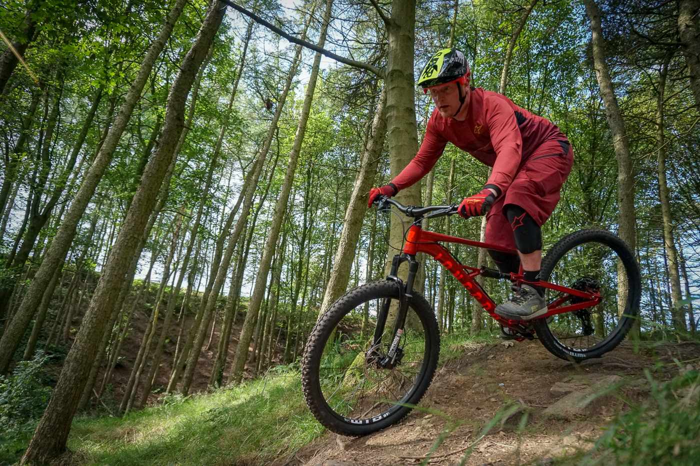 The specification is spot on for riding in the woods, and playing at the bike park. SRAM Level T brakes are surprisingly good, the 1 x 12 Eagle drivetrain has plenty of range for climbing, and the suspension is very good for flowy, fun, jump lines.