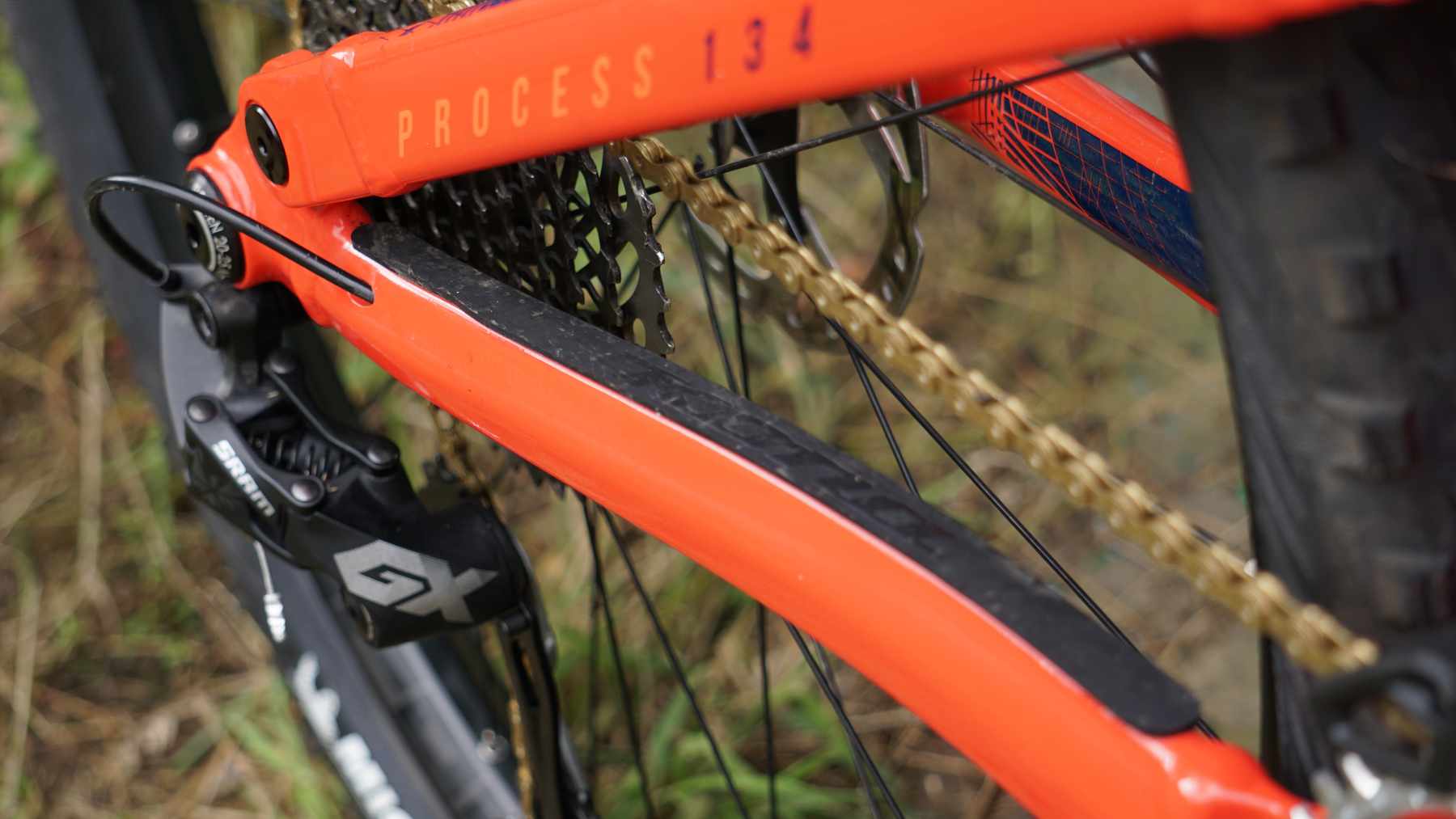 Scott’s bike started life as a Process 134 DL 29 model, and while he’s changed a lot of components from stock, the drivetrain has remained the same with a SRAM NX Eagle 12 speed shifter coupled to a GX Eagle rear mech and 11-50 tooth cassette. One drivetrain upgrade Scott has made is the addition of a gold chain though, because, well… it’s gold!