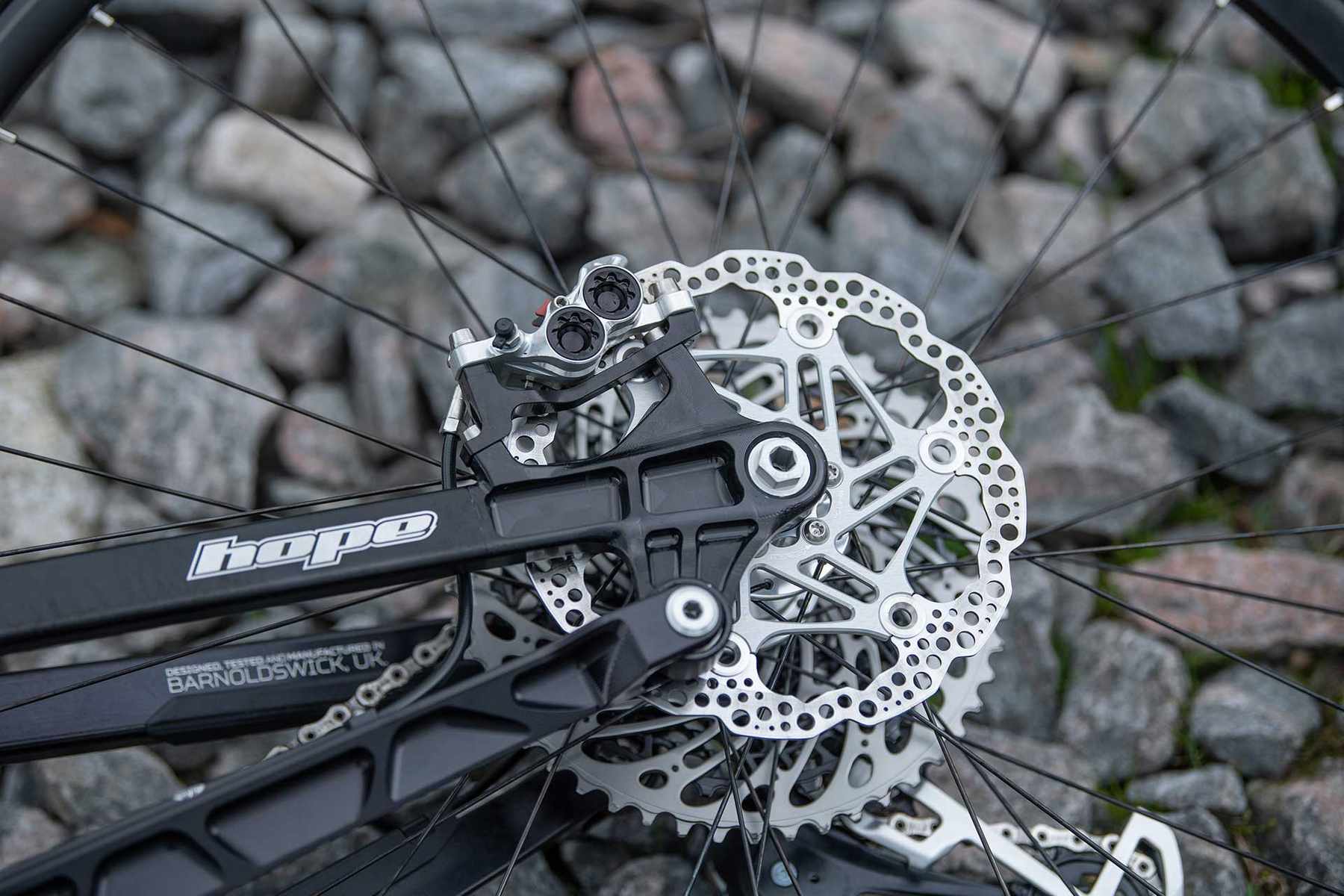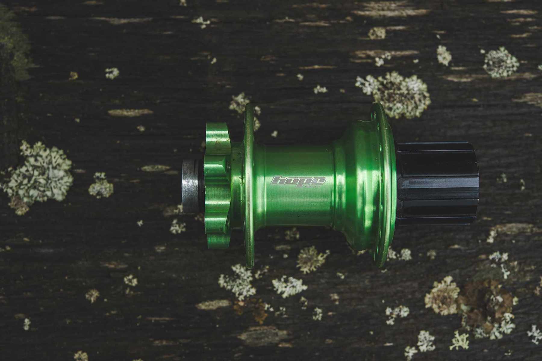However, it wouldn’t be a Hope bike without a few foibles. First off, the bottom bracket. It’s threaded and carries a Hope BB for 30mm spindles, any other 30mm crankset will certainly fit, but not your 24mm crankset. Not yet. The rear hub is also specific to the frame. While the crankset is Boost spaced, this spacing is only on the drive side, the entire rear end is narrow from the rear and effectively 142mm wide with the extra spacing on the non-drive side being ditched. So yes, a proprietary Hope hub, but I for one don’t see that as a downside from a company who make some of the best hubs in the world. It mounts much in the same way a motorcycle rear hub does, something I’m still not sure why we’ve not adopted in the MTB world. It just works. Also, no SuperBoost to be seen.