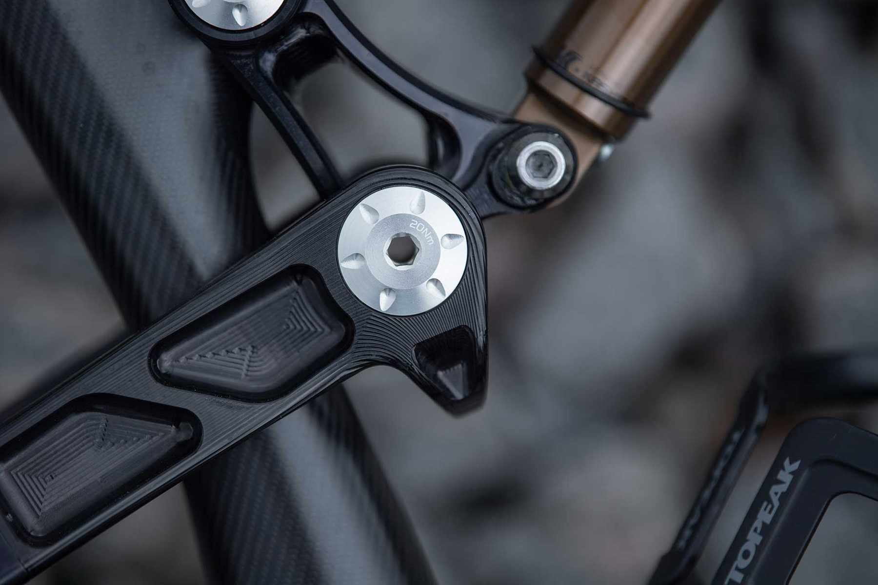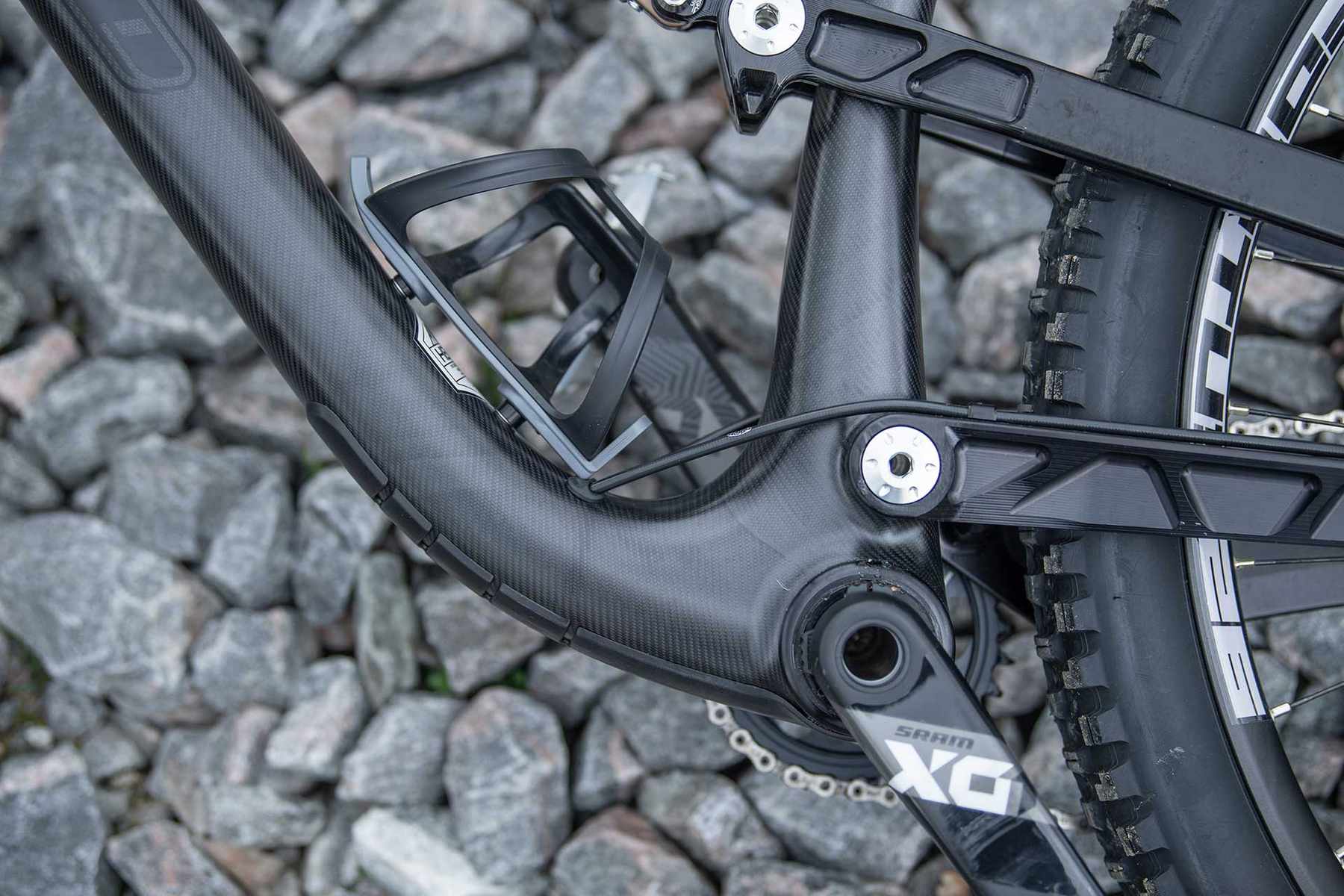 A 142mm hub is tucked in towards the drive side to give a narrow back end, but with Boost benefits Neat machining and neat carbon. Neat! Simon Sharp is remembered well…