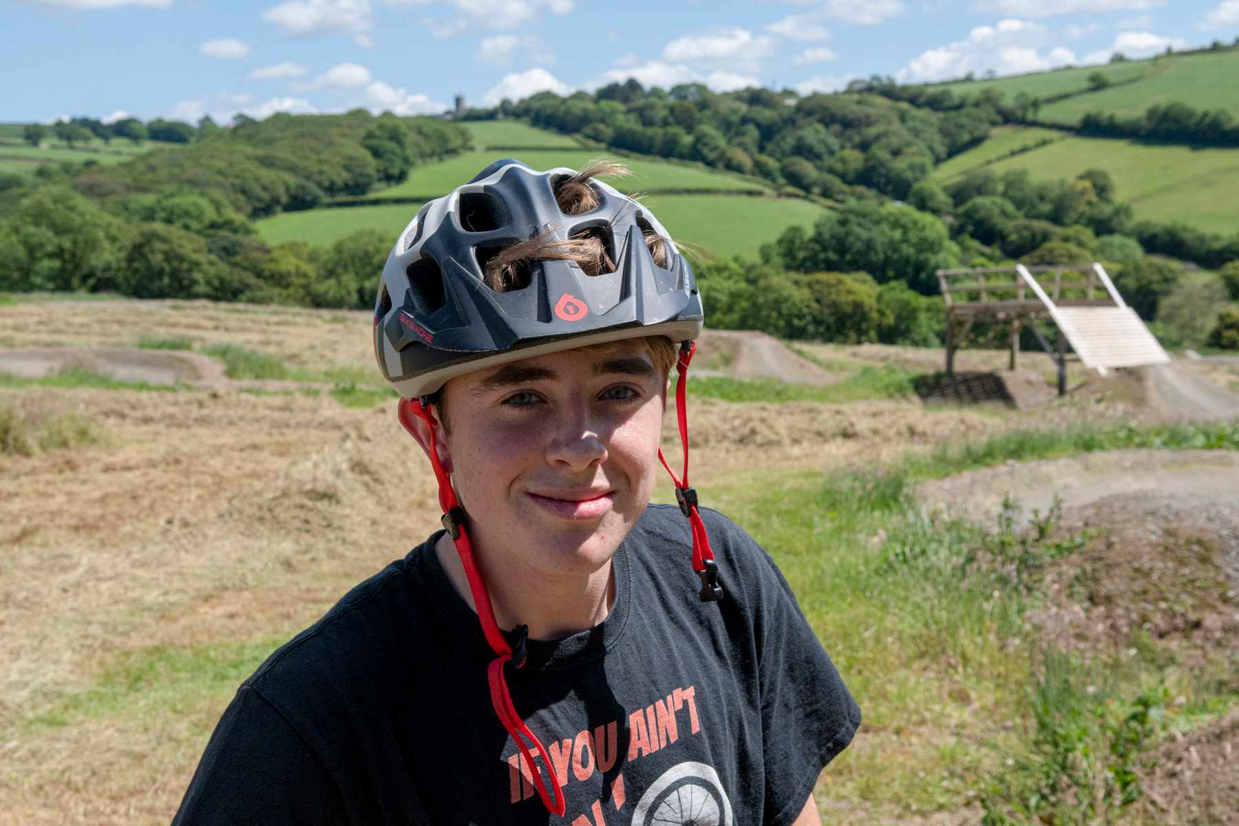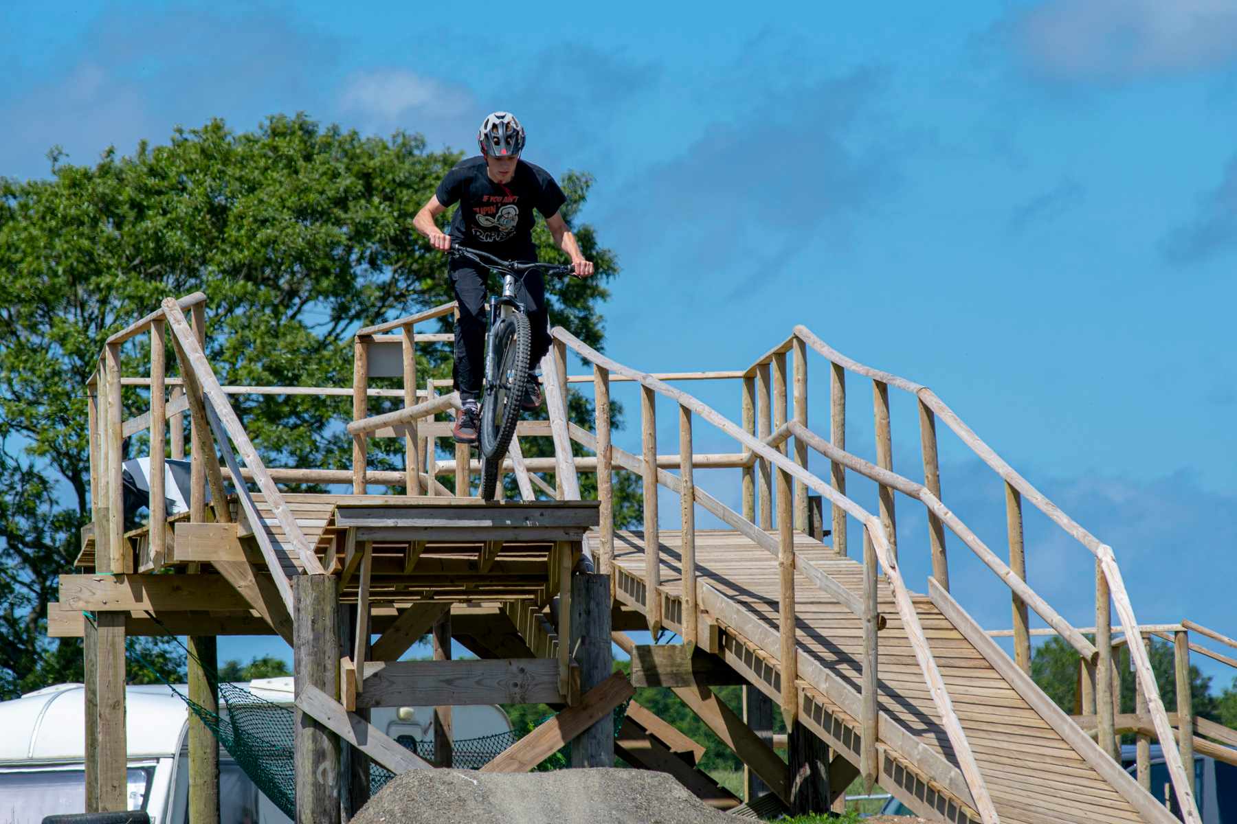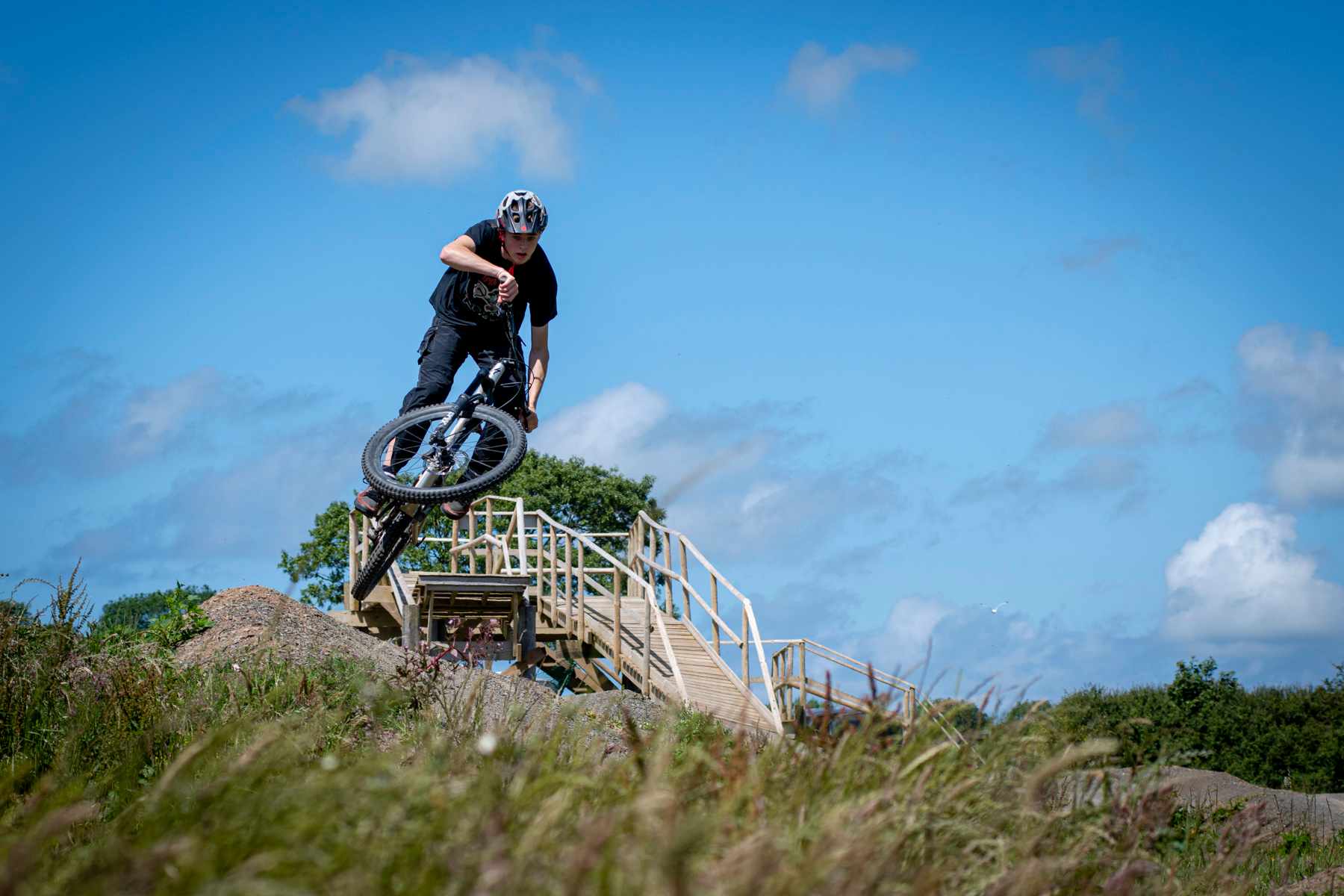 It’s far from alone, these days. Old Hill Bike Park, a half-hour drive away, opened in September 2018. In contrast to Woody’s uplifts, it’s a pushup-only park in a field, with lines designed by the same Jasper Flashman who created Woody’s. The slope is less severe, for sure, and so the speeds aren’t as high, but owner Johnny Brown’s son Jasper showed me that there’s plenty of air on offer as he launched off the wooden structure that serves as the start for the trails. (I’m sure this has an official name; I’ve got no idea what it is). There are plenty of rollable trails for youngsters, and plenty of more hefty ones for the slightly more fearless.