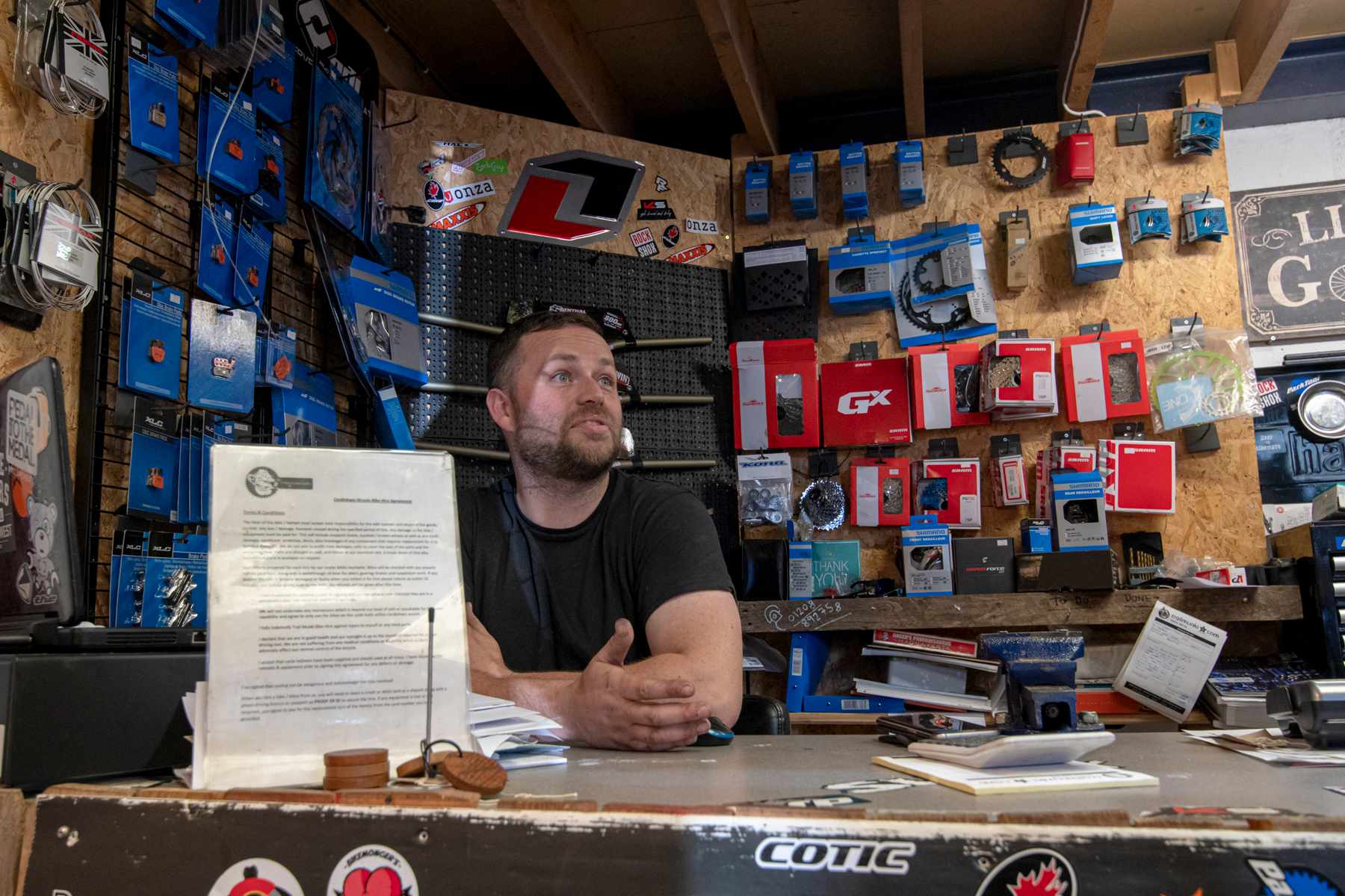 Woody’s opened in 2017, and is managed by owner Jon Wood’s brother, Patrick – a man of substance and limitless charm – with a background in the Midlands and customer service. He regales me with stories of idyllic evening barbecues at the bottom of the Valley of the Bones (where the best jumps are), the origin of the ‘Bones thing’ (it’s to do with soldiers hundreds of years ago), whether e-bikes are welcome (they are) and a host of other tales and joshings with a couple of regulars – Will Williams from FullyGassed apparel, and local ne’er-do-well Mawgan Pownall.