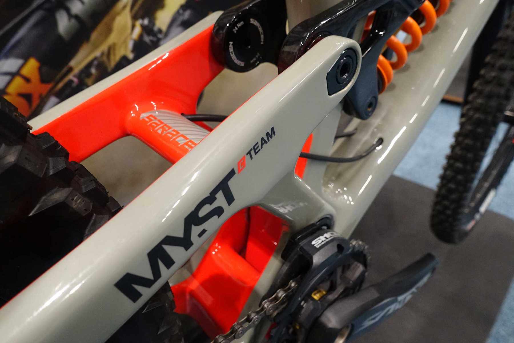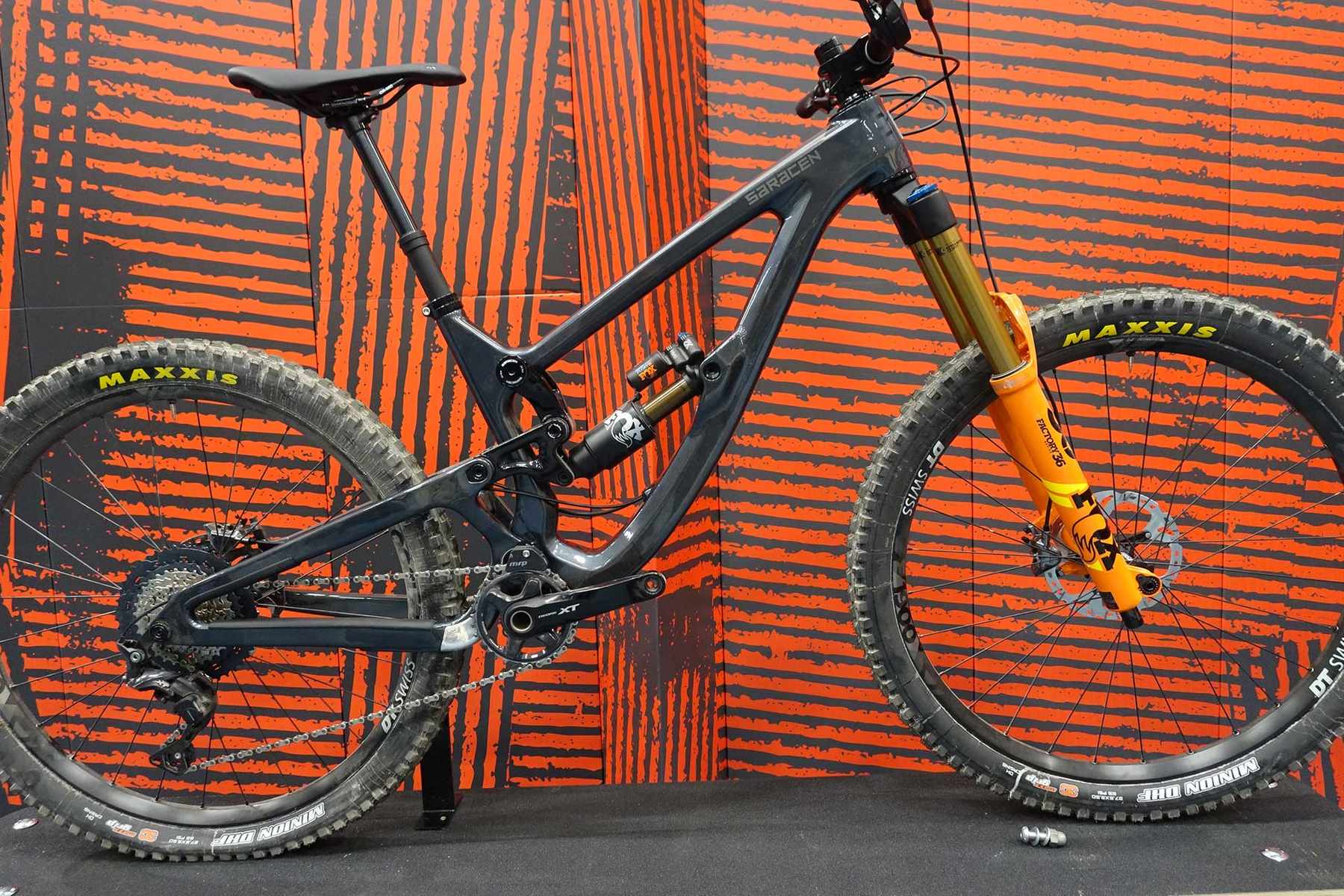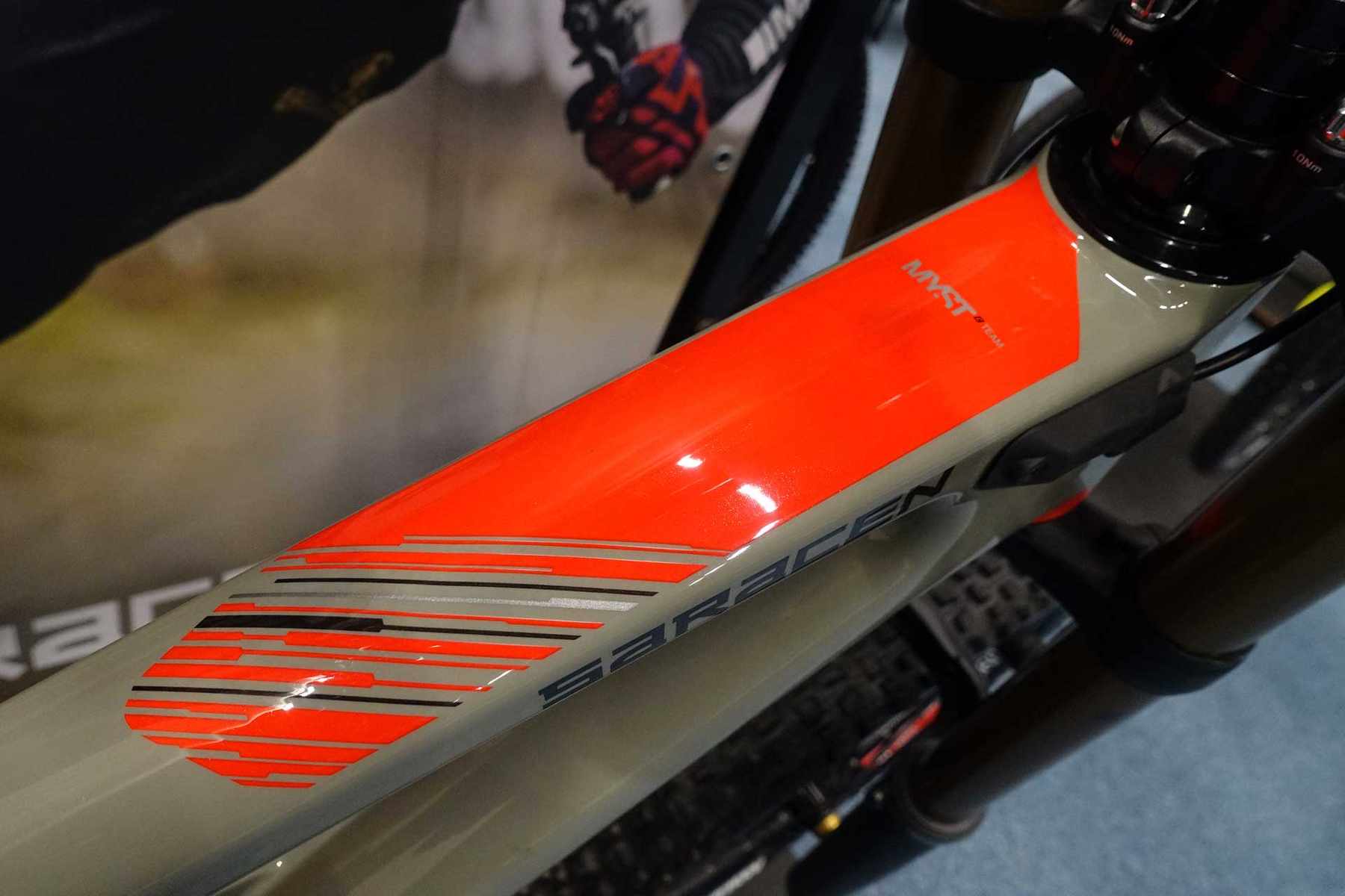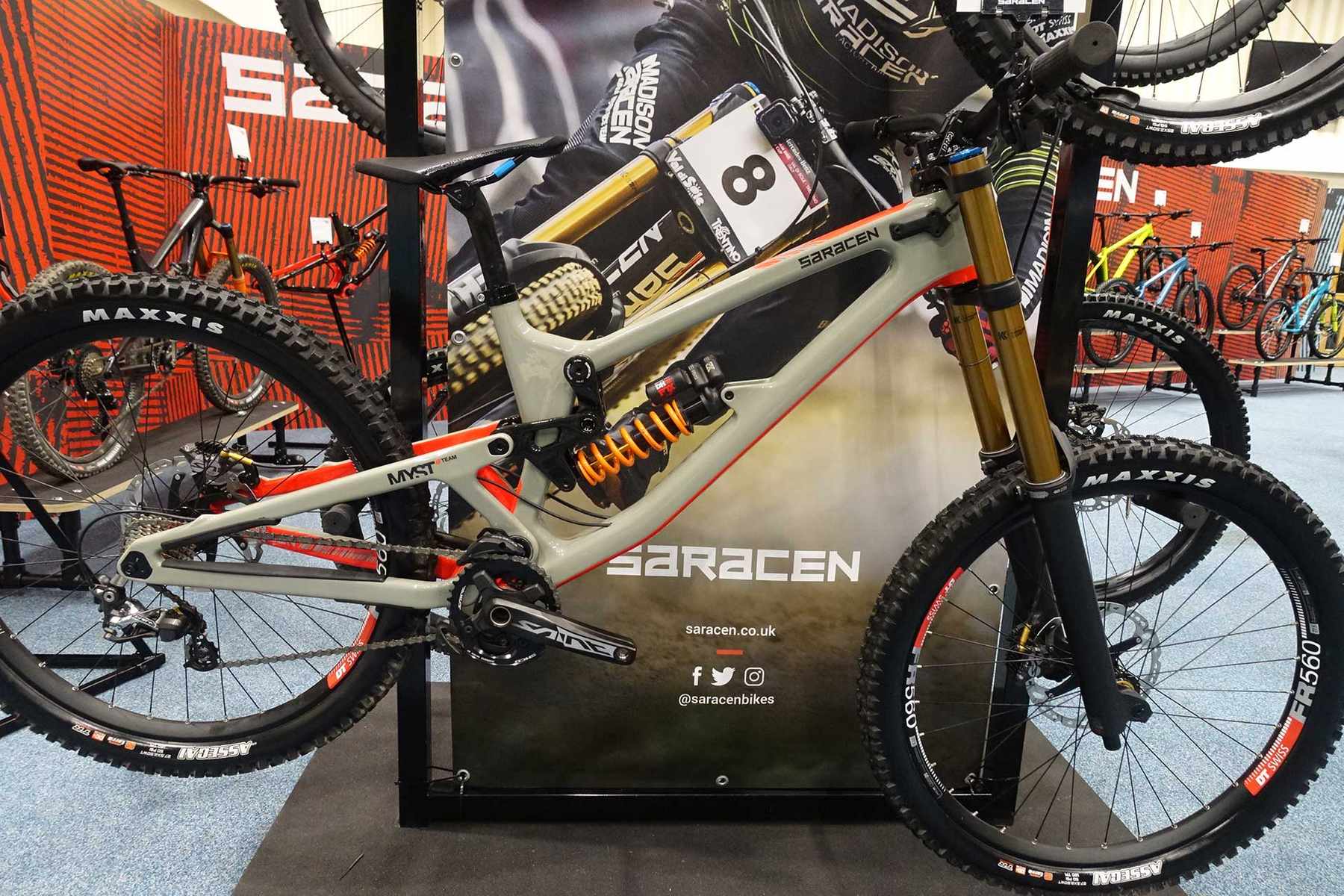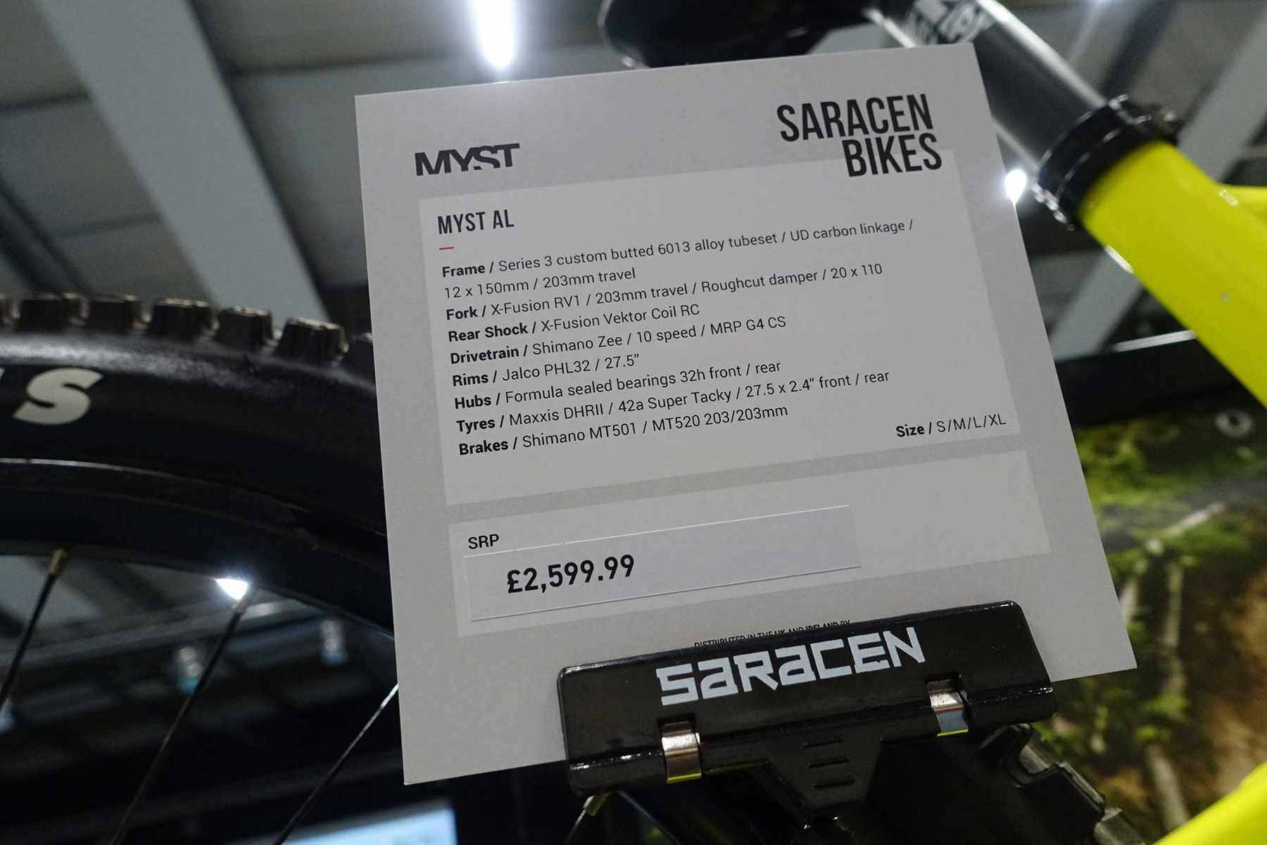 While we’re looking at the big travel bikes from the Sportline Show, it’d make sense to cover the Myst. It’s possible to buy the Myst Team bike in both 27.5 and 29in wheeled versions and access the same frame that the Madison/Saracen race team riders race on. Both bikes come ready to race for £5799…