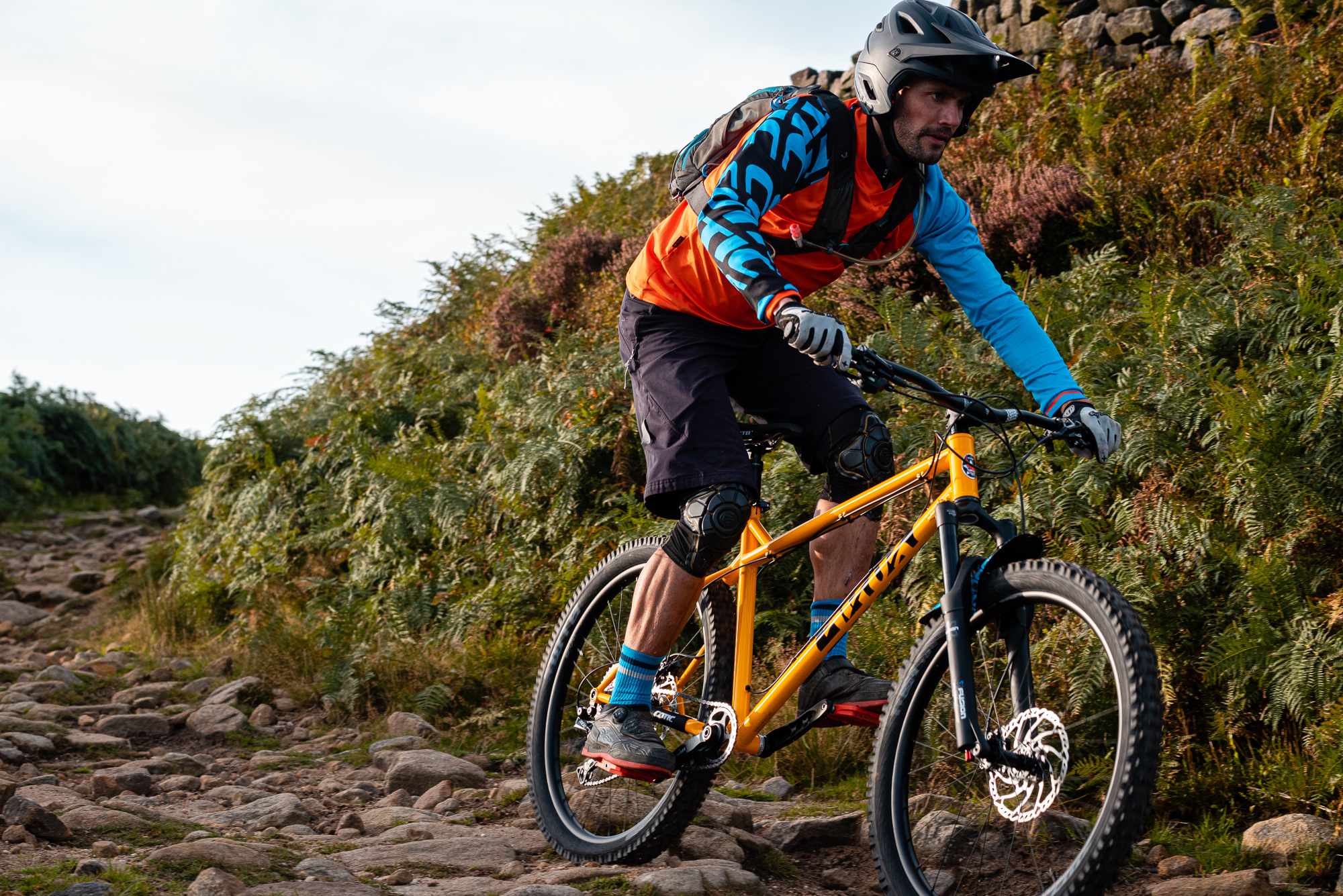 Pointed downhill, and the BFe doesn’t like hang about. I was a little hesitant to push it too hard because of that lighter rear tyre, but once the speed picks up you can really feel the bike start to skip along, skimming the tops of the rocks and encouraging you to pump the slightest rise and fall on the ground like all good hardtails should. If you happen to get it wrong and slam that rear wheel into the ground, there is no getting away from the fact that it’s a tougher frame than the Soul, and thusly more of that force is transmitted through to your legs, but the payoff is that you are highly unlikely to damage the frame no matter what you throw at it.