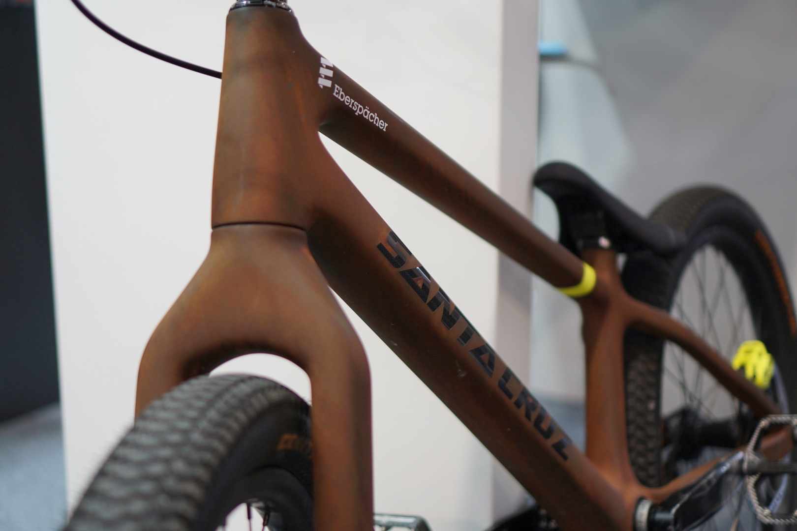Danny MacAskill was at Eurobike with the rest of the Drop and Roll team, and Danny was on a new / old Santa Cruz trials bike. The frame looks similar to the custom carbon bike Santa Cruz put together for Danny last year, but it has a faux rust finish on it.