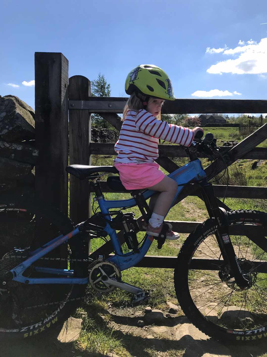 Family riding hasn’t really been something we’ve done, we’ve tended to just carry on with our own riding and encouraged the girls onto their bikes separately. Our first family riding setup was a WeeRide, which was fine for my 6ft partner Nathan, but useless for 5ft3in me with my small bikes. The seat just doesn’t fit due to the lack of top tube space between the rider and the bars to fit a child and seat. I did have a go at trying to trying to make the WeeRide work for me, this resulted in a comedy ride with friends, me on a borrowed bike, slightly too big for me, but able to accommodate the WeeRide and toddler on board. Every time we stopped, I needed assistance in the shape of the handily placed seawall on the Blackpool promenade, or a couple of friends holding arms out to catch me, the bike and the small girl!