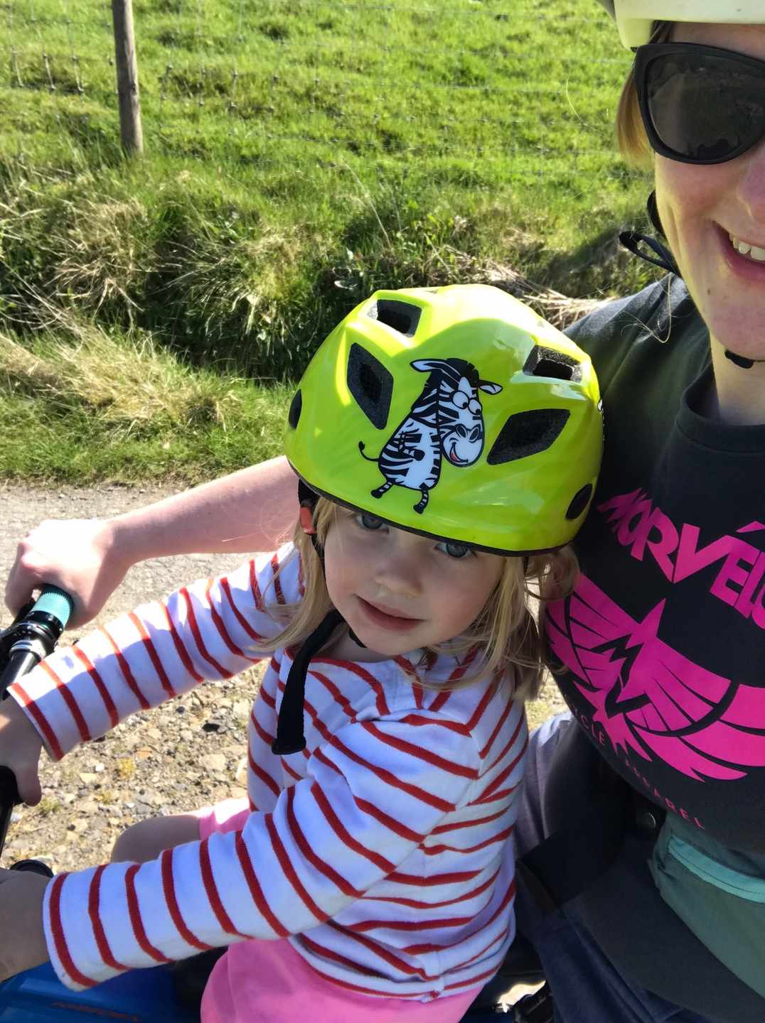 It feels a bit odd with a passenger on my bike – used to zipping up and down things on my own, it feels slightly unwieldy and strange, the weight more than the steering. Also, pedalling requires a bit of adjustment, slightly knees out – much easier if you are a flat pedal rider, which I’m not, but it would be far more practical in these situations to be one. Slowing the pace down and chatting to my small passenger made me relax and enjoy it. Freya didn’t flinch when we starting descending gently towards our snack stop. After the snack stop, a small push to the summit of our ride and it was downhill all the way to home on a roughly surfaced bridleway, Freya giggled and shouted all the way back to the road, and on to home clearly enjoying the downhill.