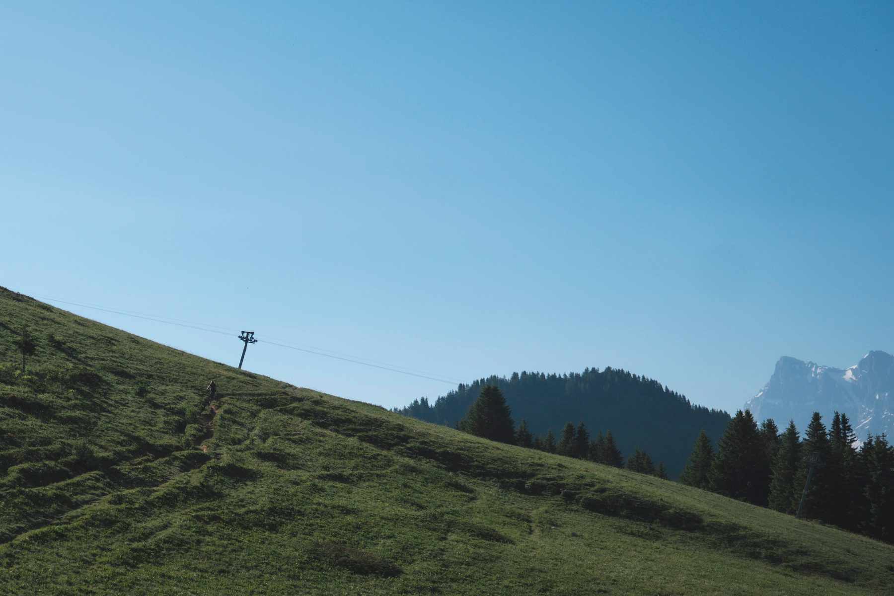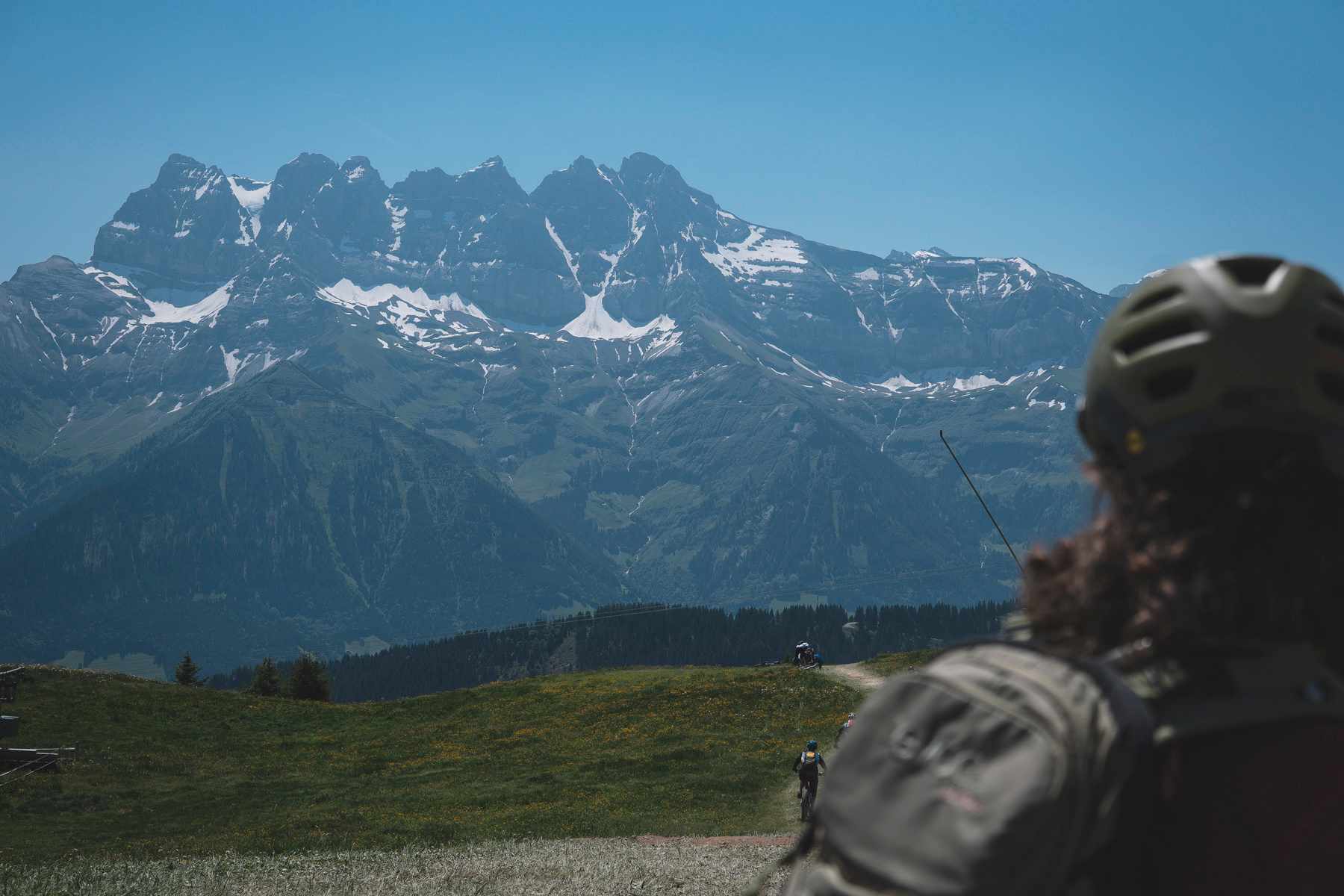 Hitting the trail back towards Châtel we encountered a poor lad who had succumbed to a drainage ditch and bust his collarbone, so that was encouraging. Anyway, we flew down the fire road descent, arrived back at Châtel, scooted back up the télécabine and began the longest climb of the day up the road to Morgins. Having not previously informed Carly of this climb, my guilt bubbled slightly as she began to softly weep. Her aversion to anything with even the slightest of gradients (she once complained that BikePark Wales had “an under-advertised amount of pedalling” despite an uplift…) really did not do her any favours. In fairness, the morning coolness was beginning to subside and we watched as the temperature slid up to 28° Celsius, which is obviously well outside the (very small) comfort zone of Carly’s very Scottish skin. Once I’d verbally dragged Carly to the top of the climb we were rewarded with exceptional vistas of the Mont Blanc Massif and the Dents du Midi. It was honestly stunning, so we took the opportunity to recover a little before we trundled off in the direction of Morgins village. This involved some of the sweetest singletrack in the Alps. By this time, the ground had become so dry it was like riding on the beach. So there we are, bouncing down the golden dirt, mouth, eyes and nose clamped shut to avoid sucking in the equivalent of the Sahara Desert. Bizarrely, despite the 7,800 participants taking part in the event over three days, it’s all so well organised and spread out that we’d regularly go for 20-minute slots without seeing another soul.