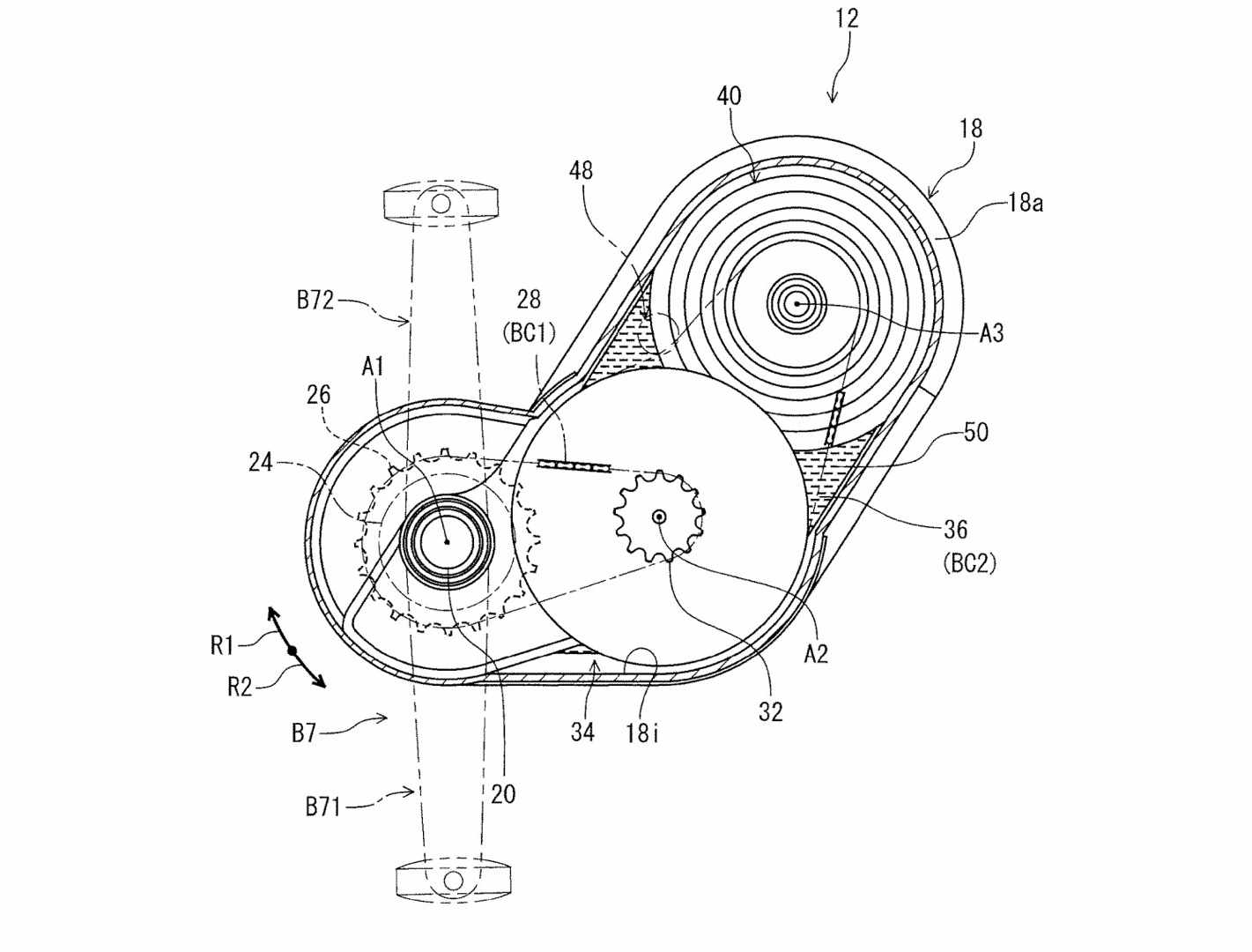 The Shimano gearbox patent was submitted in January of this year (2019) and clearly shows a self-contained 13-speed drivetrain that mounts to a frame in a similar fashion to the current Shimano Steps motor system.