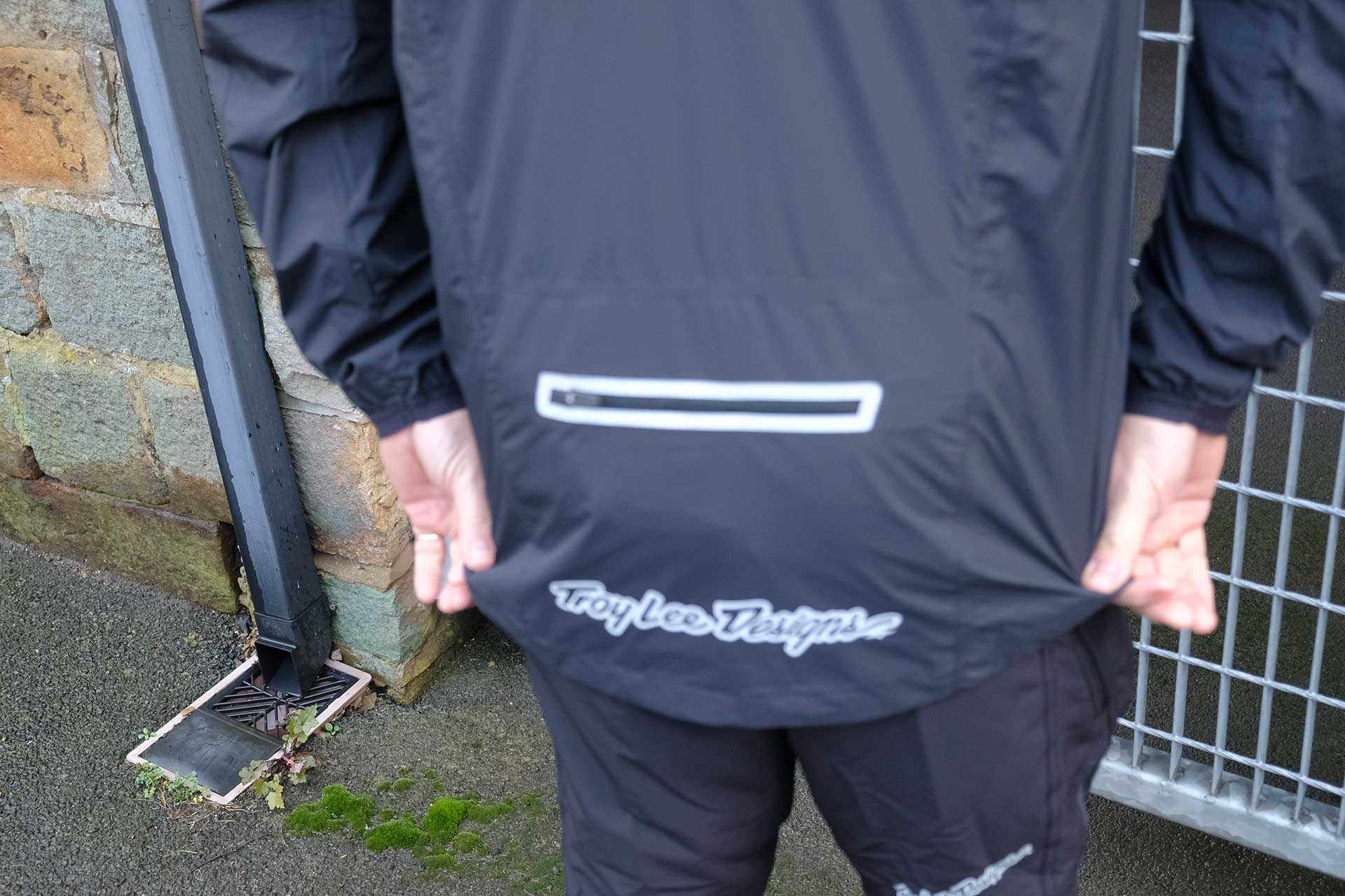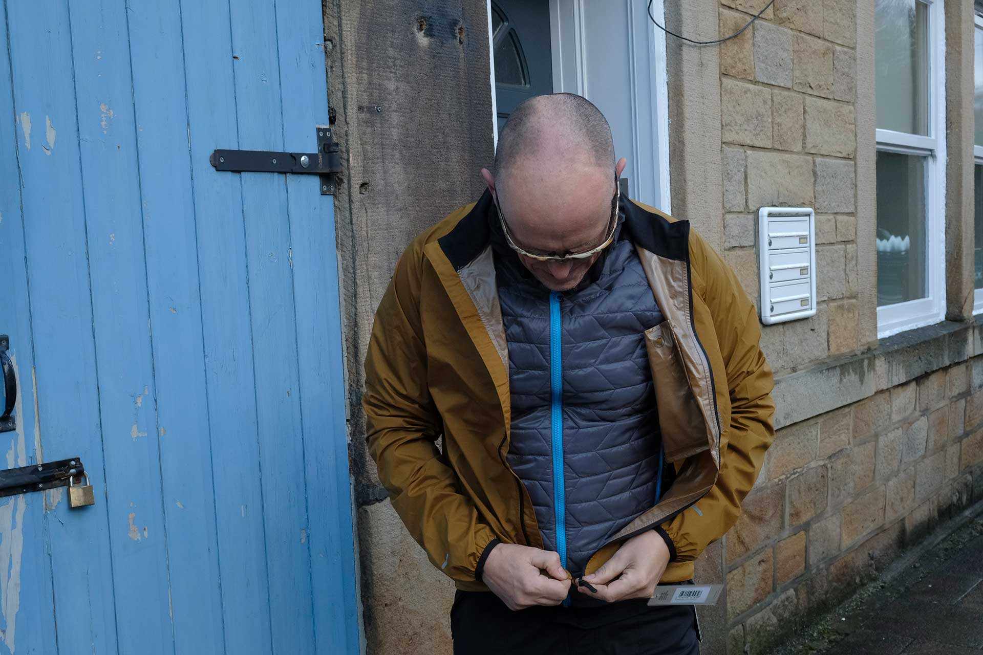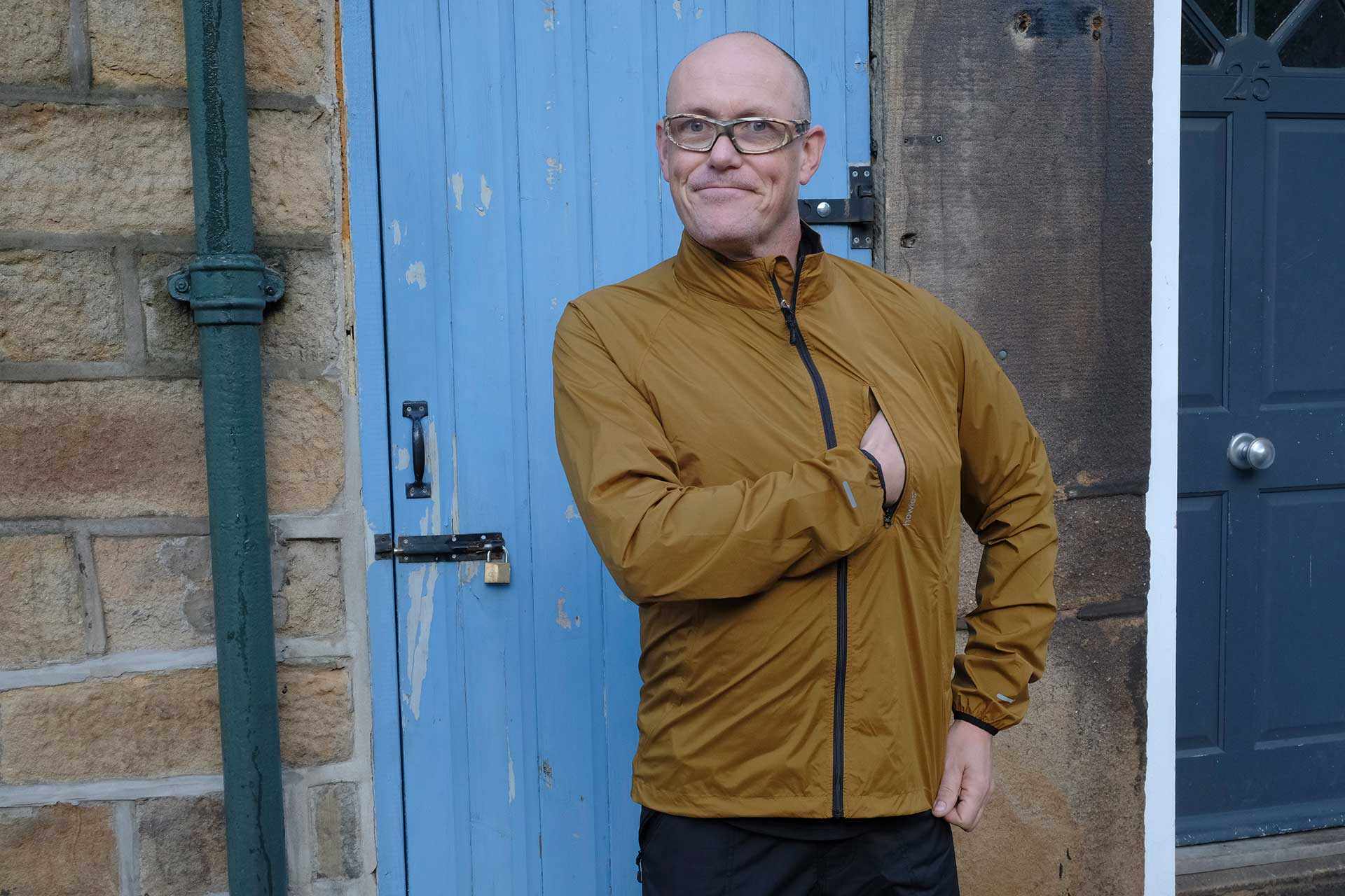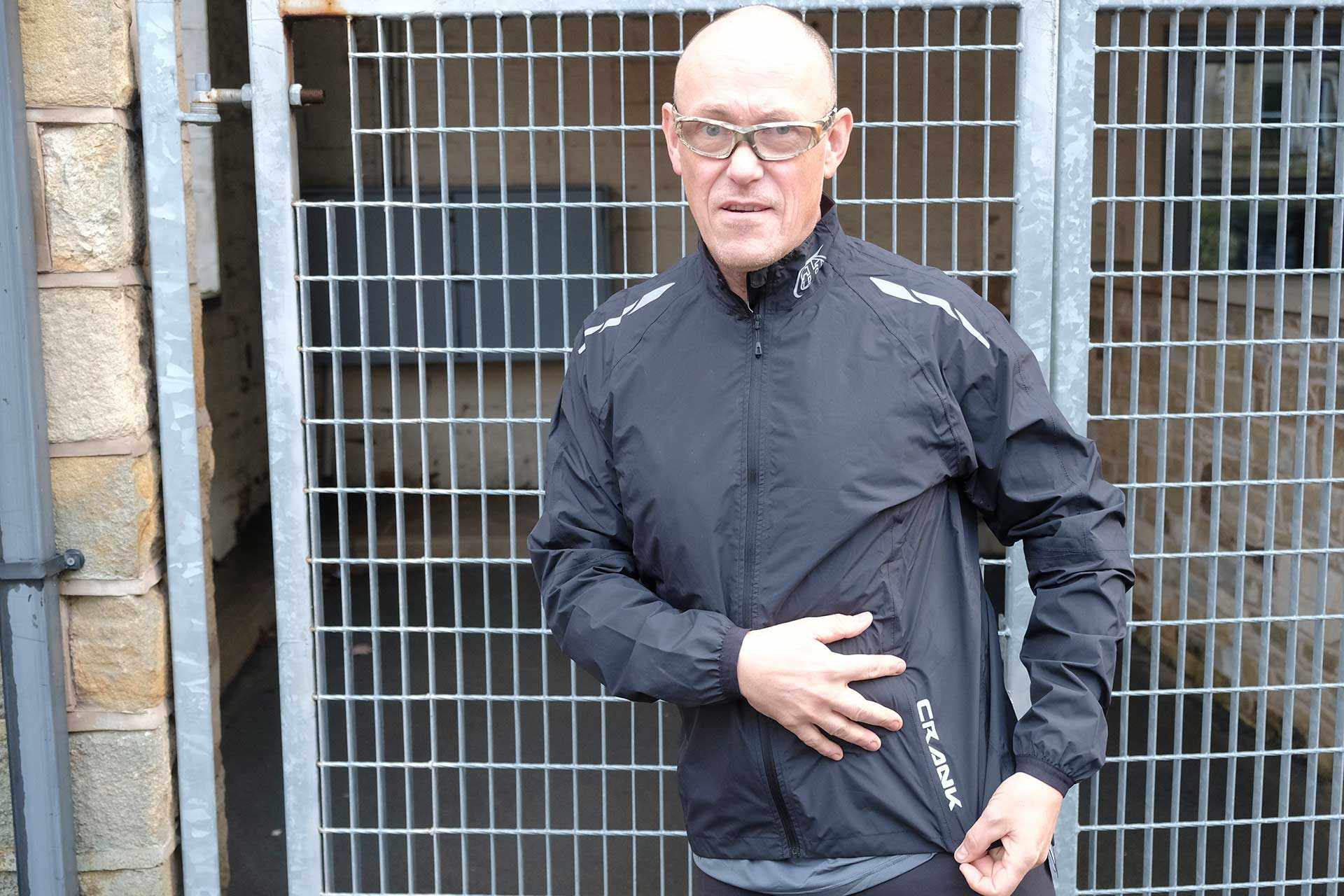 A waterproof jacket made of ‘Bluesign’ approved fabric (meaning it meets certain environmental standards) with reflective detail and a large shoulder vent and laser cut underarms vents. There’s a small rear pocket, and it says ‘Crank’ on the left hip. And Chipps is wearing it.
