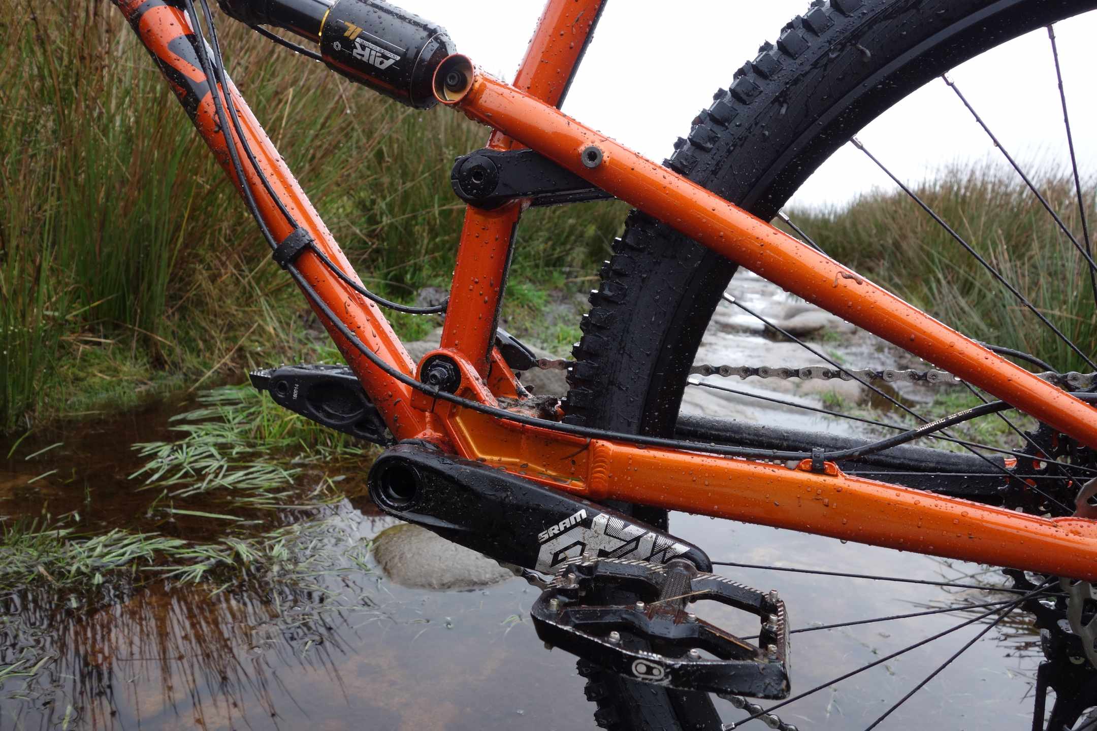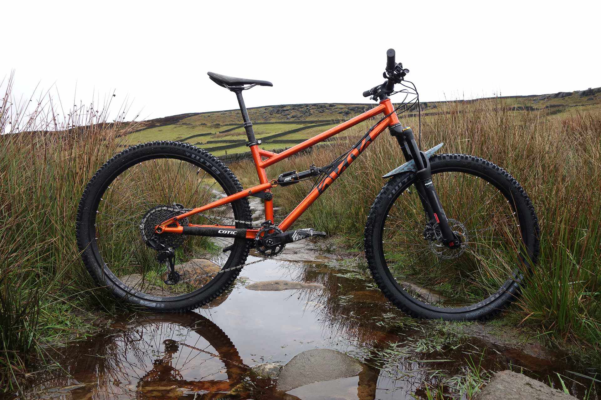 I really really like how this new Cotic FlareMAX rides. I took in a route I know well, with sections I’ve sessioned over and over on photo shoots, in all different weathers. This test ride was sloppy and slippy and yet I flew down these trails, accomplishing that sense of skipping from rock to rock (and over a few in between) that I didn’t really know I had in me. Point the front end, let the back end follow, skip and hop along. Feet staying on my flat pedals, suspension preventing any sensation of being bucked off or kicked about. Certainly suited to the kind of trails I ride regularly, I’d love to to take it to the kind of persistent steep insanity offered in the likes of the Golfie. I’d also love to throw it in the air over and over again at the local BMX track. This is the most instantly comfortable I’ve felt on a bike while still being playful rather than simply stable. Dammit. I want one. Any chance I can replace the satsuma in my stocking with this Disco Orange? Please? I’ve been really really good this year, honest.