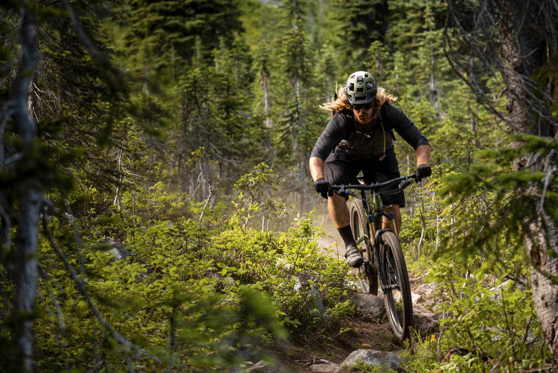 As we leave the confines of the lower slopes, we transition to the wild flower meadows that are so iconic in the high alpine of British Columbia. It’s a brief season when the flowers are in bloom, lasting barely three to four weeks from mid-July to mid-August and we’re treated to a glorious display of bold reds, delicate yellows and bright whites carpeting the slopes. When someone suggests this would be a good place to stop for a bite to eat, there is no argument and everyone settles down to find their own patch of nirvana. Beyond the flowers and the pine trees, the views are opening up too, and other peaks reveal themselves to us through gaps in the foliage. Crickets chirp in the scrub, and even the damn mosquitoes that have plagued me for the rest of my trip have taken a break. Only 80% rideable? Who cares.