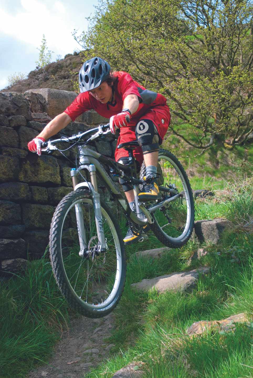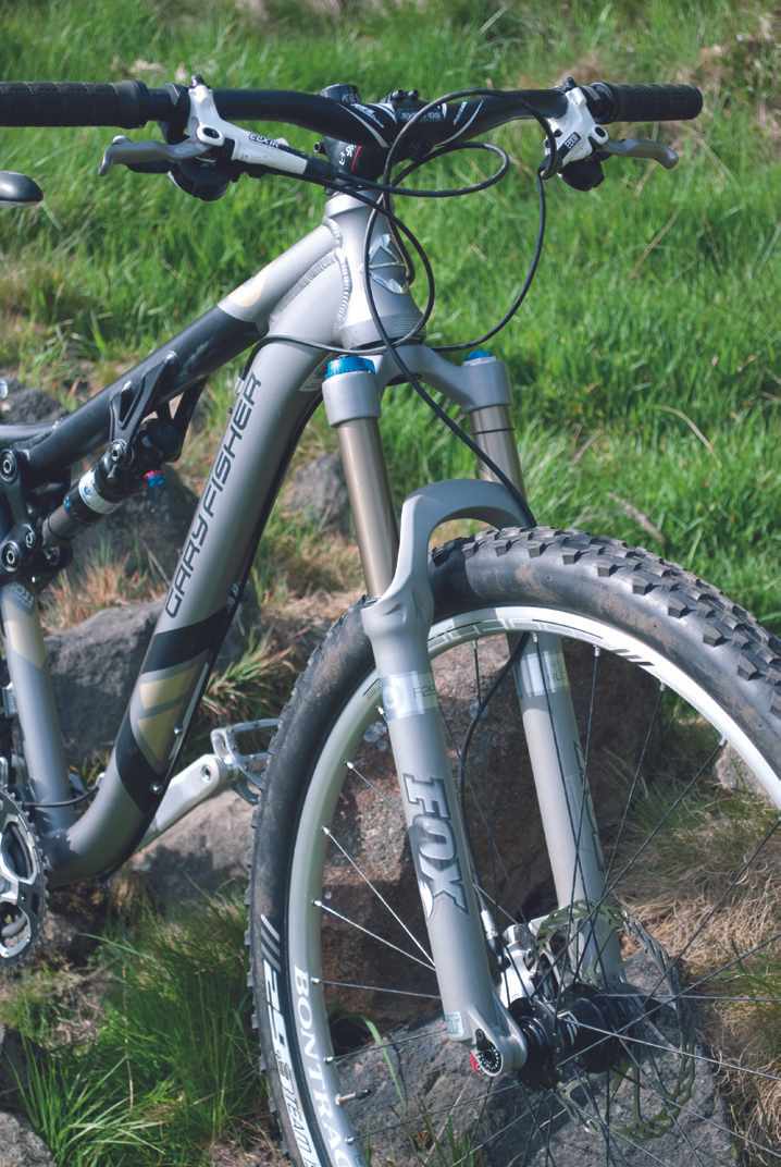 In the middle of the Rumblefish are a couple of notable things as well: integrated ‘BB95’ bottom bracket cups and the Fox DRCV rear shock.The BB95 system claims to offer a reduction in weight, more pedalling stiffness and power transfer (the down tube and bottom bracket junction is indeed huge. The Fox DRCV (Dual Rate Control Valve) shock is similar to those found on the Gary Fisher Roscoe. This is a position sensitive valve that opens the passageway to a secondary air chamber at a predetermined point in shock travel. So on smaller impacts the shock is only ‘working’ the rst air chamber, when a bigger hit comes along a ‘trapdoor’ is automatically opened and the second air chamber is brought into play. It’s a good way of maintaining a consistent feel to the suspension throughout the whole stroke.