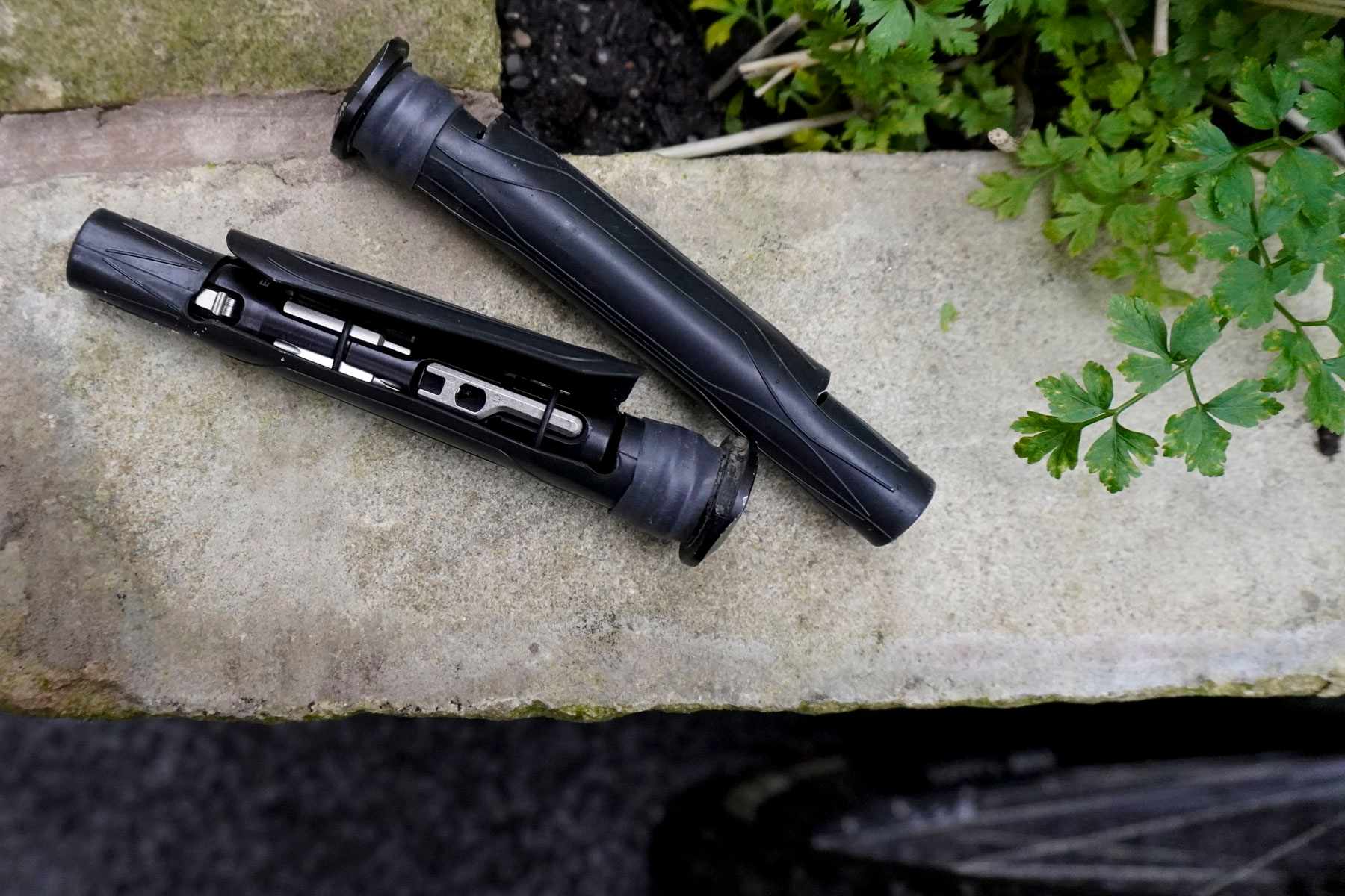 The heat shrink rubber pictured above is a custom fit for different bar diameters. I’m running some Spank Oozy 35 bars, so Alloy, and I needed the rubber shim. I guess some carbon or steel bars may not have such a wide diameter and could take the tool storage without the need to fit these, but it wasn’t much faff and in less than five minutes with a hairdryer, I had secured them in place. The first time I put the bar end and storage sleeve in I didn’t think they’d ever come out again – it’s a really secure fit, yet easy enough to get them out when needed.