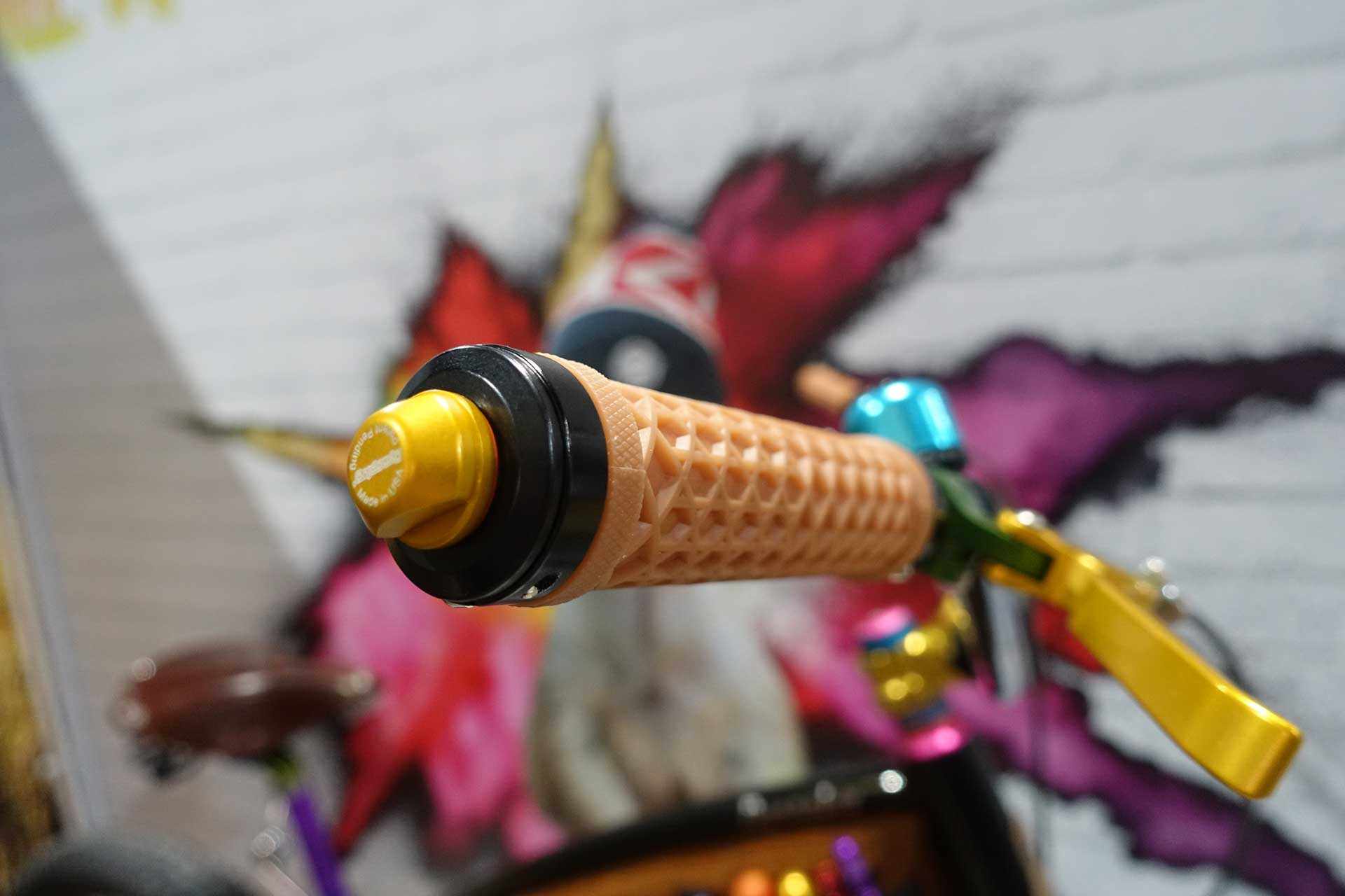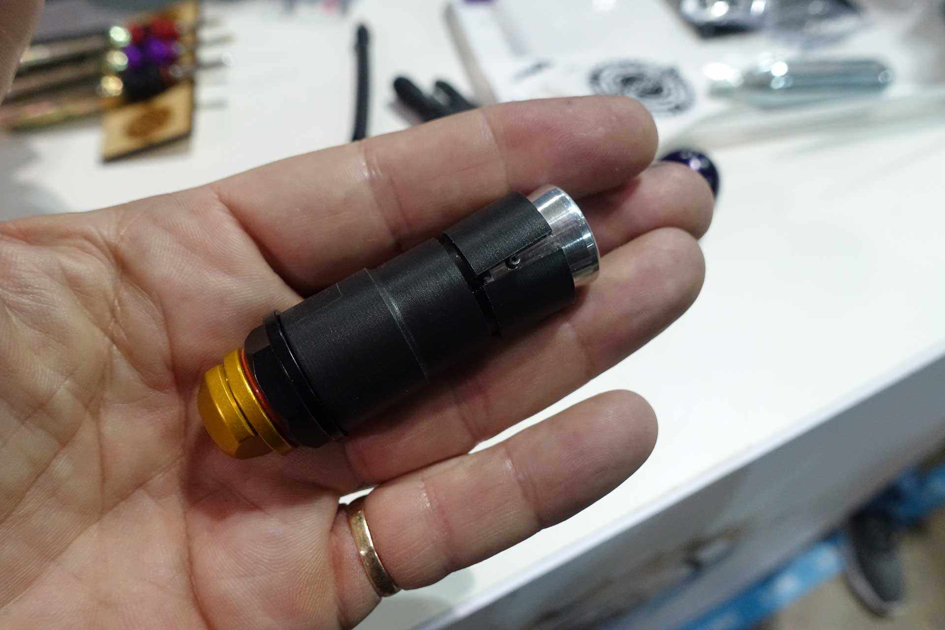 This bar-end prototype has a collar that fits to an ODI Lock-on grip, giving the internally threading unit somewhere secure to anchor to. The end then unscrews to reveal one of Dynaplug’s tubeless tyre plugs – and it sits in a captive chamber so you won’t have to fish anything from the middle section of your handlebars… There’s one for road bikes too (below) which has an expanding section.