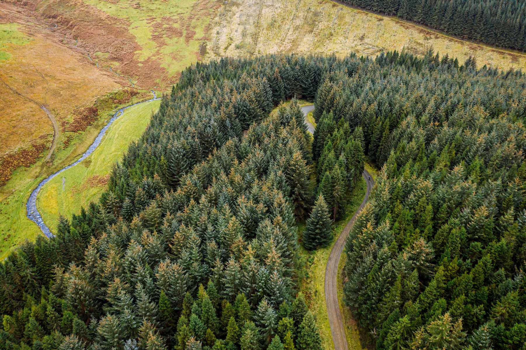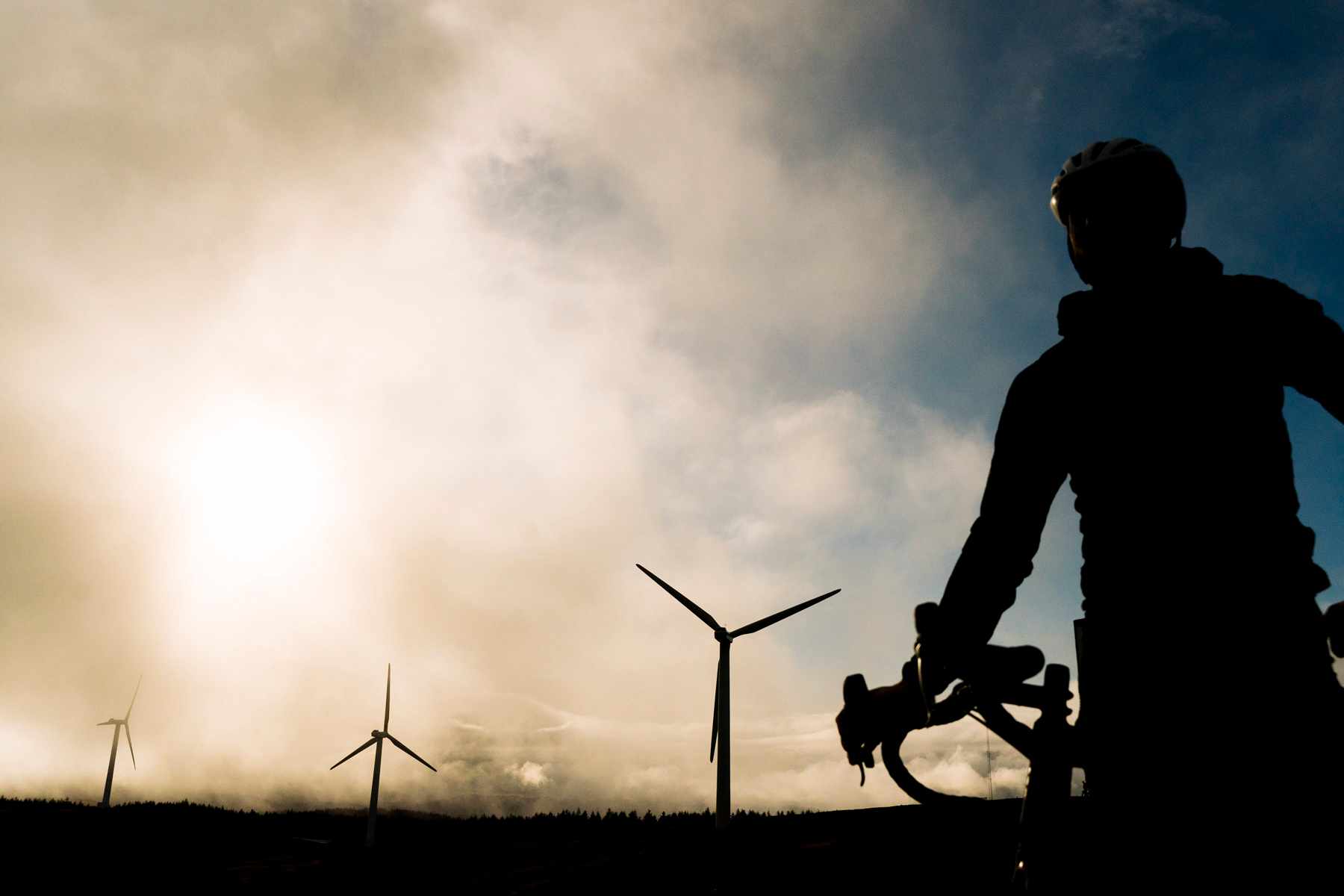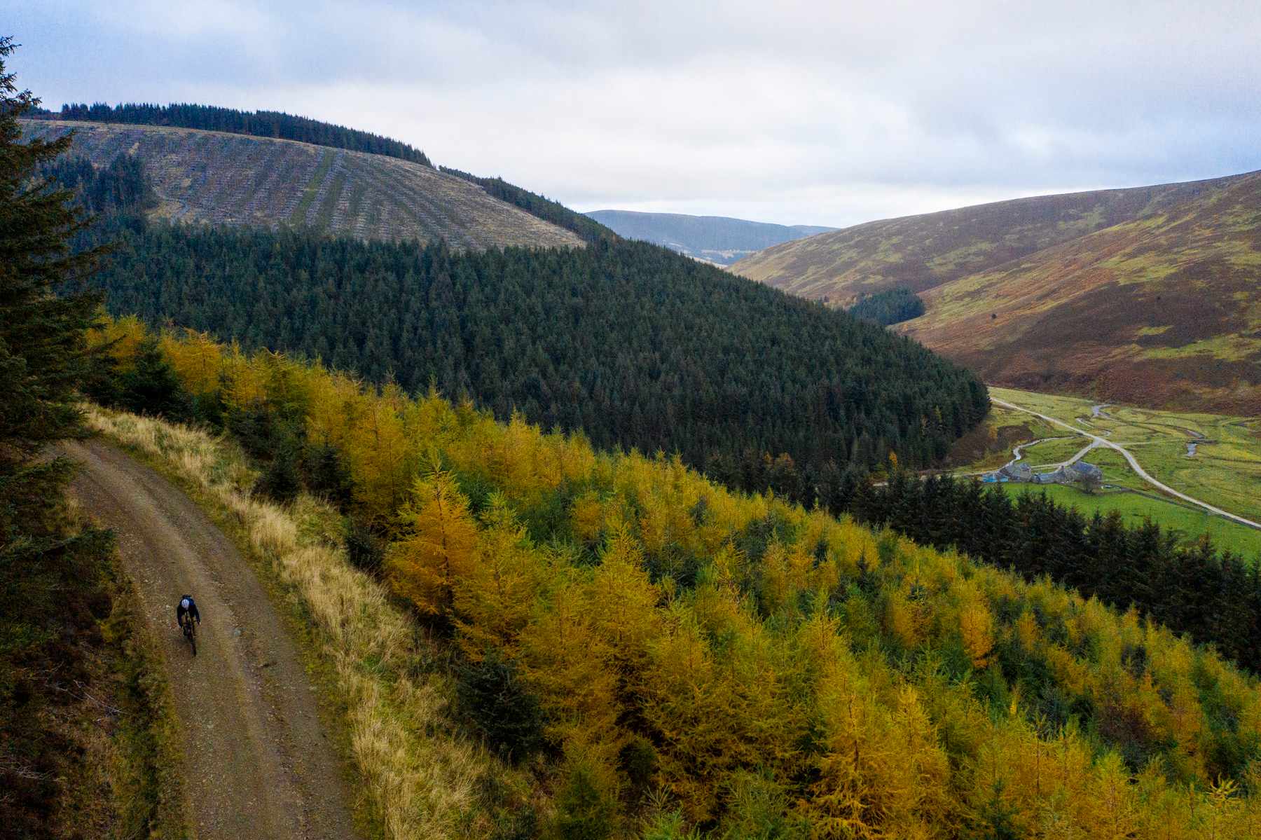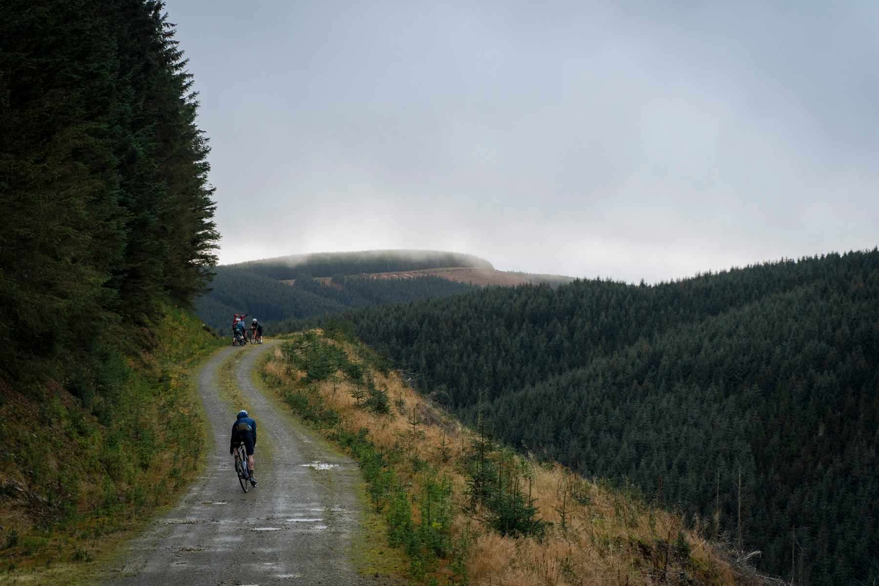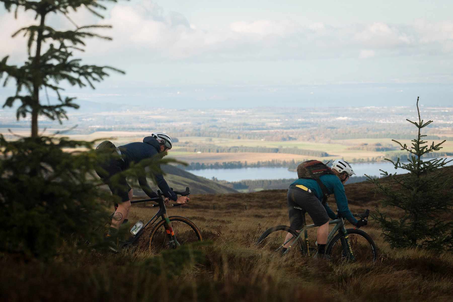 Our group paused at the high point of the ride. Huge wind turbines sprouted from the heather like giant white tulips. A bitter autumnal wind pushed and tore at rain clouds, granting us rays of golden light from the low sun then closing the curtains as an icy squall raced through. Despite the very obvious human impact on the landscape, it felt as though we were in the middle of nowhere; we hadn’t seen a single person since leaving the marked trails of Glentress an hour or so ago. We discovered a seemingly endless network of pristine forest roads, perfect for gravel exploration, granting views to Edinburgh in the north and linking into drovers’ roads that existed long before the commercial planting now below us.
