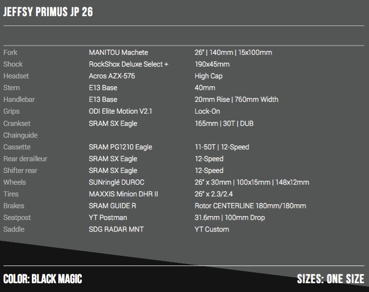 The JEFFSY PRIMUS JP 26 has been developed for slightly taller shredders looking to send it with their mates. Fit with a 140 mm Manitou Machete fork and RockShox Deluxe Select + rear shock this mountain bike is a mean machine. The 12-speed SX drivetrain from SRAM paired with SRAM Guide R breaks deliver high performance when it comes to shifting and braking. Handling the bike is a given thanks to ODI grips, E13 handlebars and the dropper post ‘YT Postman’ makes sure the SDG saddle is out of harm’s way, when riders hit the next downhill section. Both the JEFFSY PRIMUS JP 24 and 26 rely on MAXXIS Minion DHR II tires to deliver grip in any conditions. Talking of conditions, even the muddiest and wettest days can’t stand in the way of a good shred in the woods, thanks to both bikes boasting the same high-end tech features as the JEFFSY which enable easy maintenance such as the single sided hardware access and race-specific advanced sealing concept with double-sealed bearings which keep water and dirt at bay.