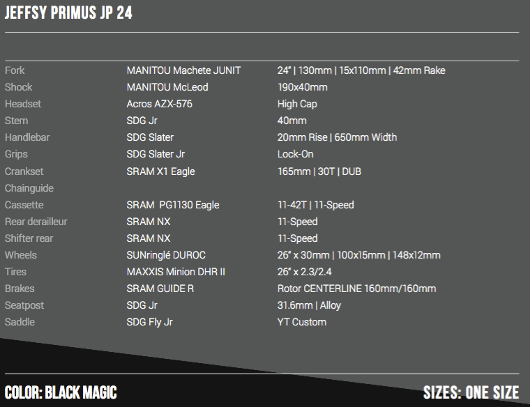 This extremely playful performance bike has been developed with small shredders in mind and aims to enable them to go full send with their big buddies on the trails, while proving to be an excellent climber on the way back up. The JEFFSY PRIMUS JP 24 is spec’d with a mint Manitou Machete JUNIT fork with 130mm worth of travel and its rear counterpart the Manitou McLeod shock is custom tuned for light riders. High-end handlebars, grips, saddles and seat post all come from SDG and the 11-speed NX drivetrain from SRAM enables smooth gear changing. The SRAM Guide R brakes with 160mm rotors deliver the braking power to manage speed well before tight corners and come to a halt at the end of the trail to finish with a stoked fist bump with the riding buddies before heading back up again.