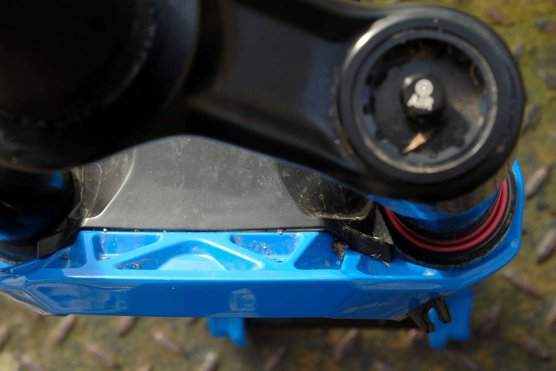 While we’re looking around the chassis, there’s refreshingly little to talk about. This really is a no-nonsense stripped down fork. We did have an issue with the inbuilt hose clip on the fork leg not taking thicker Goodridge hoses (and with no way to bodge a ziptie in there) but that’s probably not going to affect too many people. The bolt-on mudguard is rigid and effective. Getting it on and off is a pain though as it takes a tiny T8 Torx bit and, being so deep into the back of the brace, it’s a big fiddle to get on and off. You’ll probably either leave it on all the time, or leave it in the box.