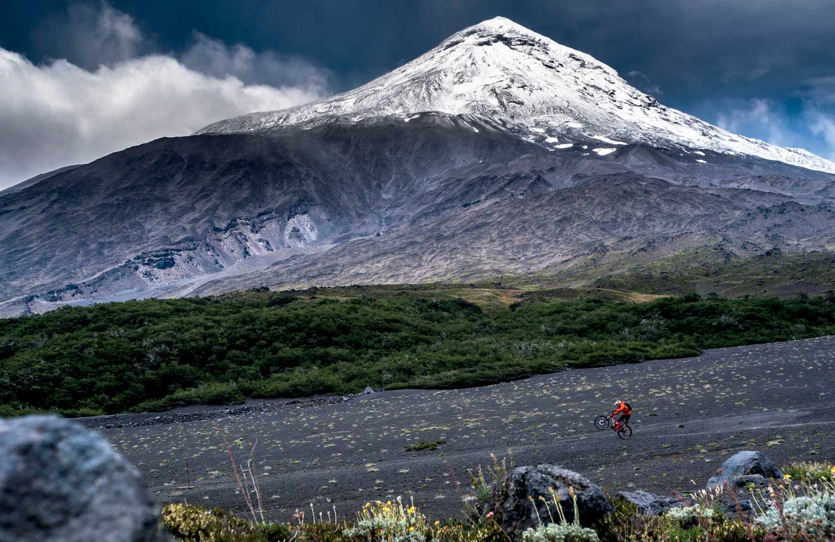 The 3747m high Lanin volcano dominates the skyline on the Argentinian-Chilean border and makes a mighty backdrop for Rene’s manual down some little-ridden singletrack. We followed this trail for three days, starting at the foot of Lanin and finishing 100 Kilometres west at Pucon in Chile. It was three days of almost perfect singletrack through primeval landscapes, and three days of rewarding adventure.