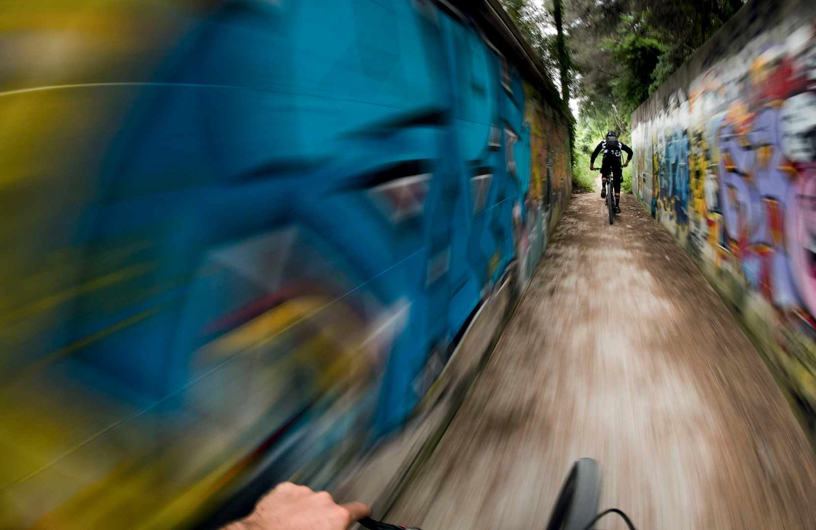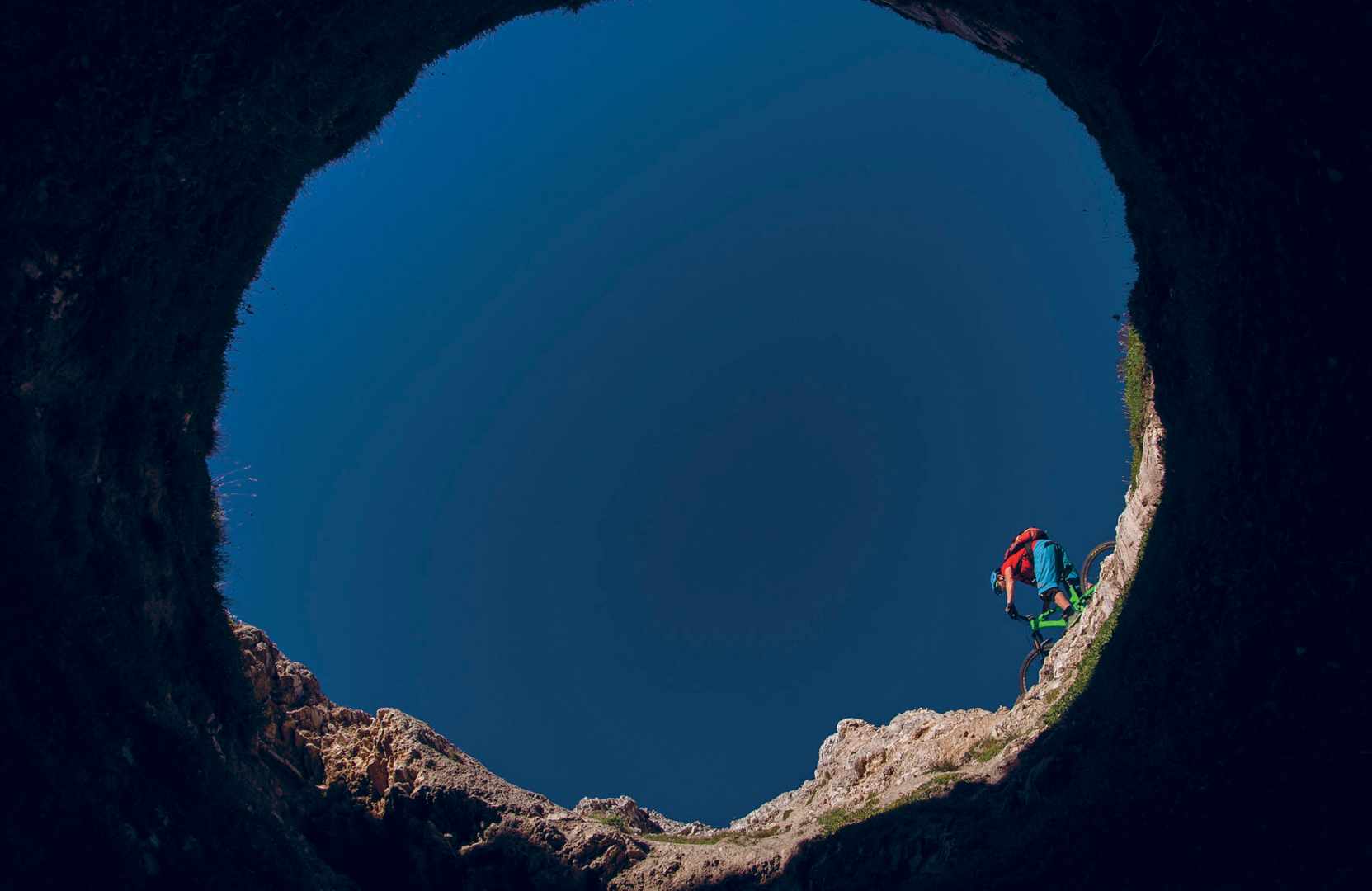 Shot with my 8mm fisheye from the depths of the second sinkhole I tried to get into that day. Located on a limestone ridge high above Courchevel, Ben skimmed the edge of the hole, on a tyre-width trail. Thankfully, this particular hole only took me about 5-10 minutes to get out of after the shot. However, it’s always harder climbing with one hand, using the other to clutch onto the camera.