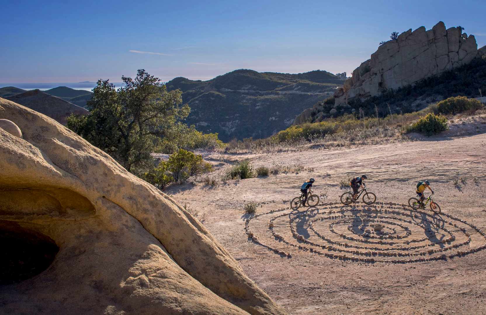 Hans Rey explains: “We found this spiral in the hills above Malibu. Probably some powerspot where the likes of Pamela Anderson and Justin Beaver [sic] get their powers. We found this along the Backbone trail. The name of the game was the ride as far as possible without touching any rocks…