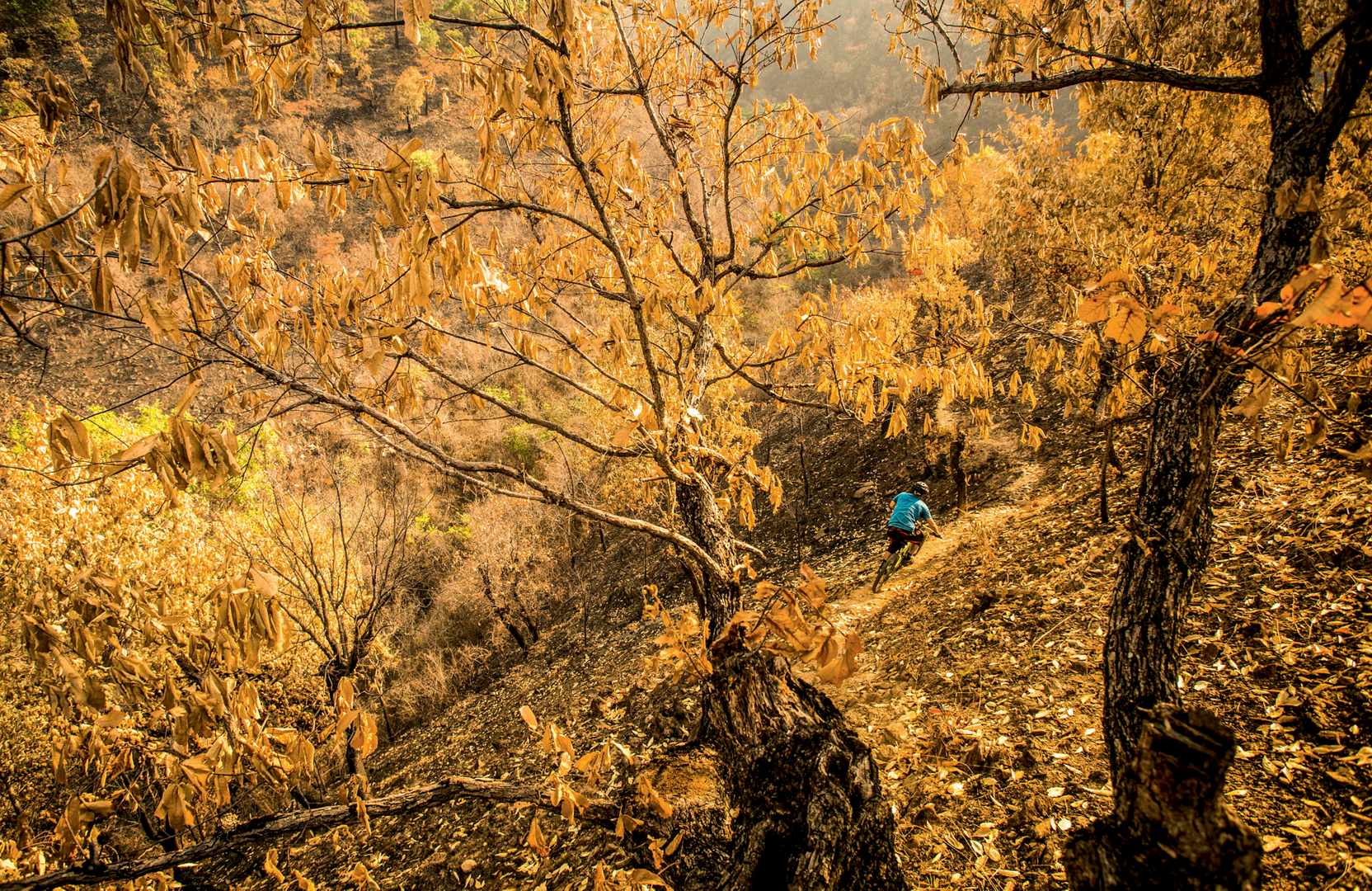We stumbled across this trail after a recent fire, while exploring for trails in a remote part of Guatemala. Much of the ground cover had burned away leaving a few trees and a light brown ribbon of trail flanked by the charred remains of the hillside. For me, it was a matter of walking around until I could find a tree suitable for climbing so I could get the angle I was looking for. The tree I found was questionable at best but it did the job.