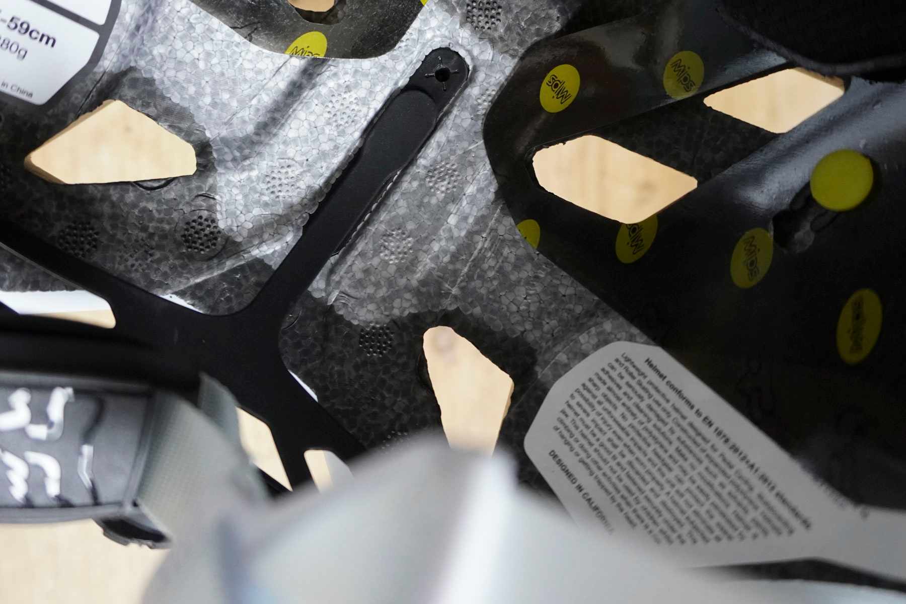 This uses two different densities of EPS (expanded polystyrene) so that the helmet has a more progressive way of absorbing impacts. The softer EPS starts crushing right away and the slightly harder EPS only starts when the softer stuff can’t move much more. Soft, yet firm.