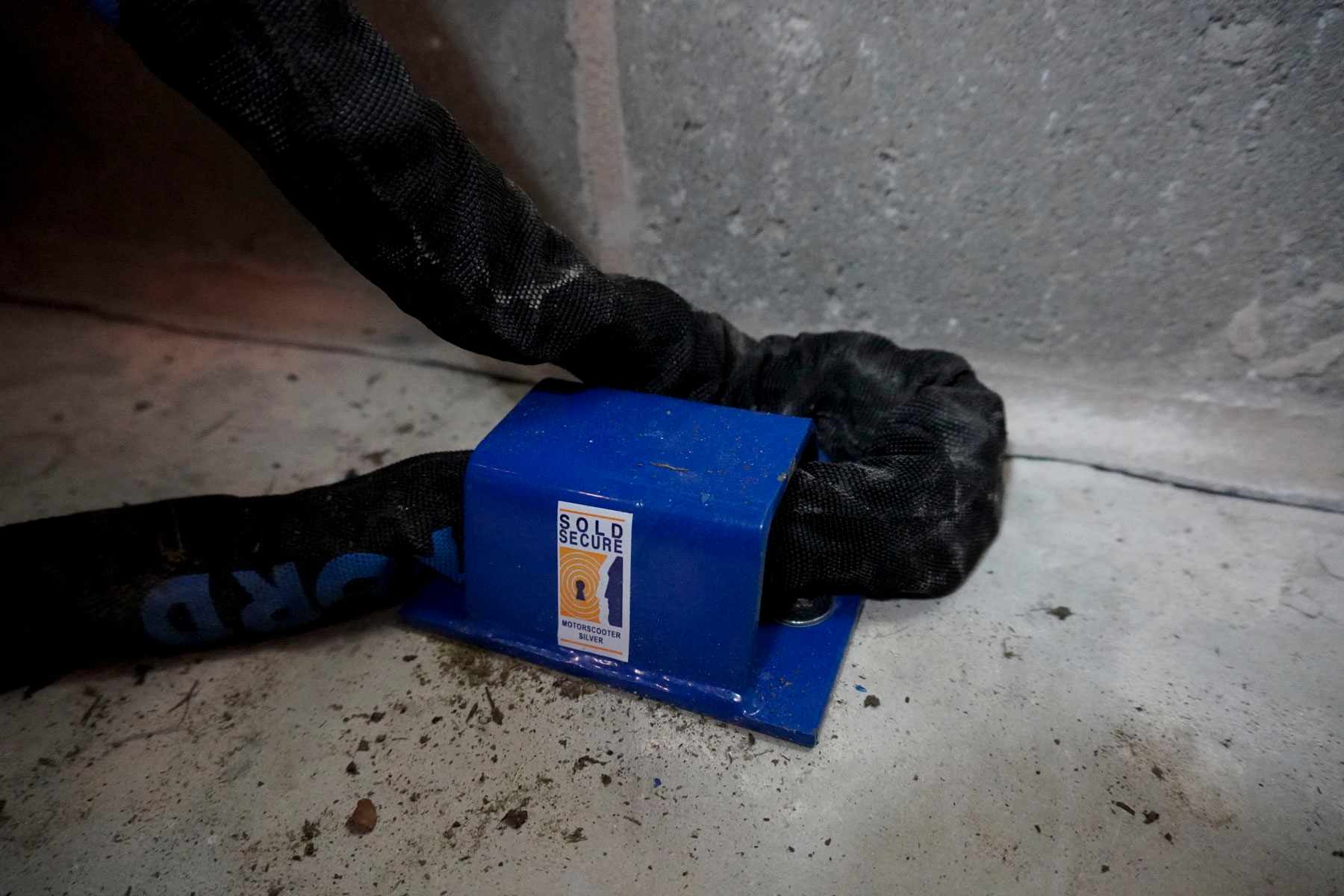 Locking your bike to a ground anchor is a really great way to slow down progress, especially if you can use a great big chain to go with it. Not only is a chain tough to get through, it covers the bolts and helps prevent the ground anchor from being drilled out.