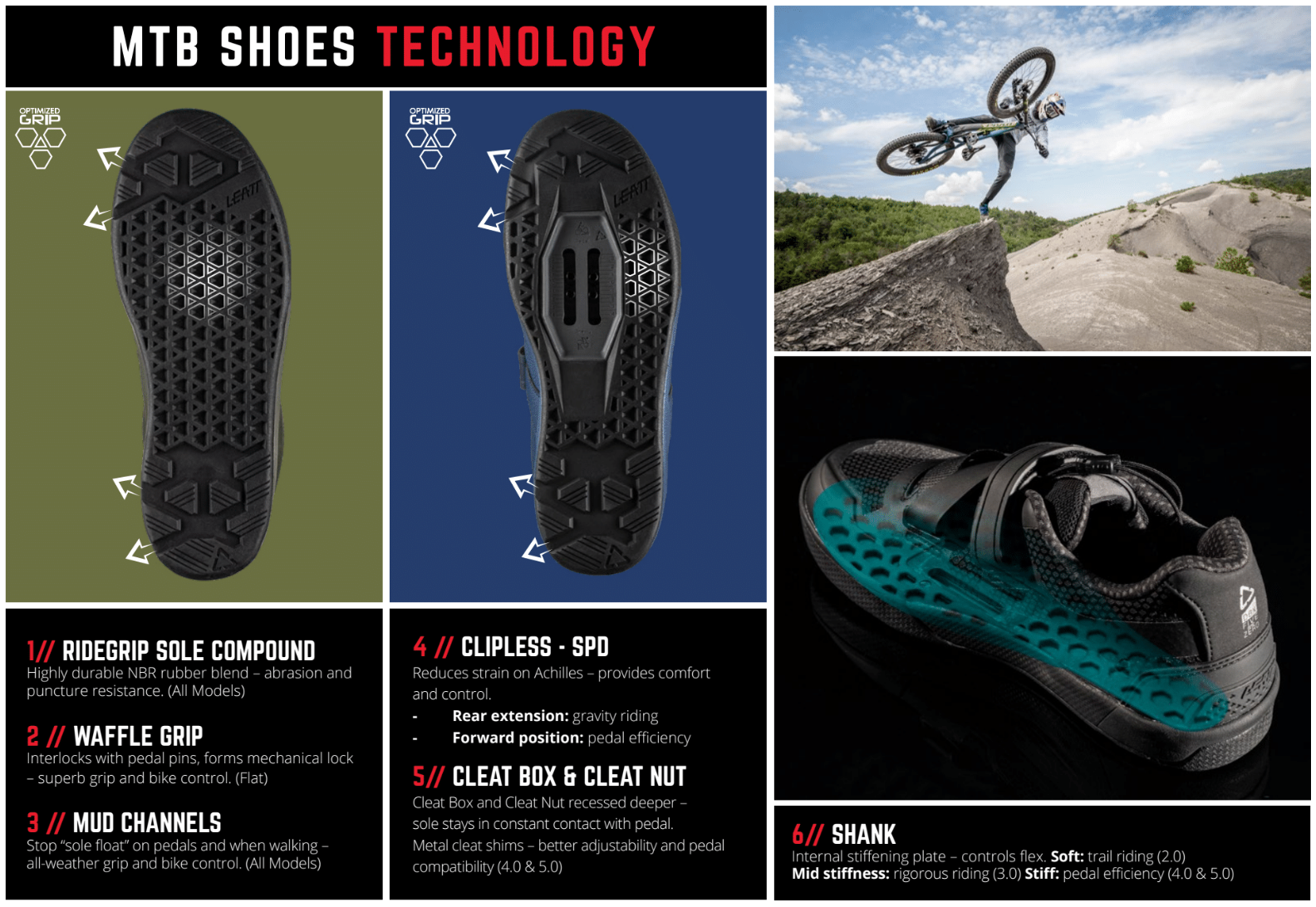 Leatt have developed their range of MTB shoes to help improve riding skills by increasing bike control. Each model features a shank, hidden above the sole of the shoe. The shank controls the shoes flex which determines what kind of riding it is optimised for. Softer shanks (Leatt 2.0) are optimised for trail riding, mid stiffness (Leatt 3.0) for rigorous riding conditions and the stiffest shanks (Leatt 4.0 & 5.0) maximise pedal efficiency.