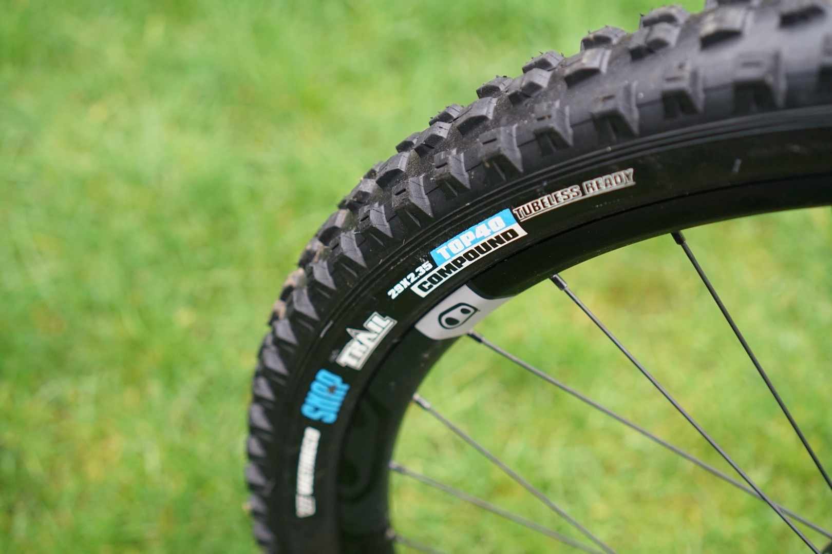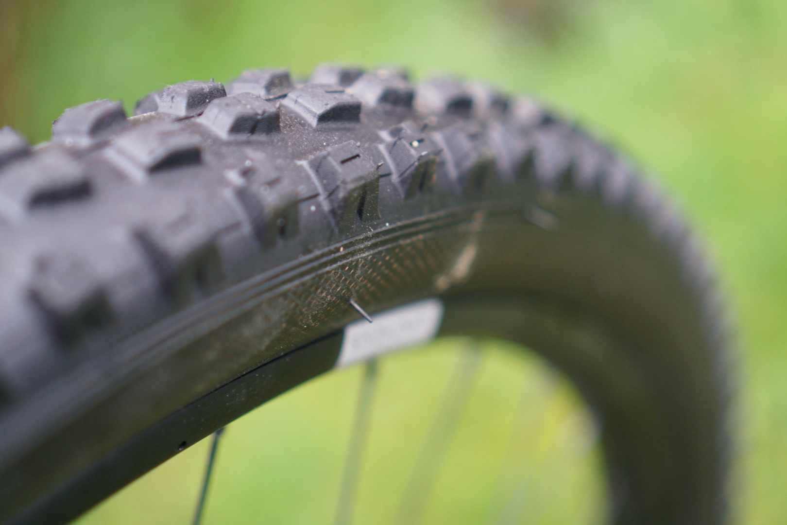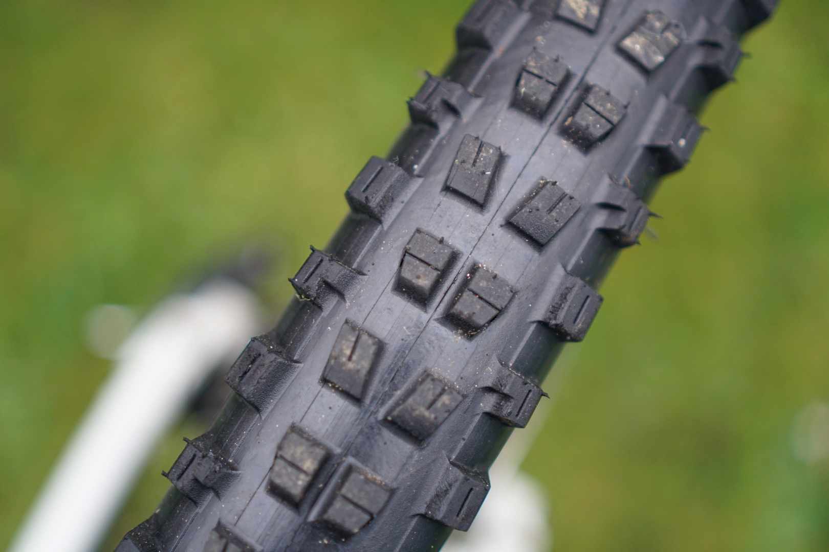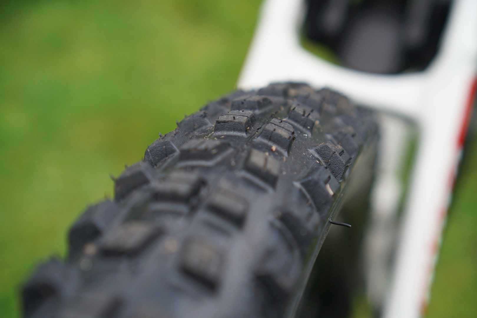 Side knobs are also alternating in design with a block L shape followed by a chunky block tread. The depth and profile of these side knobs are more aggressive than some other trail tyres we’ve tested and look just the sort of design we would be after in loose UK conditions.