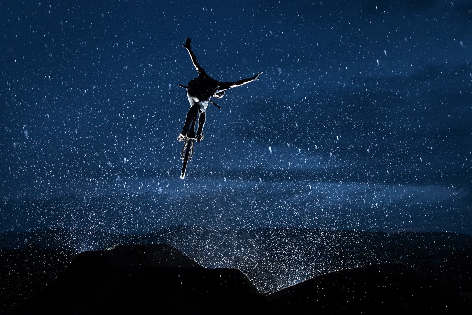 What I love when it comes to photography is uncertainty. Earlier in the afternoon, I had asked Jéremy Berthier and Nicolas Terrier if they were up for a sunset shoot on their home trail. We all thought it was a good idea as the sunsets are often crazy up there, with golden hour sun facing directly at the jumps. Once I arrived, I started to look for one or two photo ideas but in the end, none of them worked as big clouds arrived and we knew the sunset wasn’t going to happen. I was a bit lost but just before the night, it started to rain and we focused on a single hip. I love shooting under the rain with speed lights but it’s always challenging for my gear and the athletes. One of my flashes, the one on the right side, wasn’t firing for most of the tries for no reason, but I couldn’t loose time and solve the problem. I got lucky as it suddenly started to work again just for this photo. It wasn’t an easy one for the riders but they know how I like to work in bad weather conditions so I guess they’re used to it now.