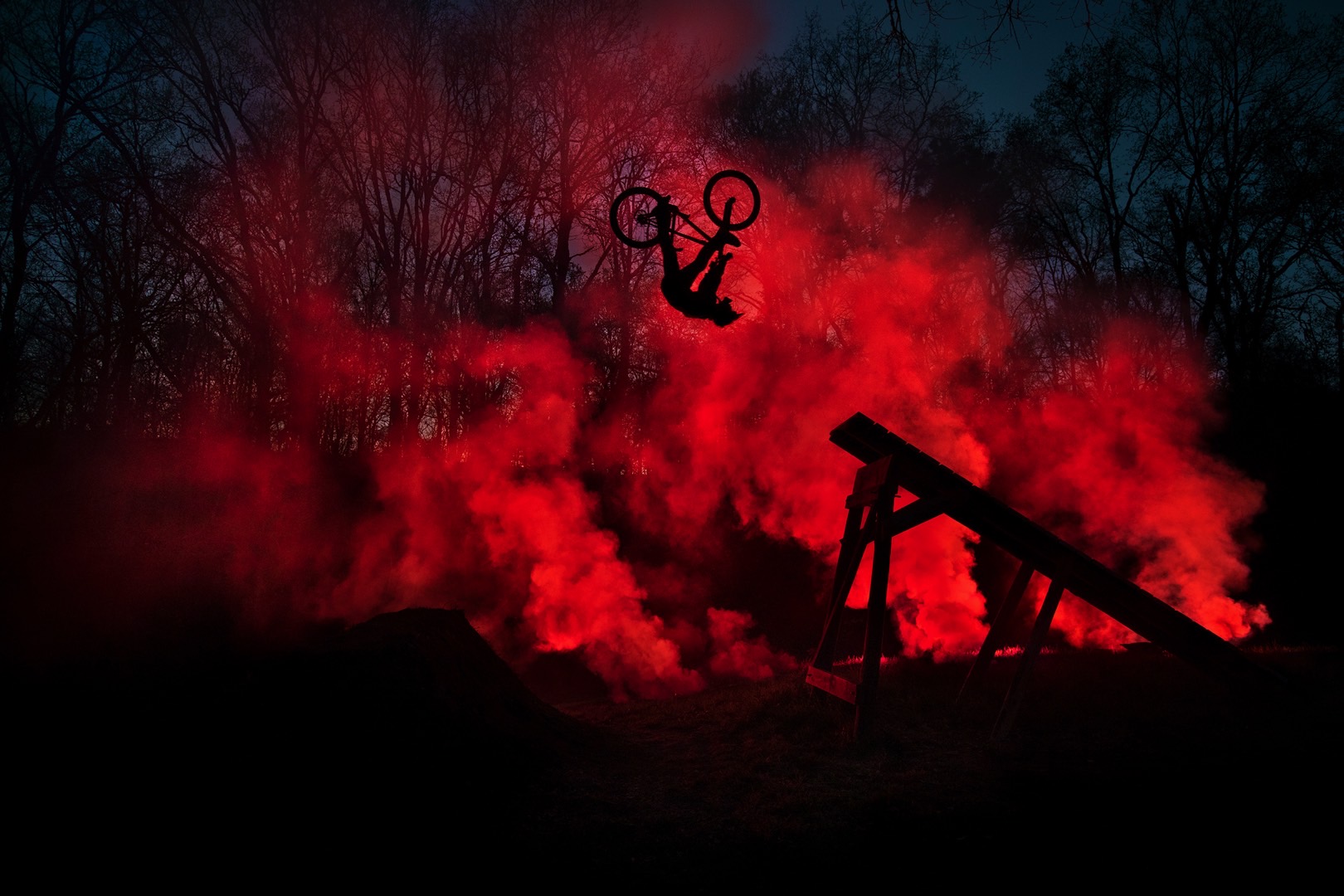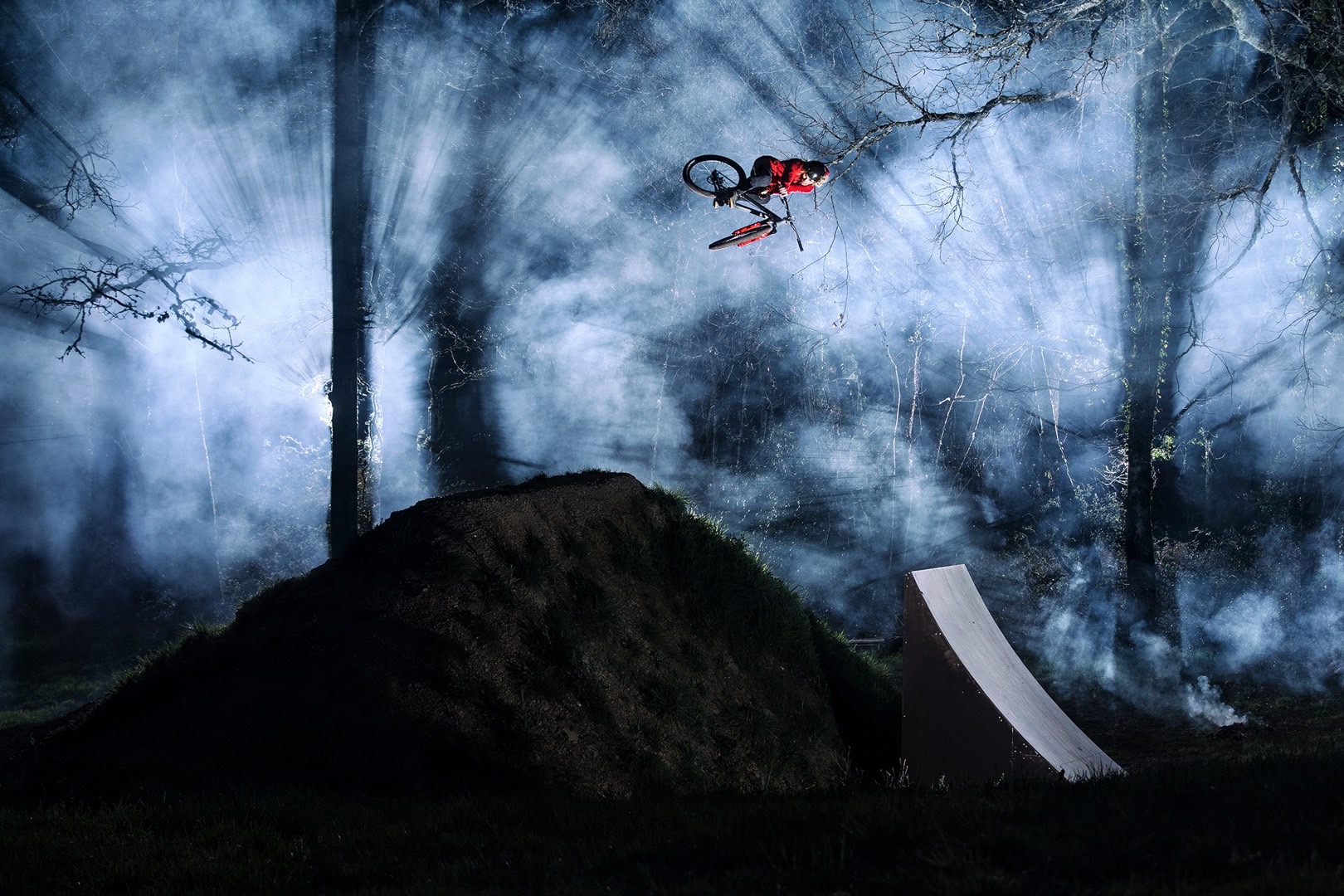 Some jumps are perfect for riding but hard to shoot. This one is at the bottom of a field, with a forest on its side hiding the sunset light. The are not a lot of ways to get good light on it, that’s why I chose to shoot it after sunset with a few flashes. I wanted to use smoke again to hide the dark background but covering such a large frame with smoke is not easy at all. We had to set up a good number of big fires all lined up on the side of the jump and then Paul’s brother helped us creating the smoke by throwing some green grass on the fires.