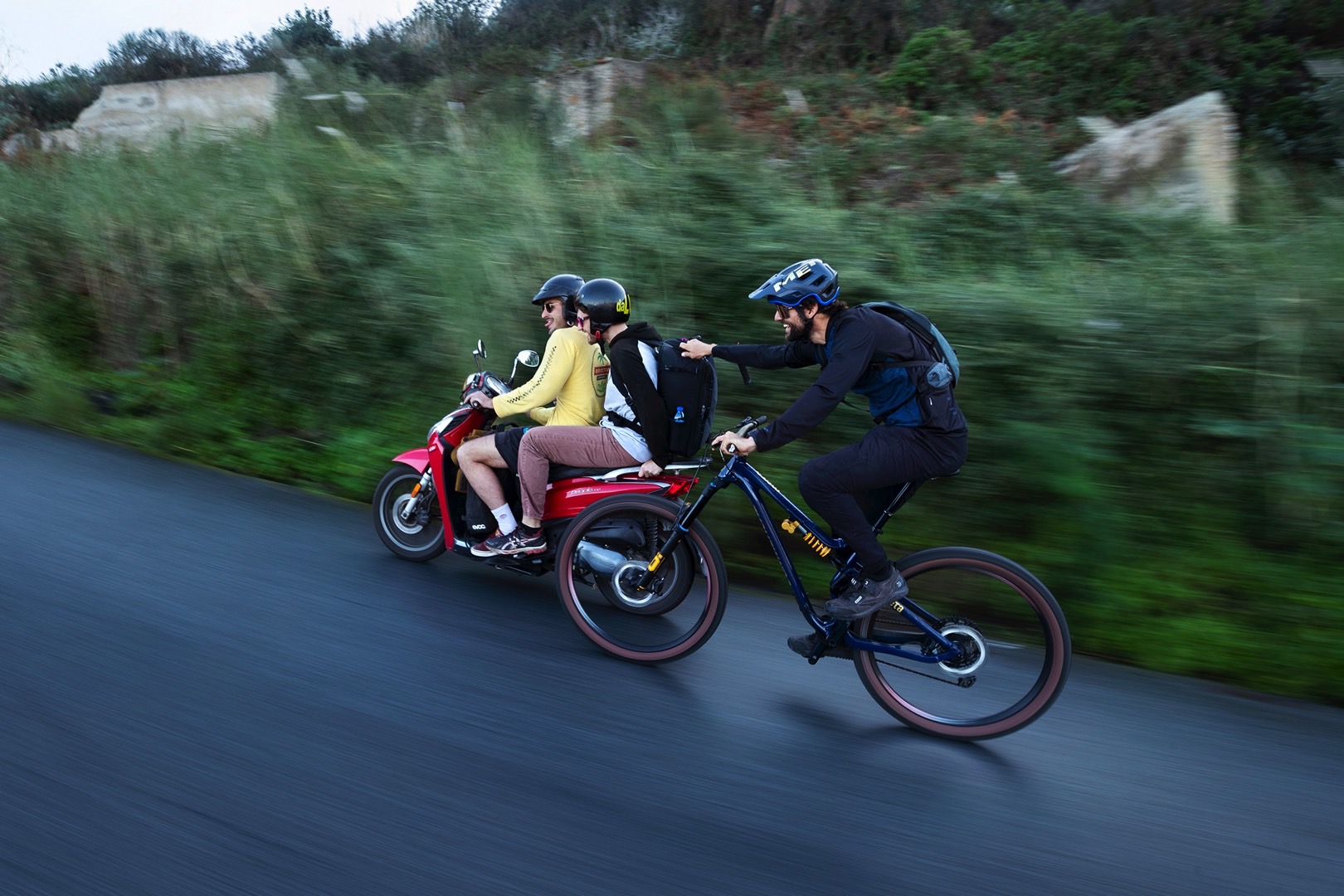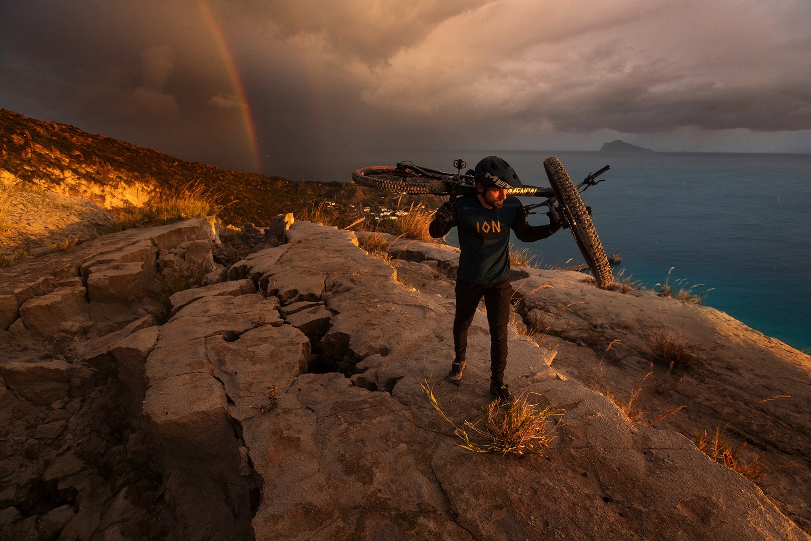 This image makes me smile every time I look at it, probably because we were all laughing during the whole ride to our shooting spot. We were in the Aeolian Islands with Kilian Bron last December, and our only transportation and hotel was a sailboat. This meant we didn’t have any transport to the shooting zones, so we had to walk, call taxis or even better, rent scooters. The trail we were about to shoot at sunset was on the other side of the island. We were running a bit late, so the only way to be there on time was to pull Kilian with one of the scooters, which was already pretty heavy with 2 guys carrying a photo bag each. We weren’t as fast as it looks !