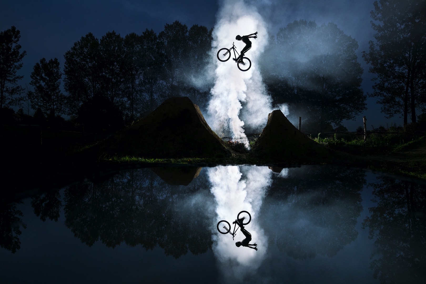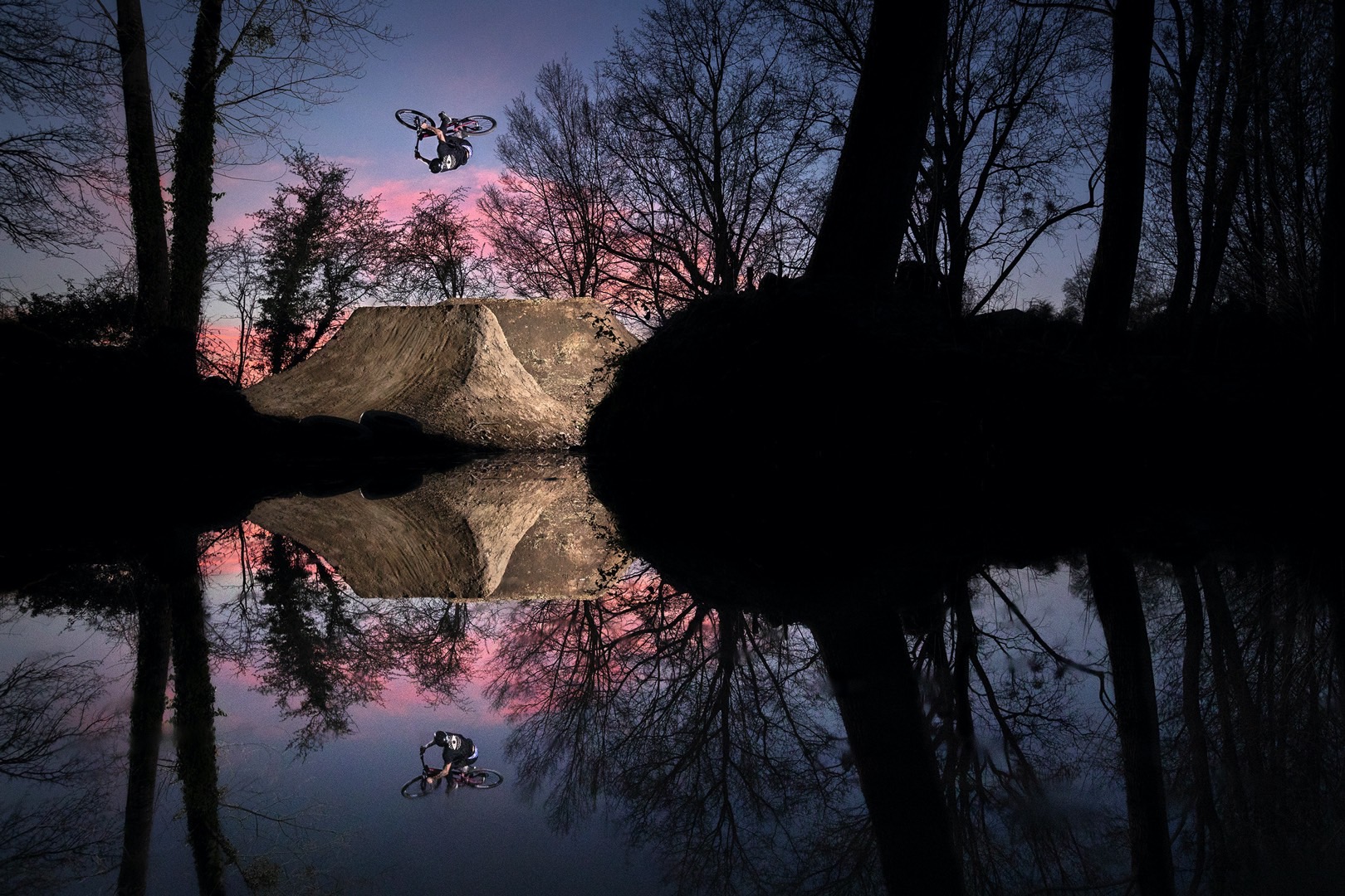 There are some places where you’ve been so many times that you think you’re done with shooting them. That’s what I was more or less thinking after spending hours and hours at Jéremy’s jumps looking for new ideas over the last 3 years. I never shot this jump before as it’s the last one of the trail and it’s not in an area directly hit by the evening sun. But this time there was a really big puddle on its side. Jéremy forgot to turn off the water the night before so it filled this big hole made by the rain. There was a lot of dead leaves on the surface though, so I spent a good part of the afternoon removing the leaves, and we started shooting at the end of the day with a small group of riders. The sky wasn’t looking that great right after sunset so we waited a little and it suddenly turned pink. I asked the riders to do a few more tries in the dark. In the end, this one was the best image.
