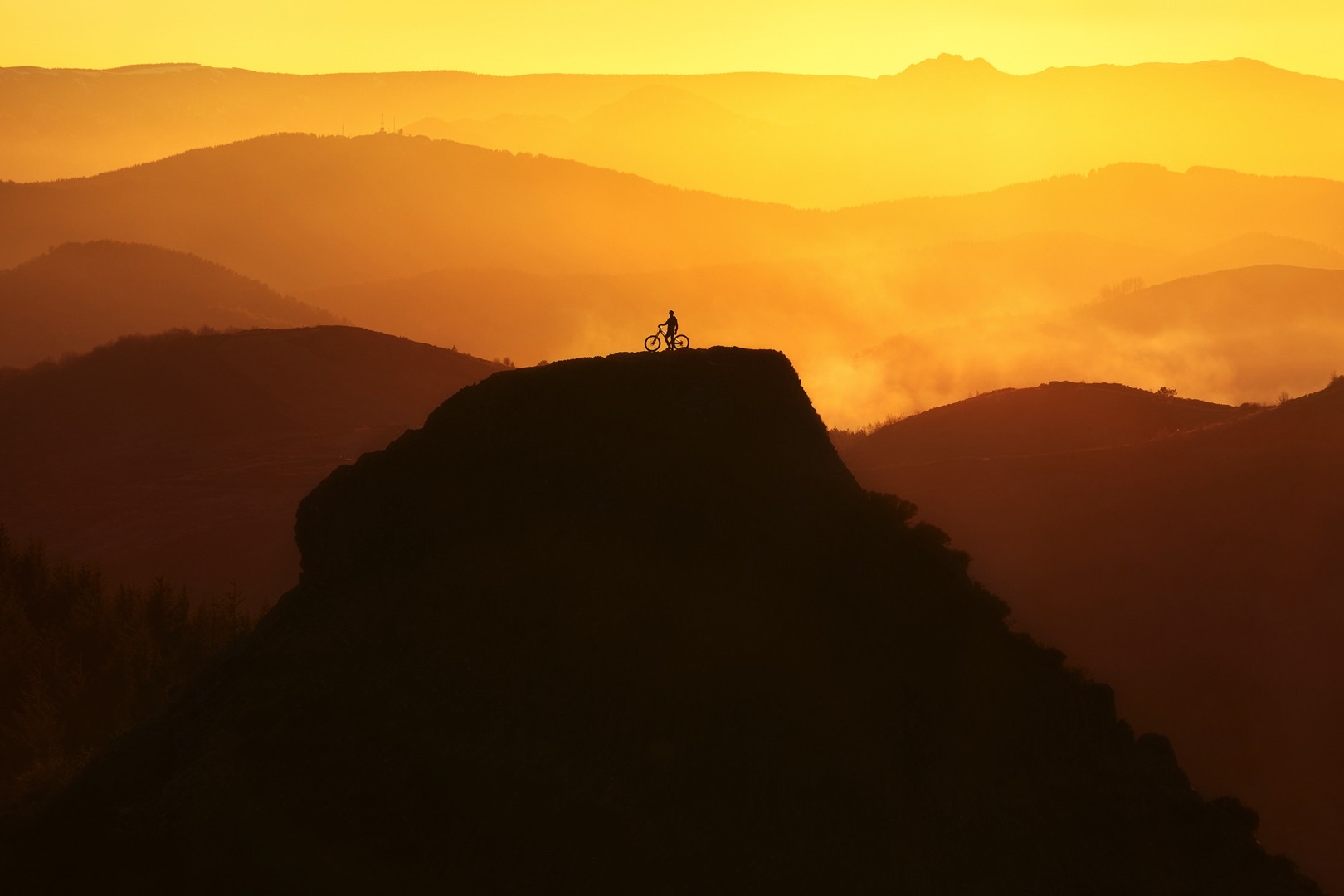 I spend a lot of time in my car, driving to shooting, riding or camping spots and I saw this rock during one of those trips. After many times passing in front of it, I realized that the sun was going down in a perfect position from my point of view but only during the winter. So I called my friend and we decided to go their with our bikes and check this out. I had to be really far away and use a long lens to make the backdrop look closer. We were lucky with the weather as the sun set exactly where I imagined, giving this warm look to the picture and only showing shadows and mountain layers.