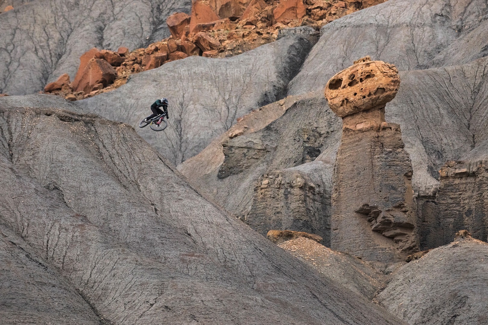 Utah is probably one of the most iconic places in Freeride history. When you’re driving on the highway through this state, it seems to always be the same landscape on the side of the road, but the desert keeps changing the further you go, the color of the dirt is different, the shape of the rocks is not the same and the weather is different almost every mile. I’ve seen so many images from Green River over the years and as a photographer it has always been on my go to list. We had the chance to do a trip there last spring with William Robert and we were all impressed by those brown rocks standing on top of big piles of black dirt. The one in the picture was maybe the most beautiful as it looked like a meteor. There was nothing really rideable or fitting the framing I wanted around it so the only way was to shoot from the bottom with a very long lens, and William was riding a ridge a few dozen meters in front of the rock.