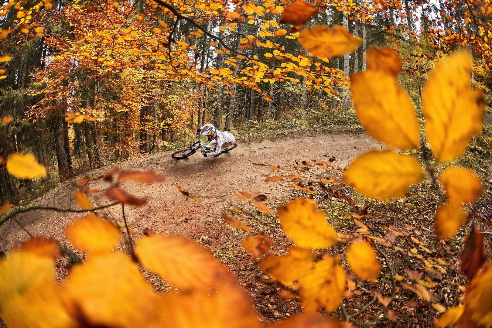Fall season is my favorite. I never had the chance to shoot in Chile or Colorado at this time of the year, but the Alps aren’t bad either. We decided to go to Morzine with Myriam for a week last October. With the world cup season, it’s really hard to find time to shoot with downhill racers during the year, and it was only my second time shooting with Myriam outside the tape. The bike park was obviously closed but we still managed to get a few photos on the main lines. Those are not the easiest to shoot as the track is most of the time pretty wide, but at least it’s fast and we didn’t have to build anything. The orange trees all around the place made a classic trail look kind of special.