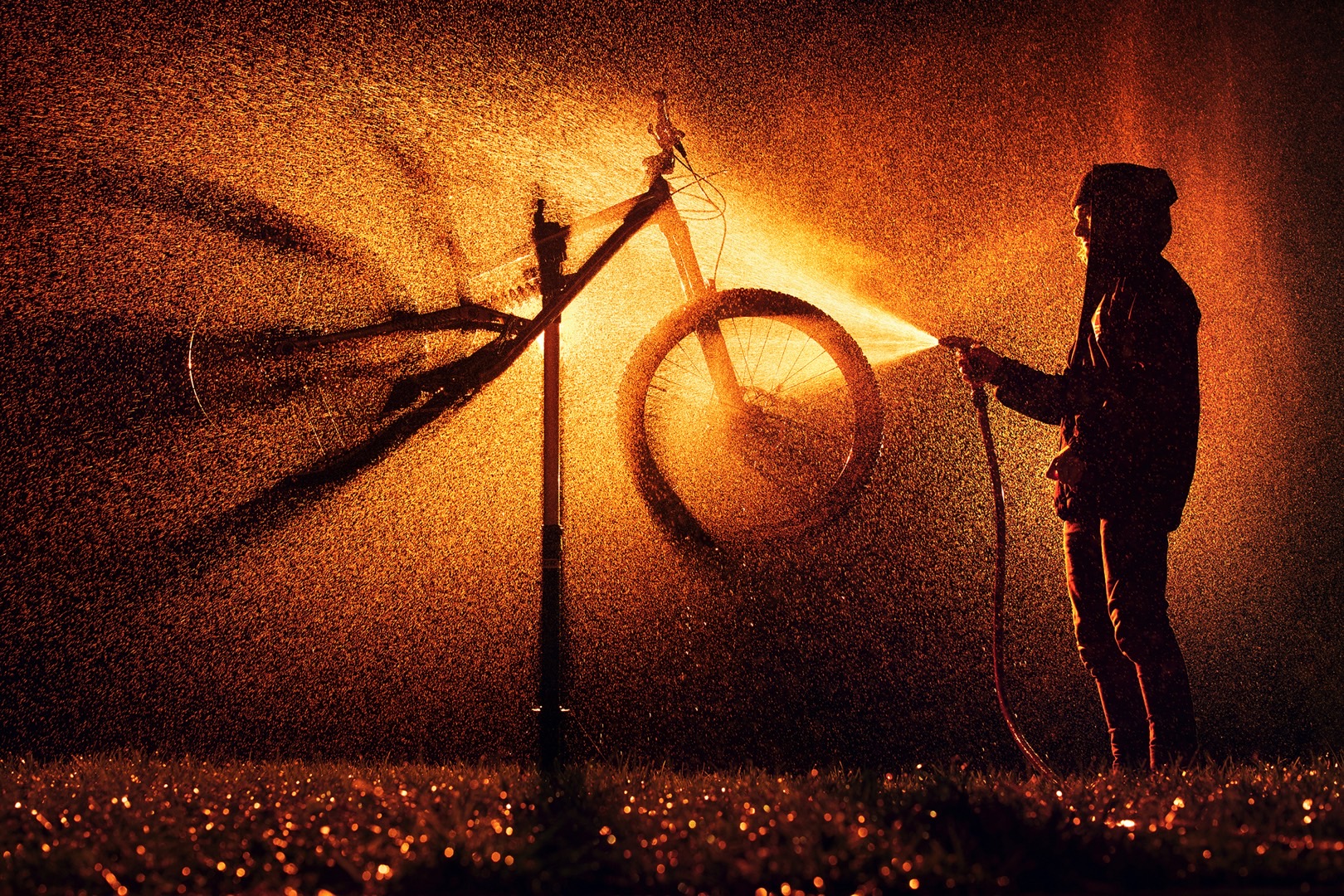 When we talk about mountain biking photography, we often see action pictures. While action is great to shoot, I love documenting what’s happening before and after the ride as well. In this photo, Paul was washing his bike under the rain in front of his house. We all know that feeling, when you’re tired from your day of riding in bad weather conditions, and you still have to clean your bike before you can even take a shower yourself. I used two flashes with orange gels to create this backlight effect and color.