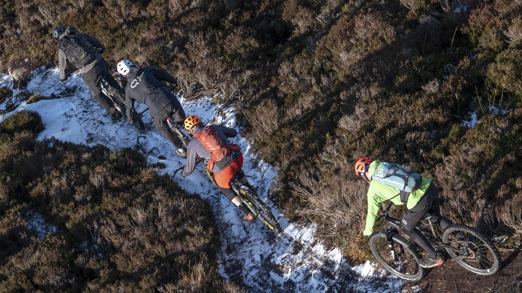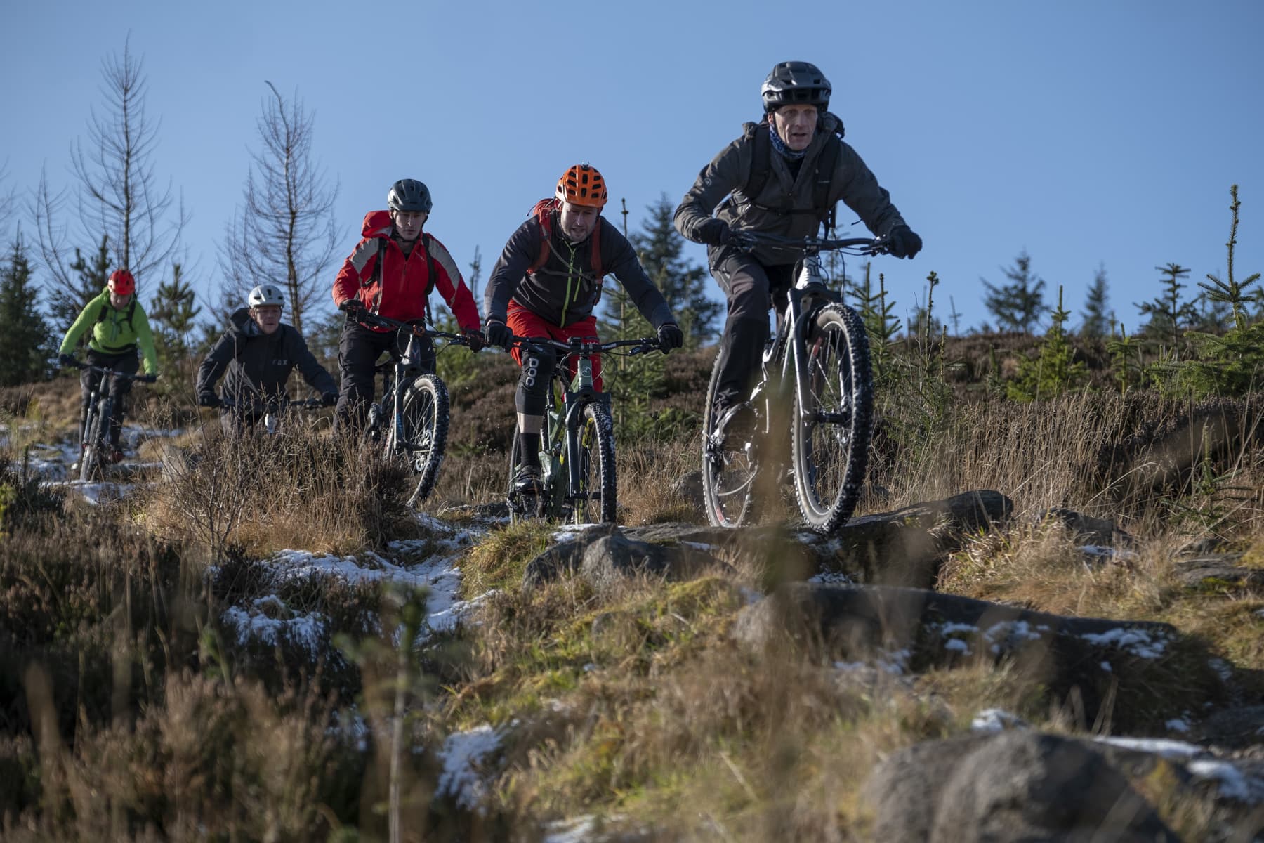 We’re going to repeat the final climb up to Ice Queen, but we’re now 60m below where we last started it from. This means we’ve got another few minutes of pain to get our altitude back, then the final climb to Ice Queen and this time we continue on the path and on to our first short hikeabike. Cresting the ridge below Millstone, bikes still on our backs, the view ahead explodes in front of us. The overnight snow has mostly been dispersed by the sun and the brisk wind. The powdery flakes have clung to the paths cowering below the height of the heather, highlighting them across the landscape. A quick regroup, drop saddles and a load of gears, and we’re off across a fast, open piece of trail. There’s solid bedrock, then built path, but it’s covered in a few centimetres of snow, so I’m holding back a bit. We hit the next challenge – sleepers, lots of them. Apart from the indestructible granite, the landscape here is delicate. Too many boots, or wheels for that matter, have caused some trails to become rutted, boggy messes. This particular trail has short sections reinforced with parallel railway sleepers, covered in chicken-wire and, today, snow. We all have to focus to get through it intact, before the trail turns sharp left at a loose corner, then presents a series of large steps heading down to the end of the descent. Some are easily despatched with clear landing spots, others spit you straight at the next drop before you have a chance to recover so it’s with some relief that we all make it down in one piece.