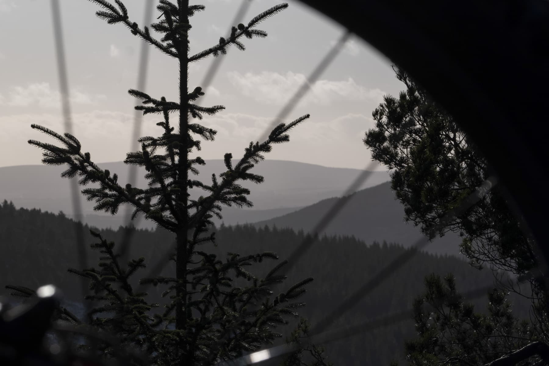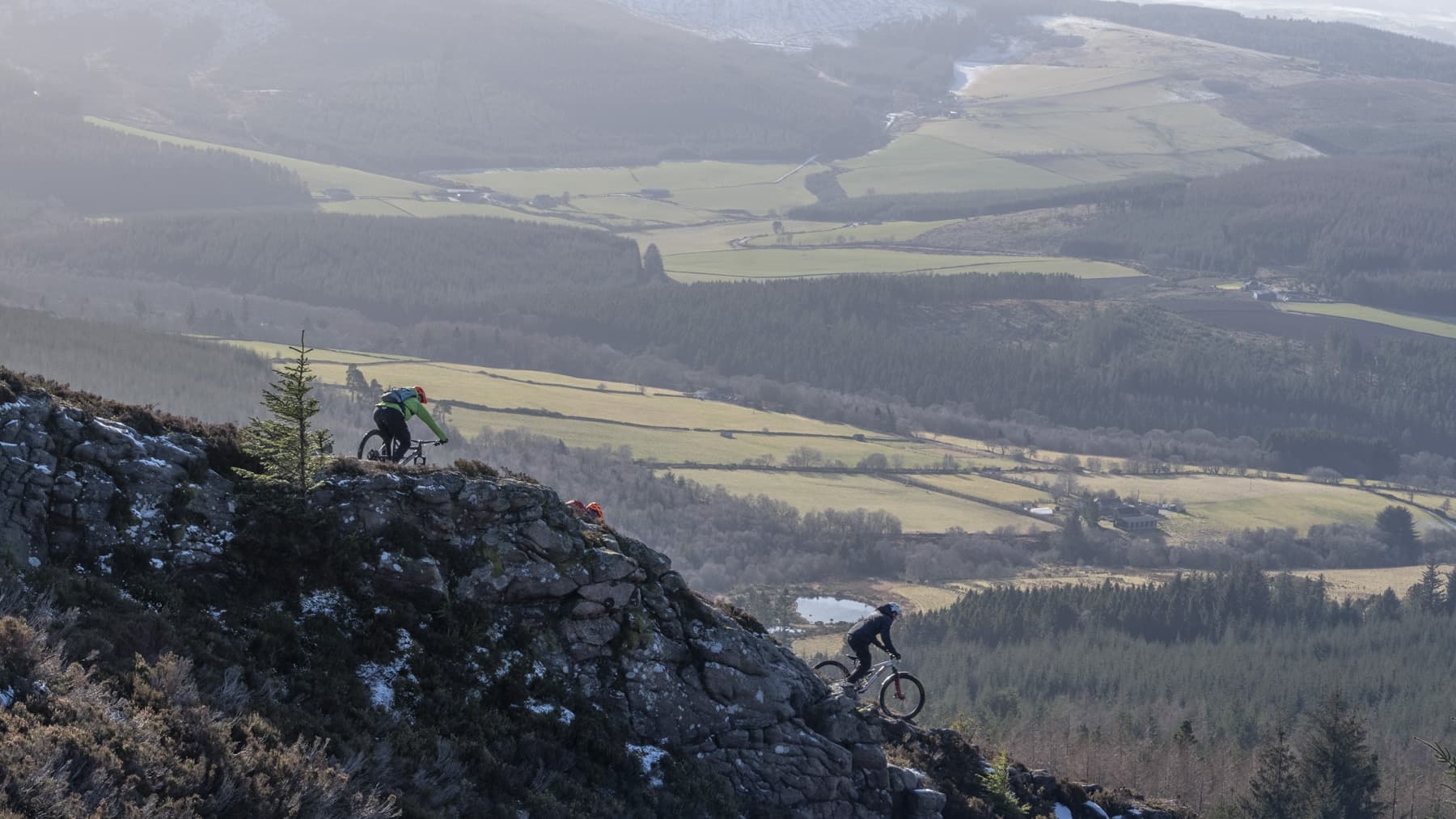 Maiden Causeway has long been a very popular trail on Bennachie with its current-day granite armour giving it resilience to boots and wheels, but also a strong likelihood of causing a pinch flat or two. Tight, technical switchbacks at first, but then the flow starts. It’s never ‘full gas’ though, as there’s too much going on, and there’s still ice lurking in the shadows. Just as I catch a glimpse of the rapidly approaching cairn marking the exit onto the next more meandering trail down to an old quarry, I mistime a bunnyhop over a big, solid water bar. With that sickening thud and hiss, the back of the bike lets me know I didn’t get away with it. Damn! A few minutes later, pumps are packed away and we’re rolling again, this time down through widely-spaced Scots pines allowing the trail to flow gently to the final steep drop and slide into an old, abandoned quarry and out onto the homebound trail as thoughts turn to warmer toes and the chance of some late lunch.
