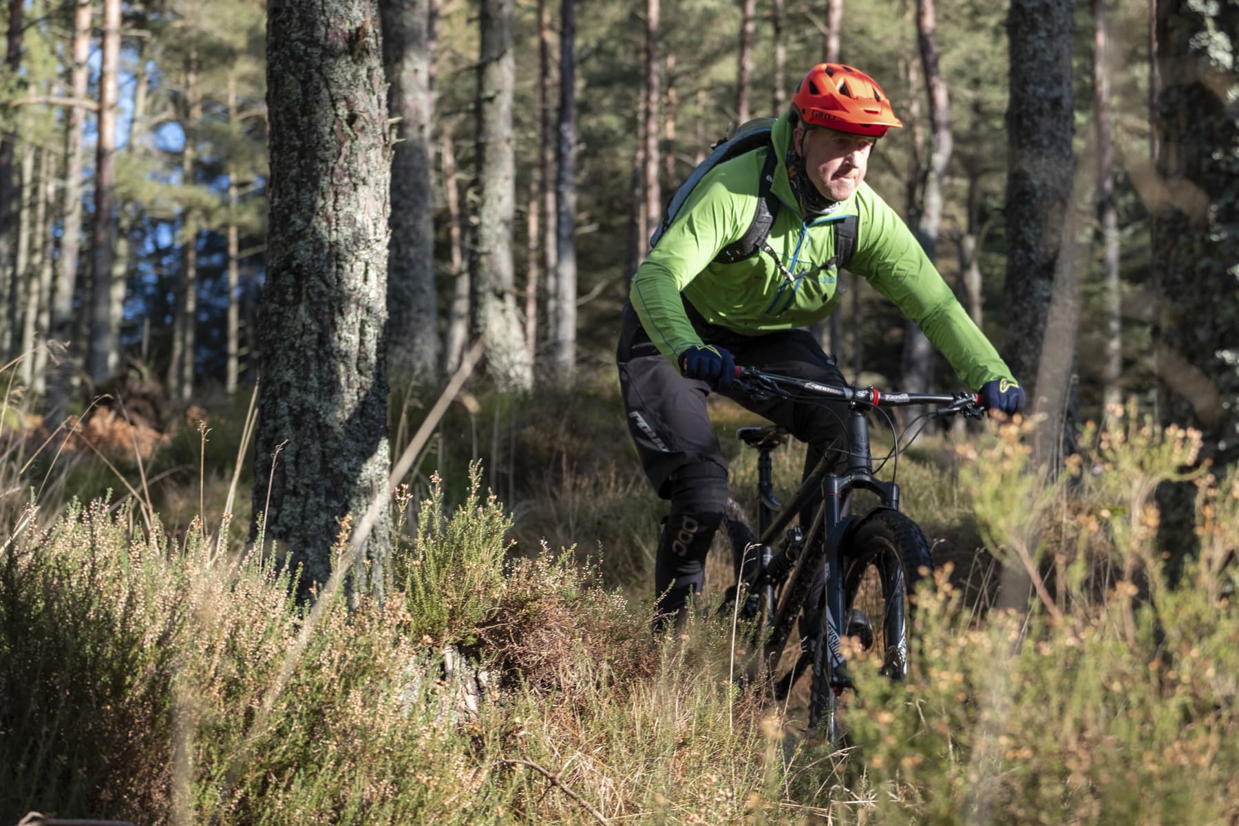 Pre-ride chat is kept brief. Our attention is focused on getting moving as rapidly as we can. Standing in the lingering shadows of mature Scots pines in the middle of February is no spot to loiter. Nippy toes and fingers warm quickly though, as the first part of our day is spent gaining altitude; a gentle climb at first, then it ramps up as we pedal past the old, abandoned settlement, known locally as the Colony. This was a home to squatters from the beginning of the 19th century until 1939 when the final resident died. Following the main signposted path towards Mither Tap the smooth track gives way to more broken track, interspersed with worn, polished roots, and later granite steps and blocks, massively grippy – depending on the capacity of your legs and lungs. Climbing higher into the immaculate pine forest, our first objective is in sight – a faint piece of singletrack leading off to the left of the main trail, taking us to our first descent, The Line.