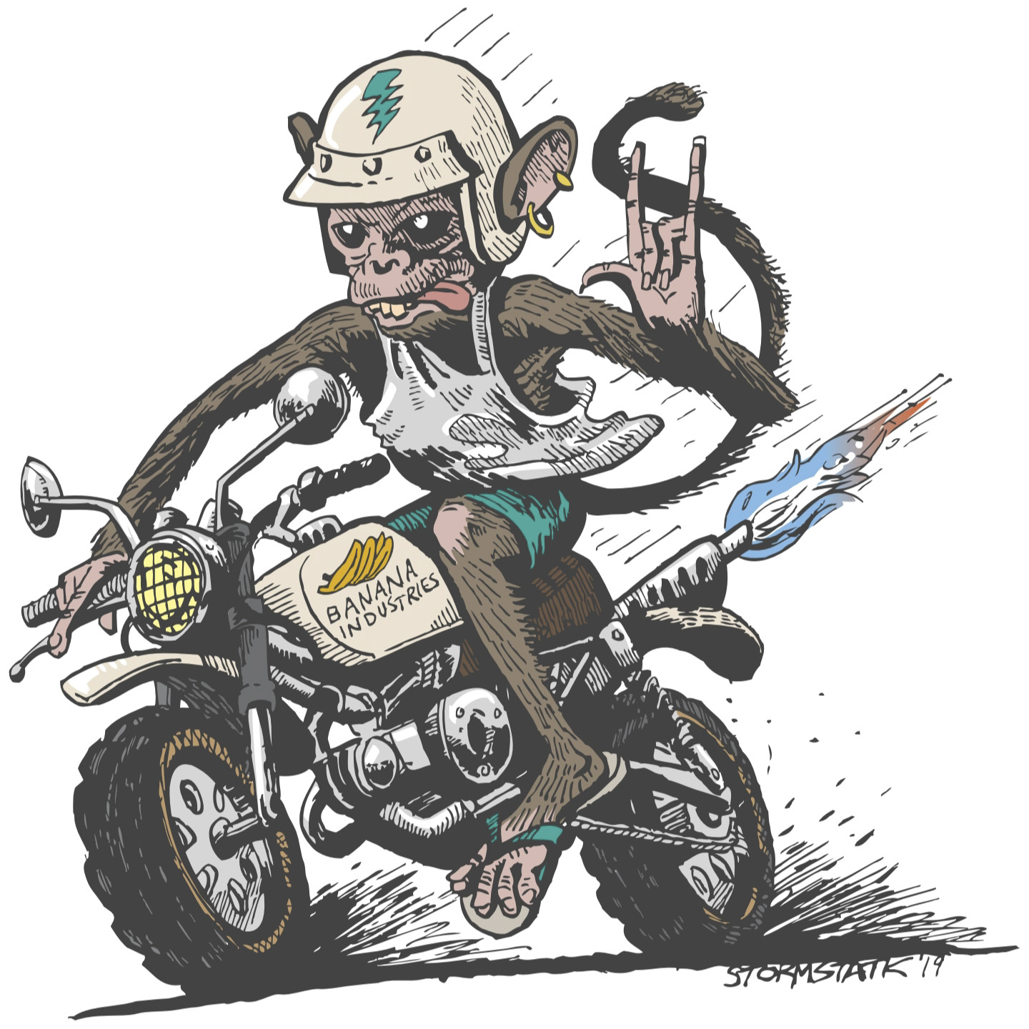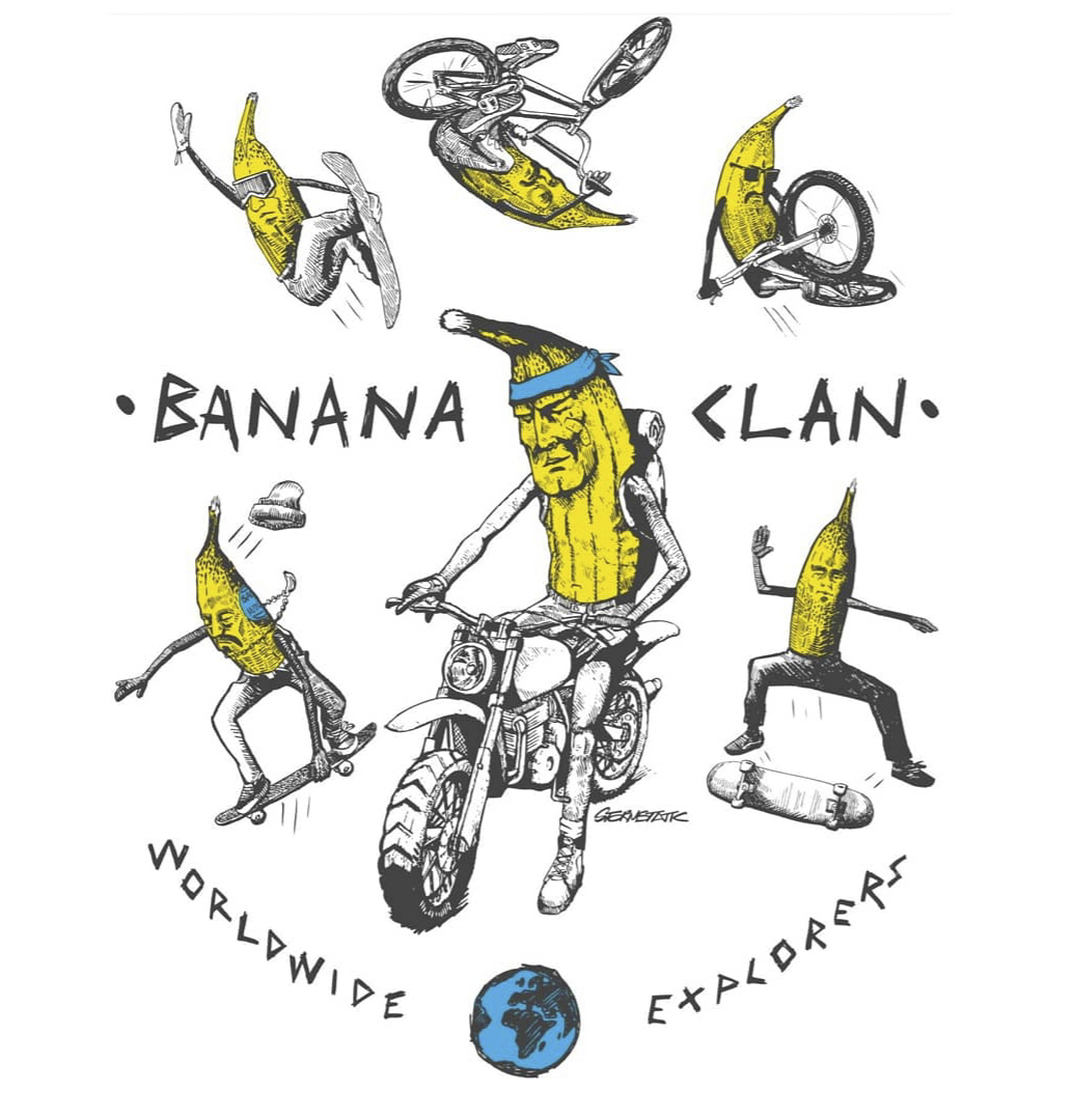 I’ve worked for years as a graphic designer for a few companies including an outdoor brand for 7 years working on product development and graphics. While I was there I did illustrations for T-shirts that sold well. Then over the last two years I really pushed my illustration artwork with a view to doing it full time and was lucky to be picked up by Fabio and Tom at Banana Industries last year. They took me under their wing and believed in the artwork. You could see more of my work at Banana Industries where I have my own collab range and on my Instagram. I have also recently completed work for Sixth Element wheels, Bark & Ride Sports, The Loam Wolf and Revolution Bike Park.