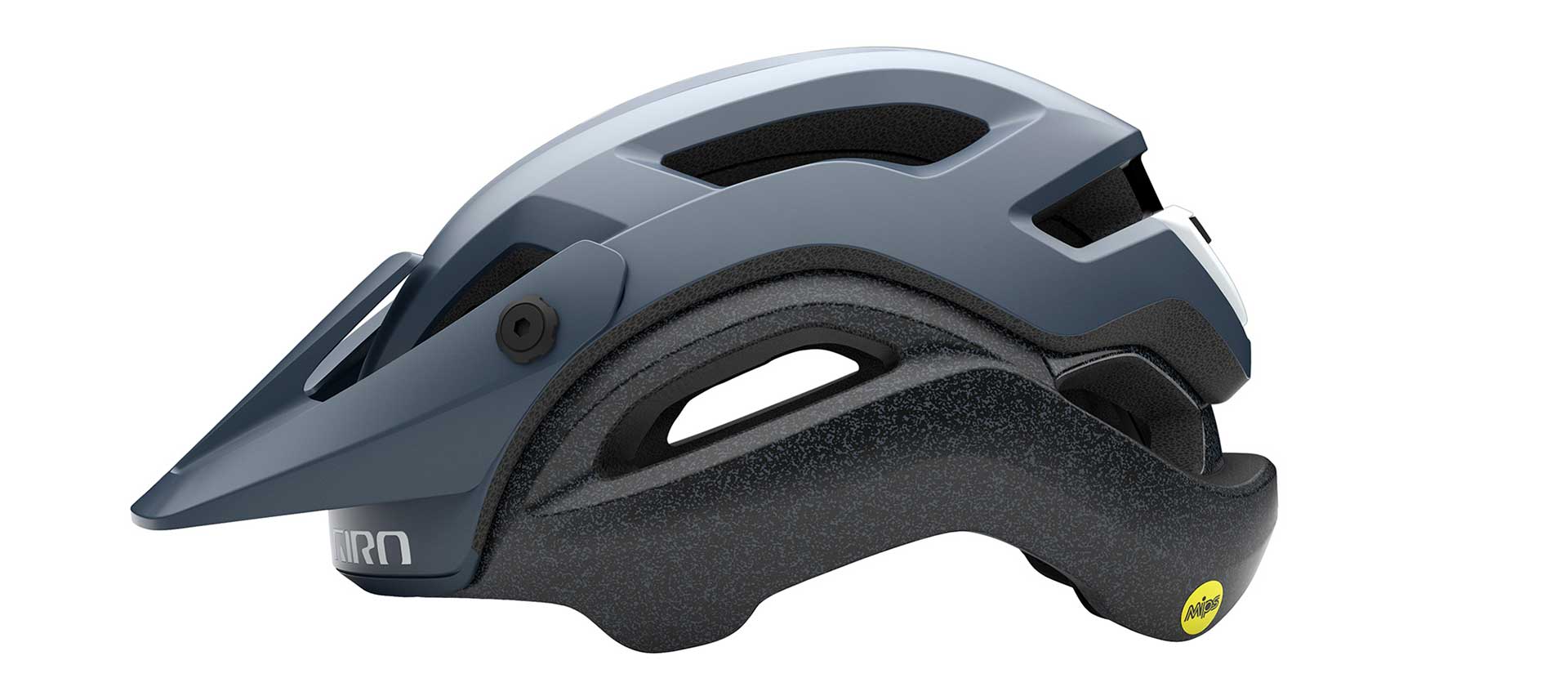 As we said at the start, Giro’s Manifest Spherical has a lot of mountain bike specific features. The peak has two easy adjust thumbscrews to govern peak angle and tightness. This adjustment is non-indented as Giro found that having clicks on your peak angle just means you end up with a peak on the wonk if it gets knocked. Here the peak always moves parallel. And is there room for goggles? Yes, it’s been made with goggles in mind. There is just enough room to fit standard mountain bike goggles under the peak without having to run them backwards or whatever. Giro sees this as more of a trail helmet than an enduro one, so goggle fit is just enough for occasional use. There’s also a grippy silicon pad out the back of the helmet to hold your goggle strap in place. (Just at the top of the top blue section below – and just above that are two grey shiny patches which are retro-reflective decals that appear black but which ‘pop’ under headlights.
