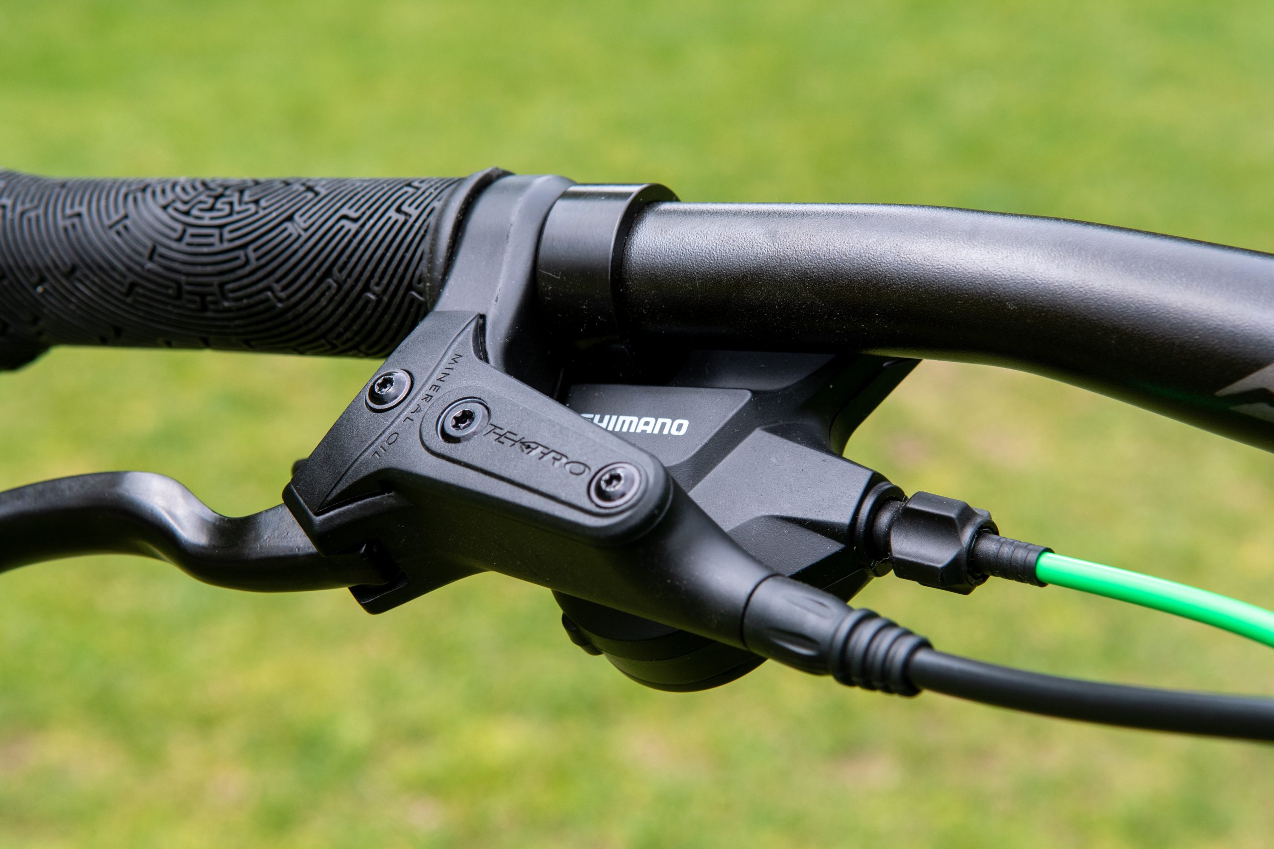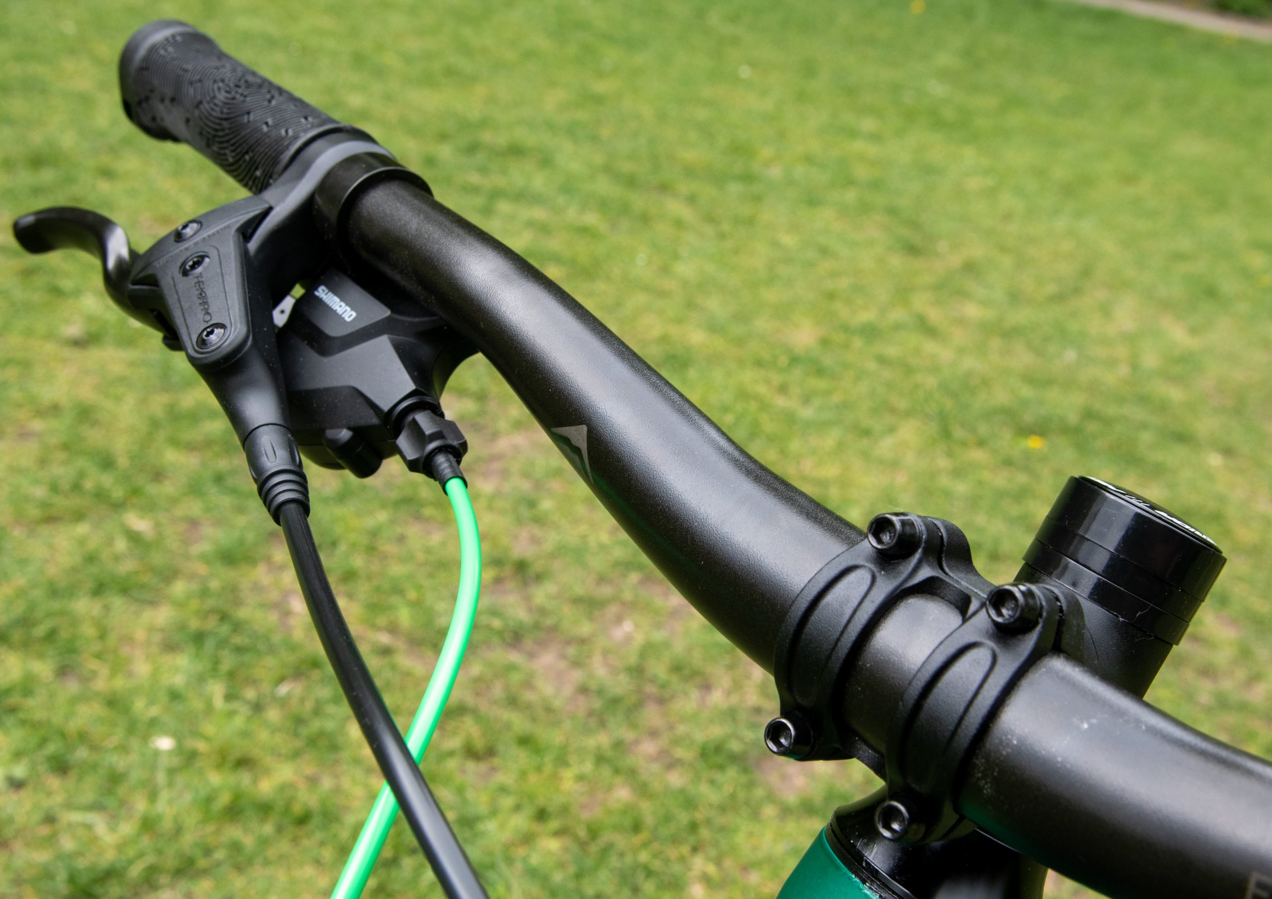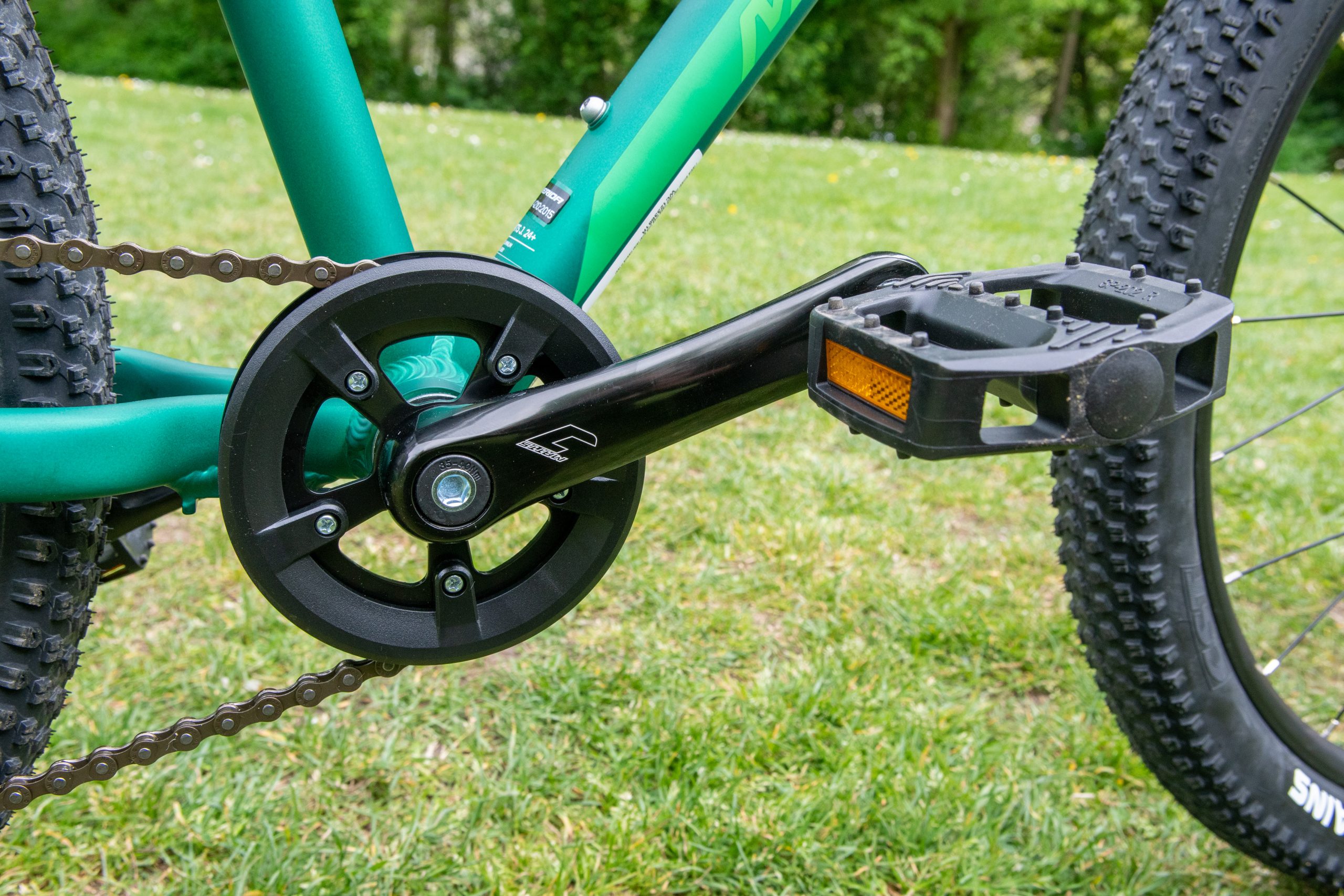 If you cast your eye over the Junior 24+, you’d be forgiven for thinking it was a much bigger machine… This is less of a kids bike than a scaled down grown-up one. An alloy frame and fork, rendered a trifle more comfy by comparatively enormous 2.4in tyres. There’s an eight speed Sunrise cassette, 140mm cranks, a wide (comnparatively) 620mm bar with 20mm rise strapped onto a 60mm stem, and a pair of Tektro hydraulic disk brakes.