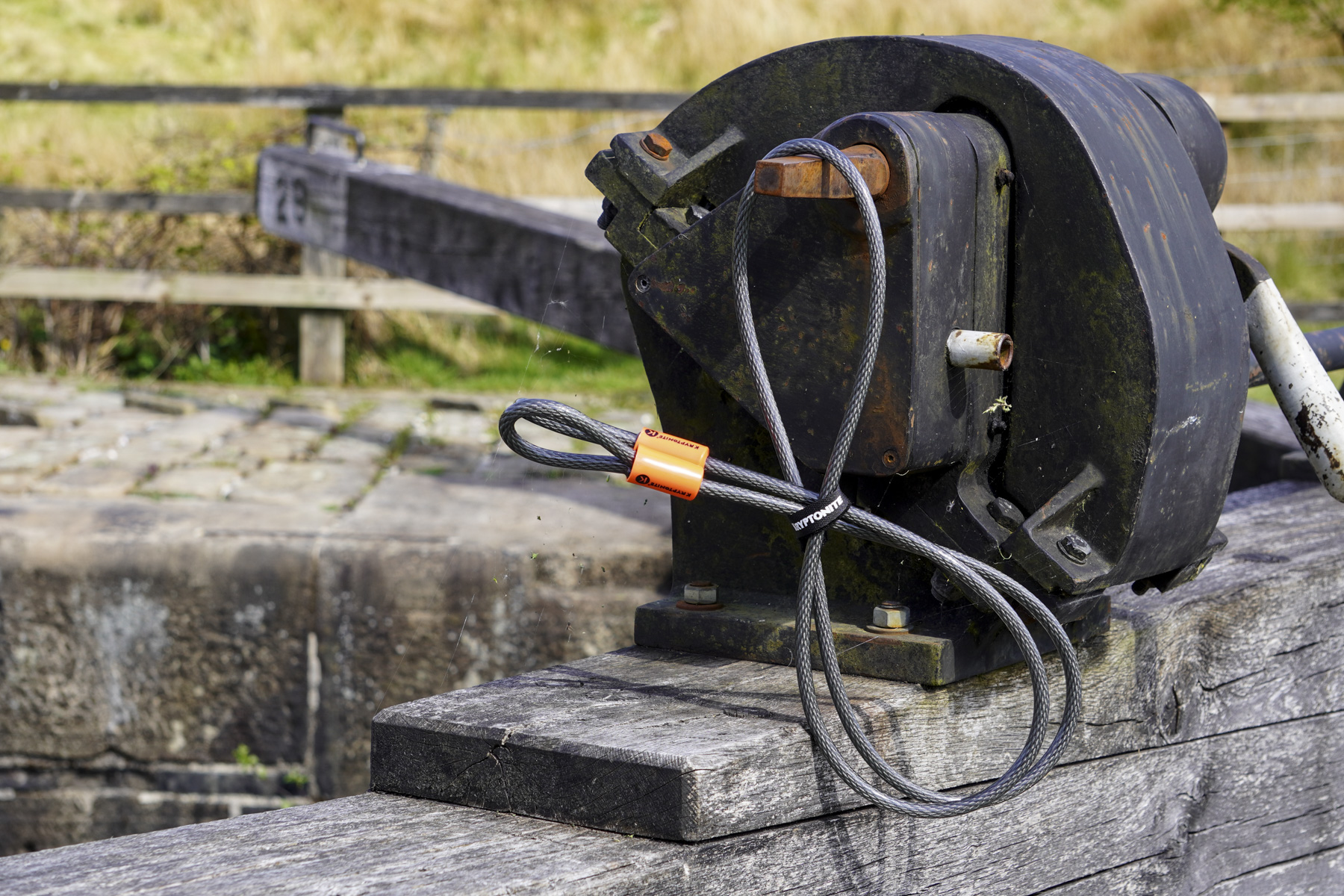 This is a tough braided steel cable for use with a D-Lock, or padlock. This particular 7ft cable is currently cuddling 5 bikes with room to spare.