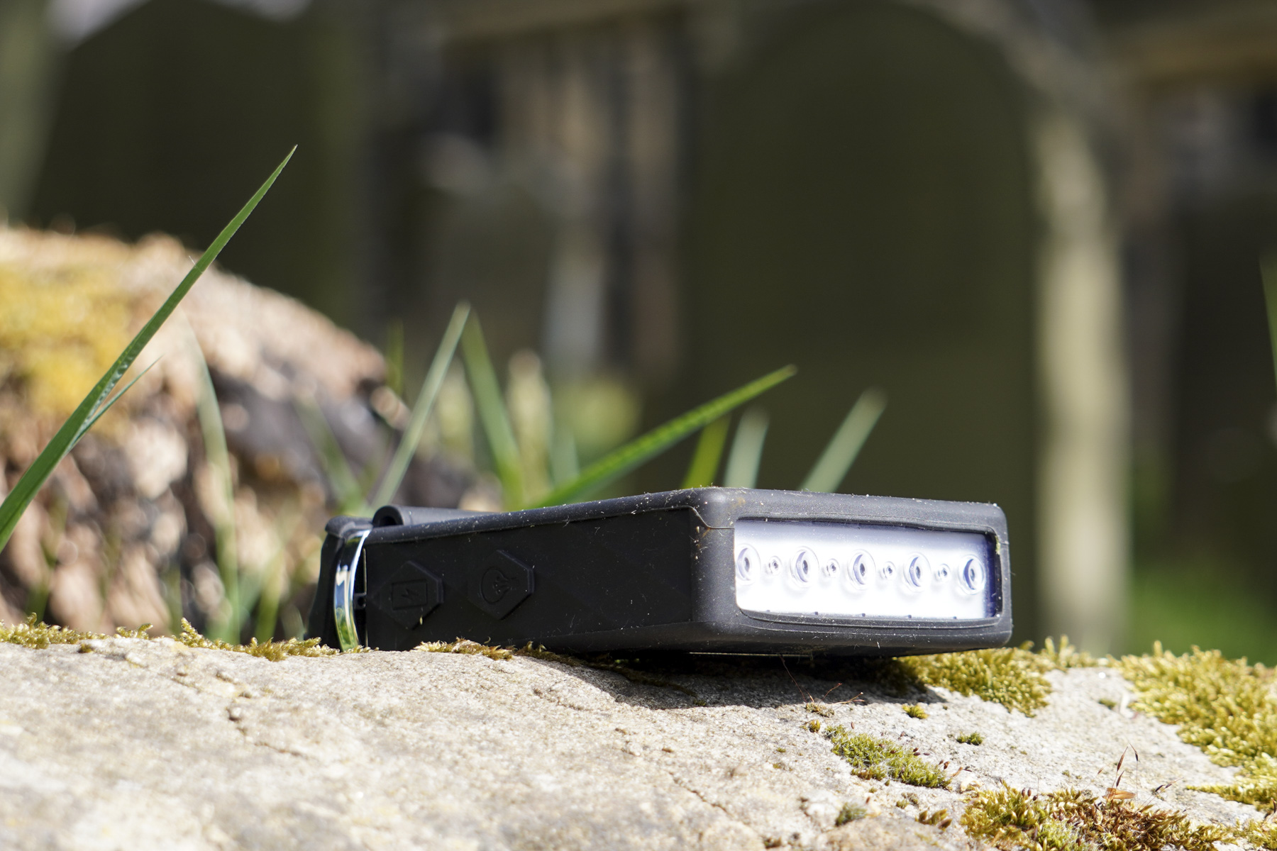 This rugged portable charger is waterproof, dirt resistant with a 12,800mAh rechargeable battery inside and a 100 lumen LED light. It conveniently has both USB and lightening sockets for charging.
