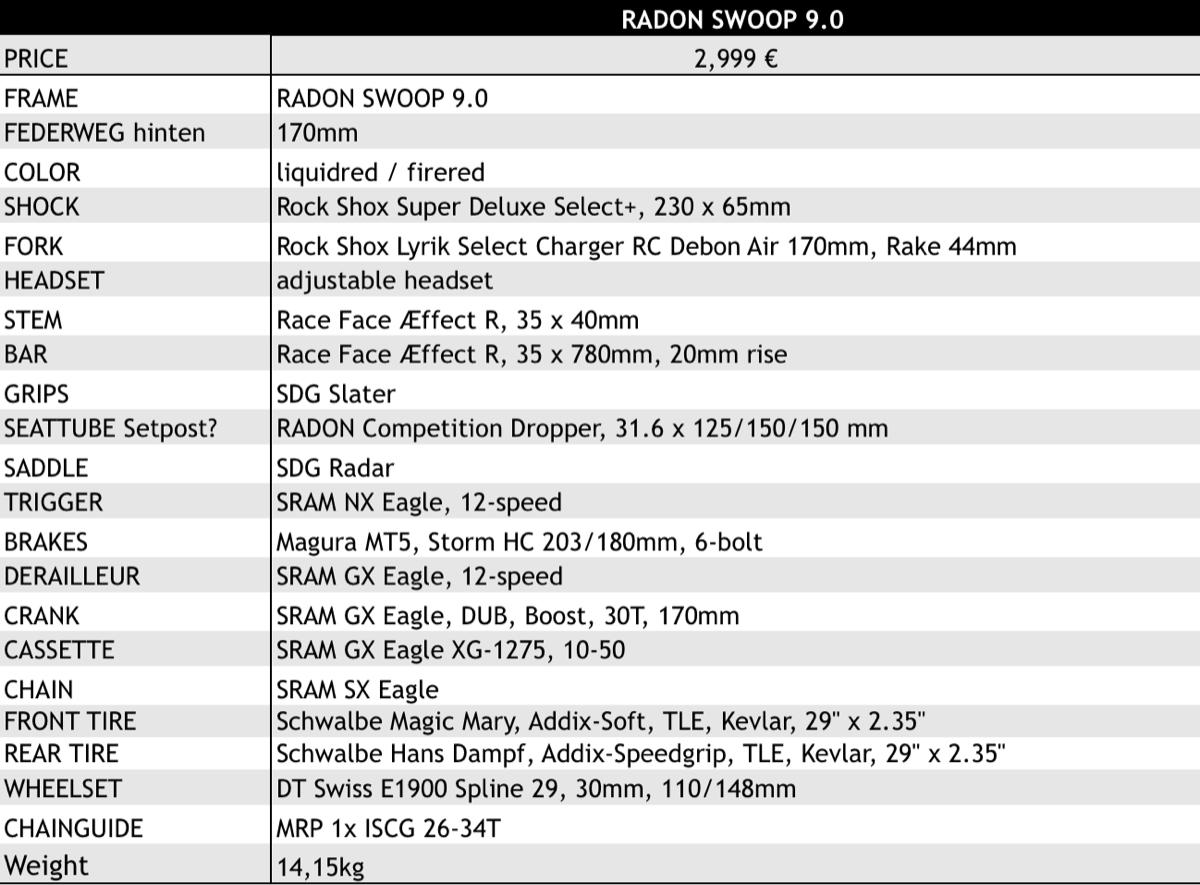 The base 9.0 model Radon Swoop comes with RockShox suspension and SRAM GX/NX Eagle drivetrain. Hopping up to 10.0 gets you Fox suspension and a Shimano SLX/XT groupset, while going all in on the 10.0 HD gets you Fox Factory suspension, SRAM GX/X01 Eagle drivetrain, and SRAM Code RSC brakes. Dropper posts step up across the range too, from the own brand Radon dropper on the 9.0 to the Fox Transfer Factory on the 10.0 HD. Claimed weights are 14.15 kg for the 9.0, 14.85 for the 10.0, and 12.65 for the 10.0 HD.
